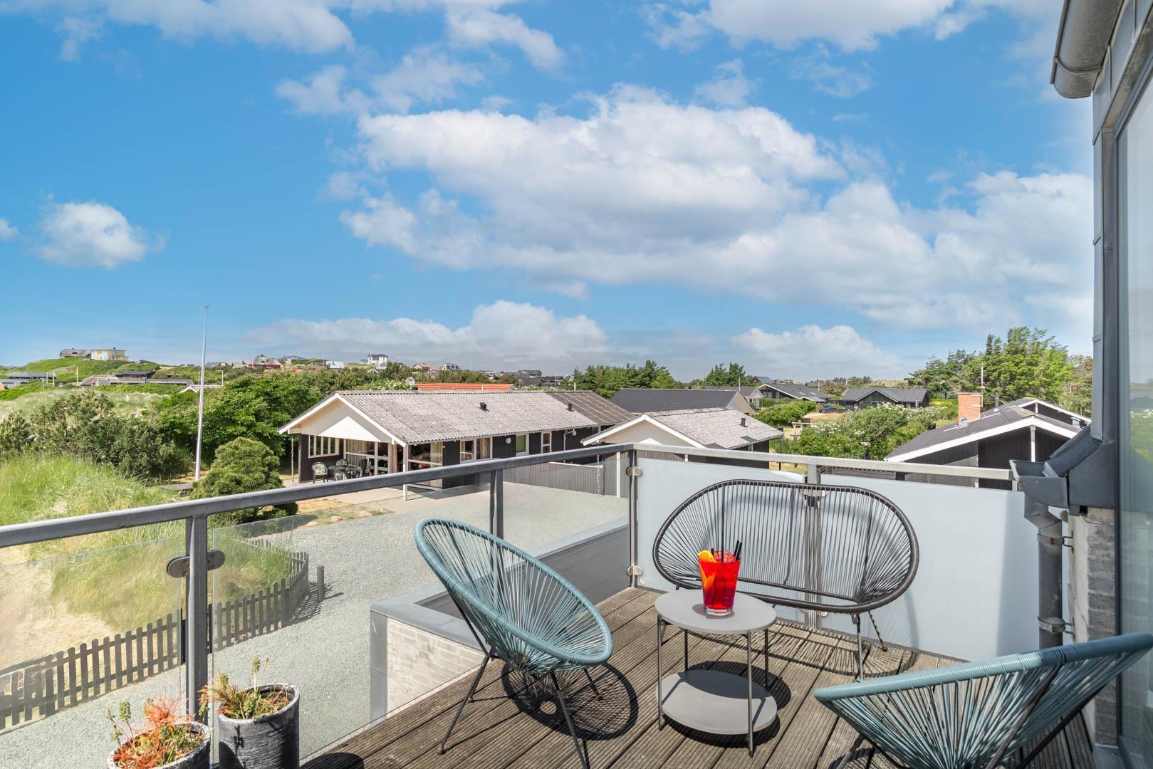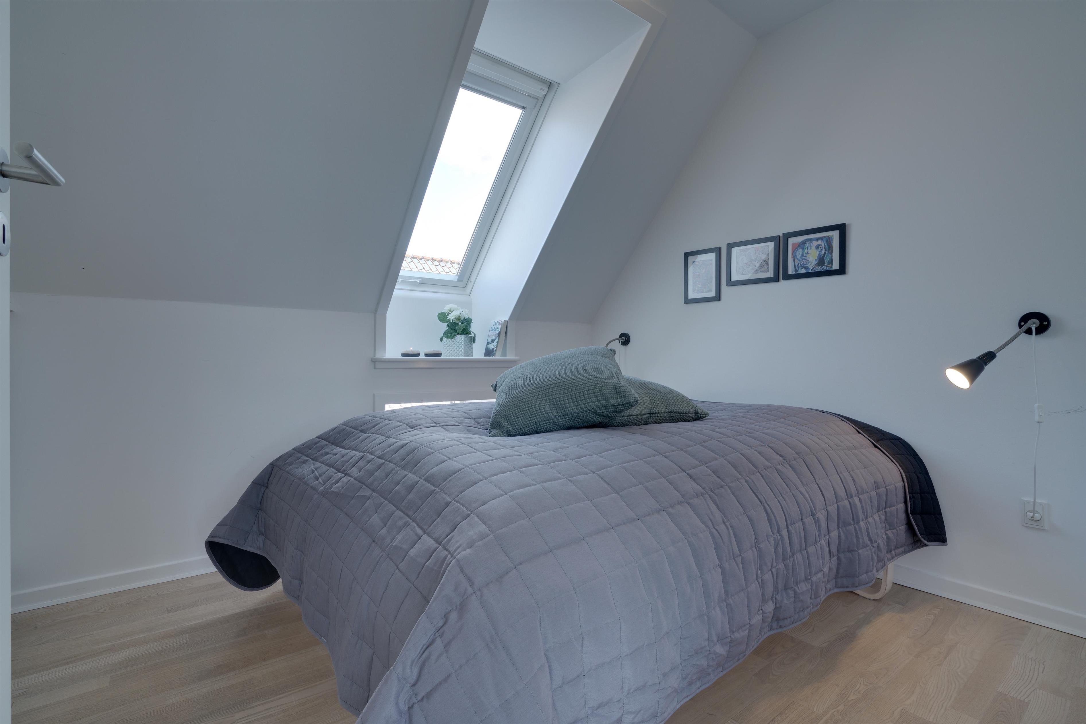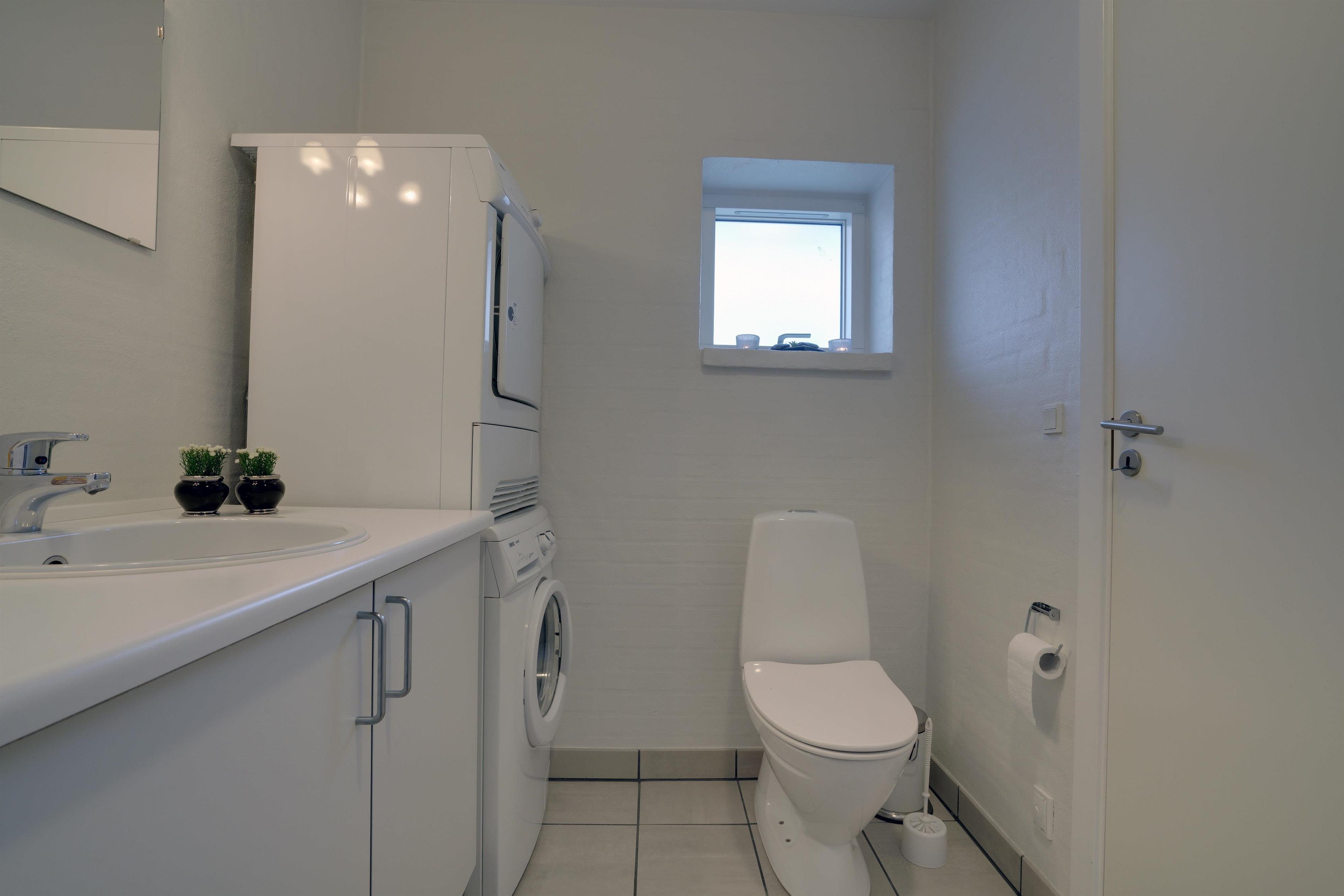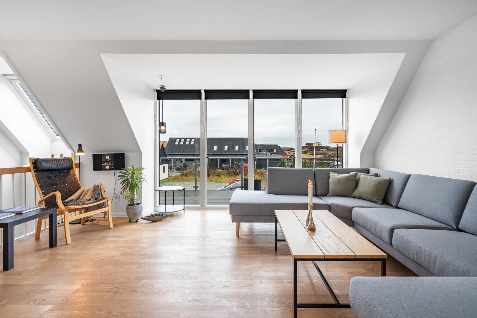 Die mit hoher Qualität gebaute Wohnung befindet sich im Herzen von Henne Strand. Die Wohnung ist überall hell und freundlich und auf einem hohen Qualitätsniveau. Die Wohnung besteht aus 2 Ebenen. In der ersten Ebene ist der Eingang, Schlafzimmer, Wohnzimmer, Bad und eine geschützte Terrasse gegen Westen gerichtet. In der zweiten Ebene befinden sich 2 Schlafzimmer, Wohnzimmer und Balkon. In allen Zimmern sind Flachbildschirme vorhanden. Mit Warmepumpe. Abstellraum für Fahrräder beim Carport.