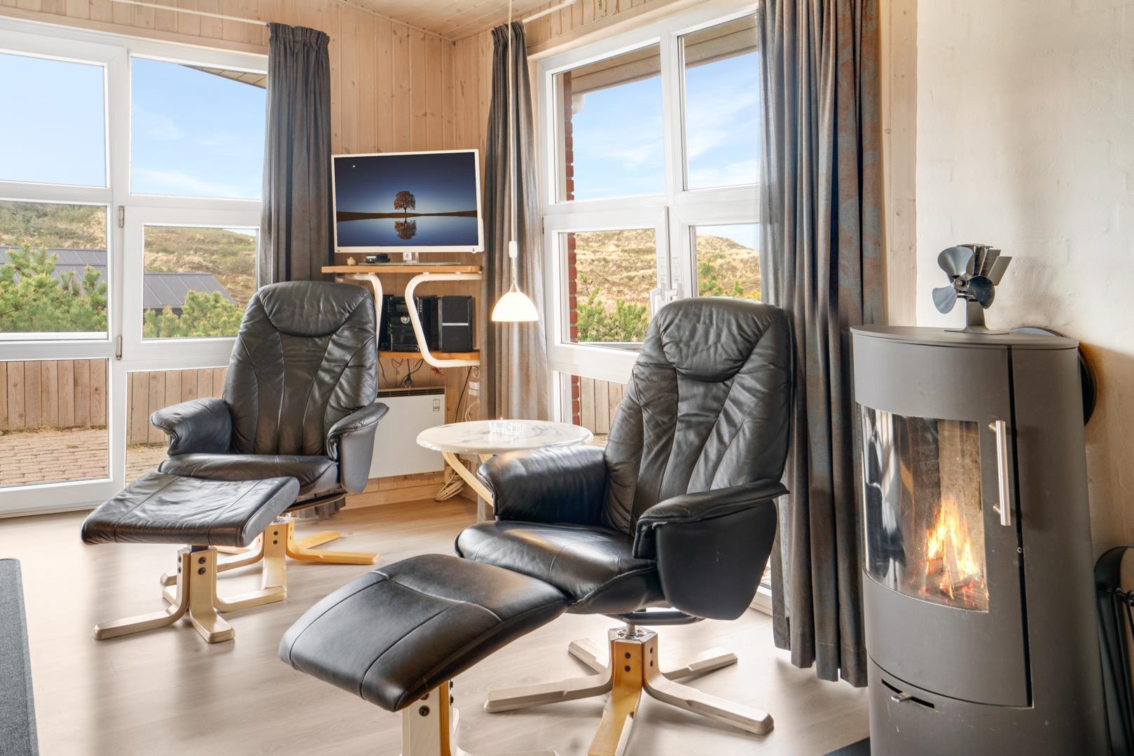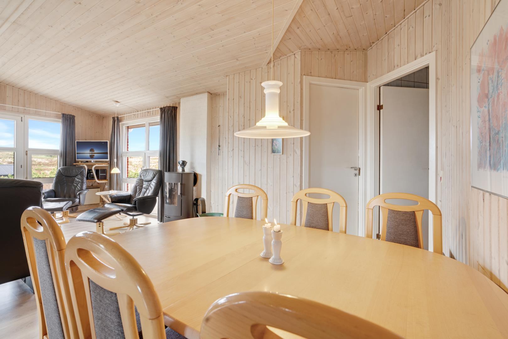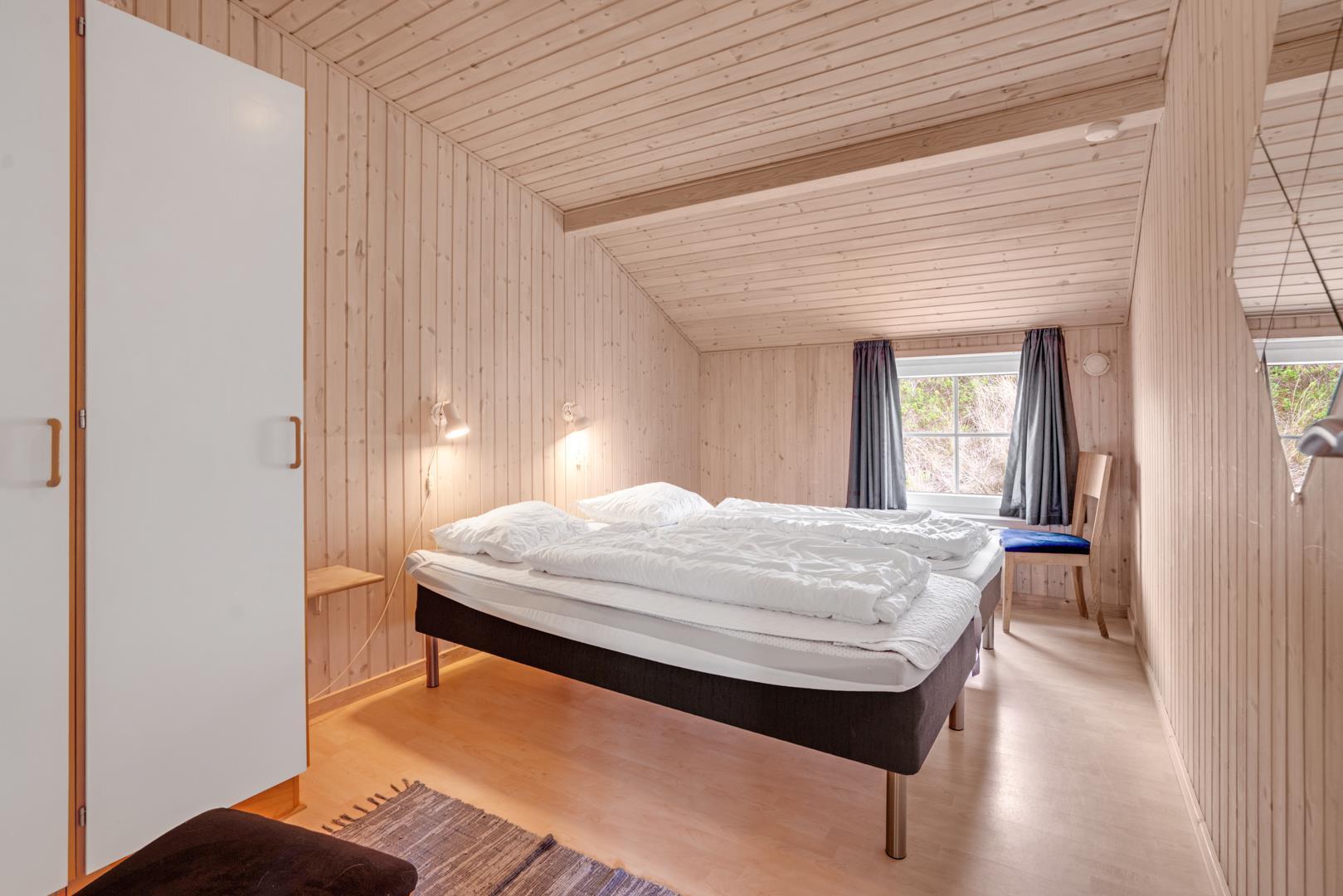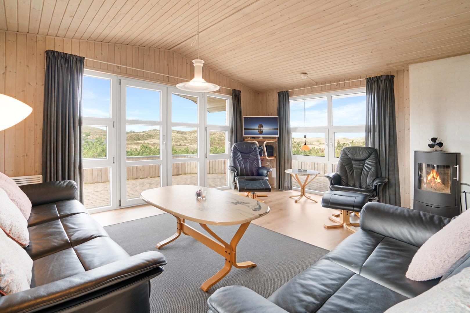 Auf einem prachtvollen, geschützten Dünengrund liegt dieses schönes Ferienhaus. Vom gemütlichen Wohnraum, der mit der Küche kombiniert ist, kann man die schöne Aussicht über die Dünen genießen. Das Haus verfügt über mehrere Terrassen mit windgeschützten Ecken. Badezimmer mit Sauna und Whirlpool. 2 grosse Schlafzimmer mit Dobbeltbetten. Bettengrösse: Doppelbett 180x200 cm. (2 Matratzen), Doppelbett 180x200 cm. (2 Matratzen), Etagebetten 90x200 cm.