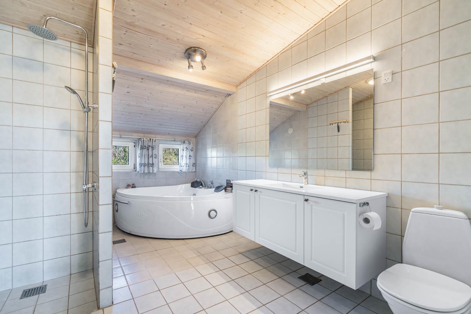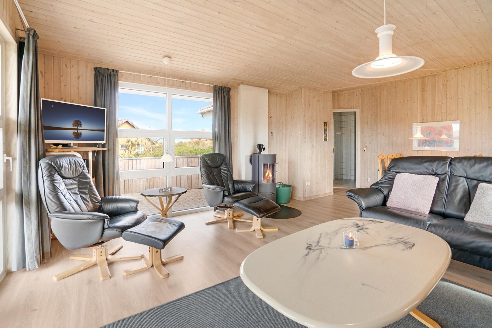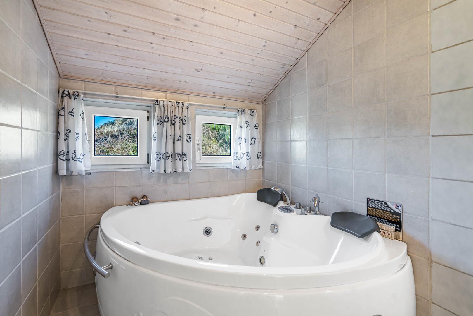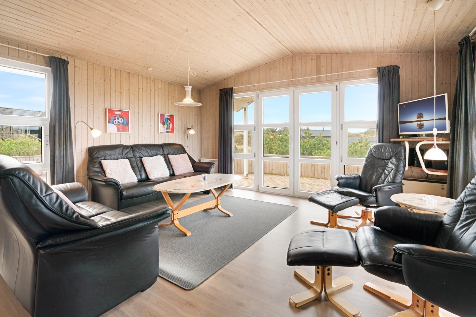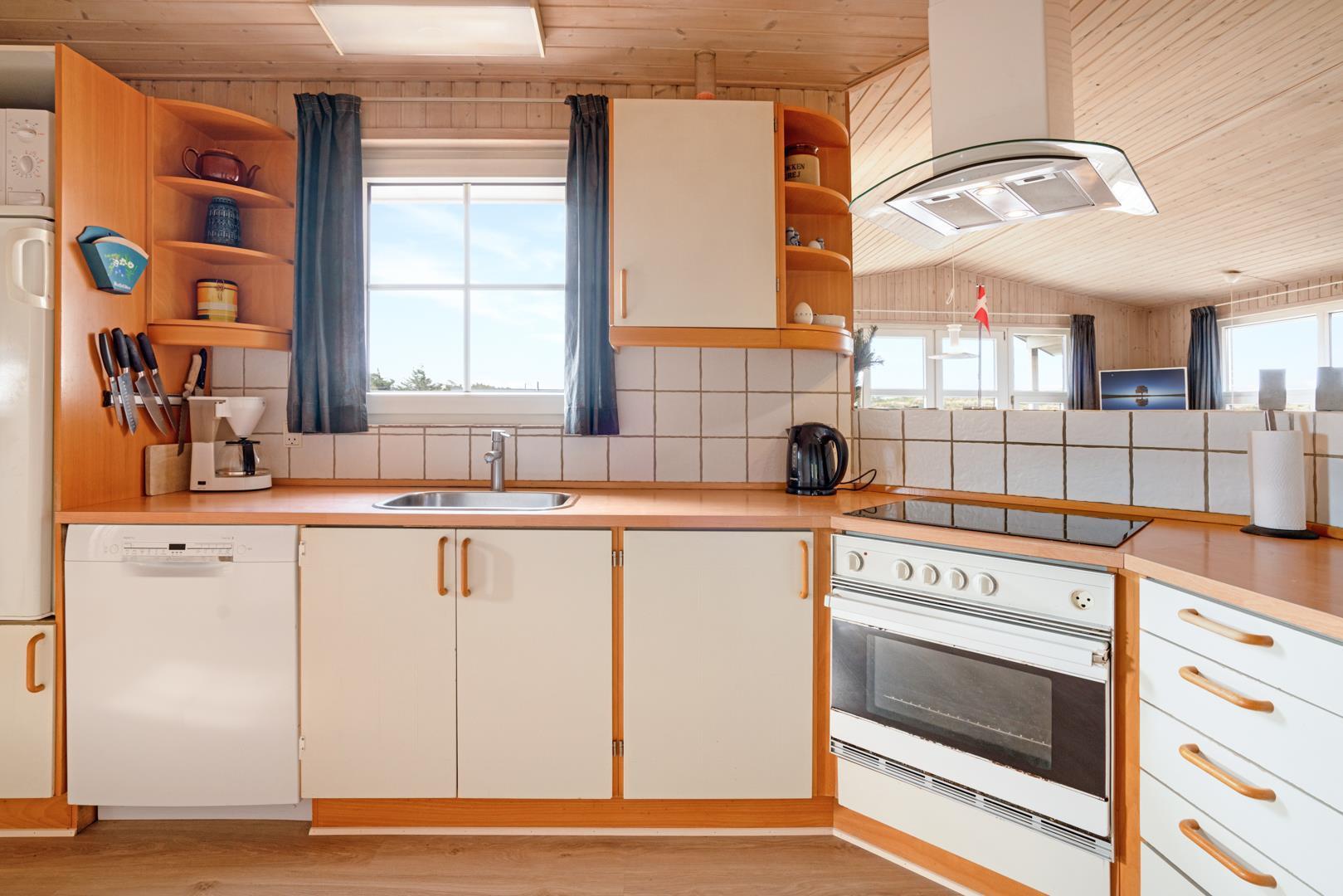 Auf einem prachtvollen, geschützten Dünengrund liegt dieses schönes Ferienhaus. Vom gemütlichen Wohnraum, der mit der Küche kombiniert ist, kann man die schöne Aussicht über die Dünen genießen. Das Haus verfügt über mehrere Terrassen mit windgeschützten Ecken. Badezimmer mit Sauna und Whirlpool. 2 grosse Schlafzimmer mit Dobbeltbetten. Bettengrösse: Doppelbett 180x200 cm. (2 Matratzen), Doppelbett 180x200 cm. (2 Matratzen), Etagebetten 90x200 cm.