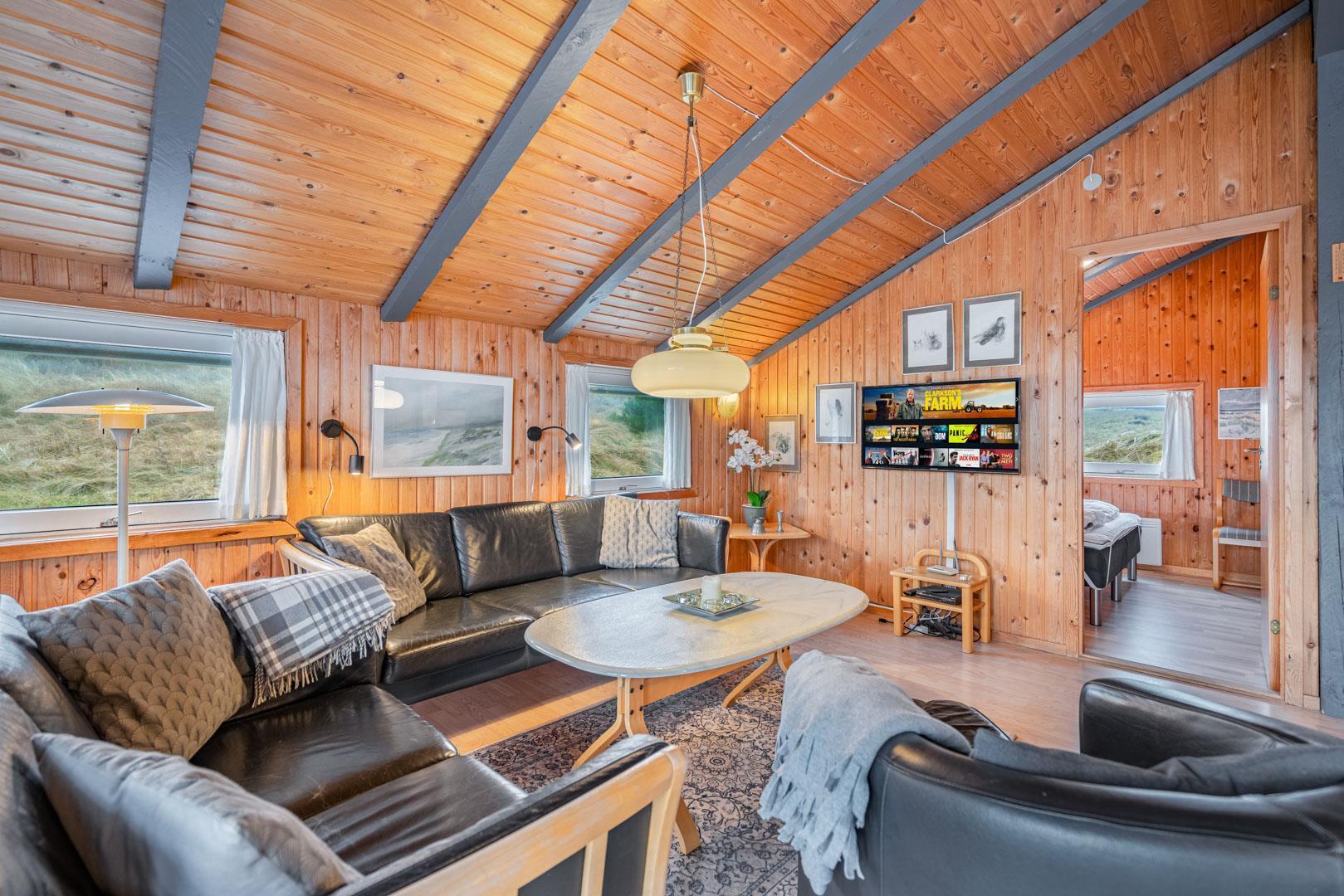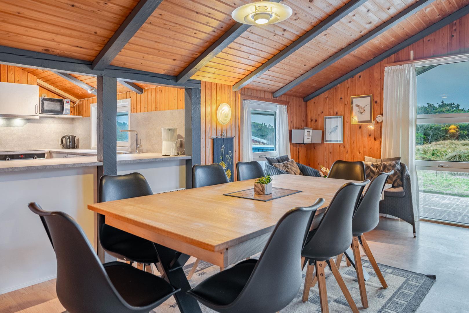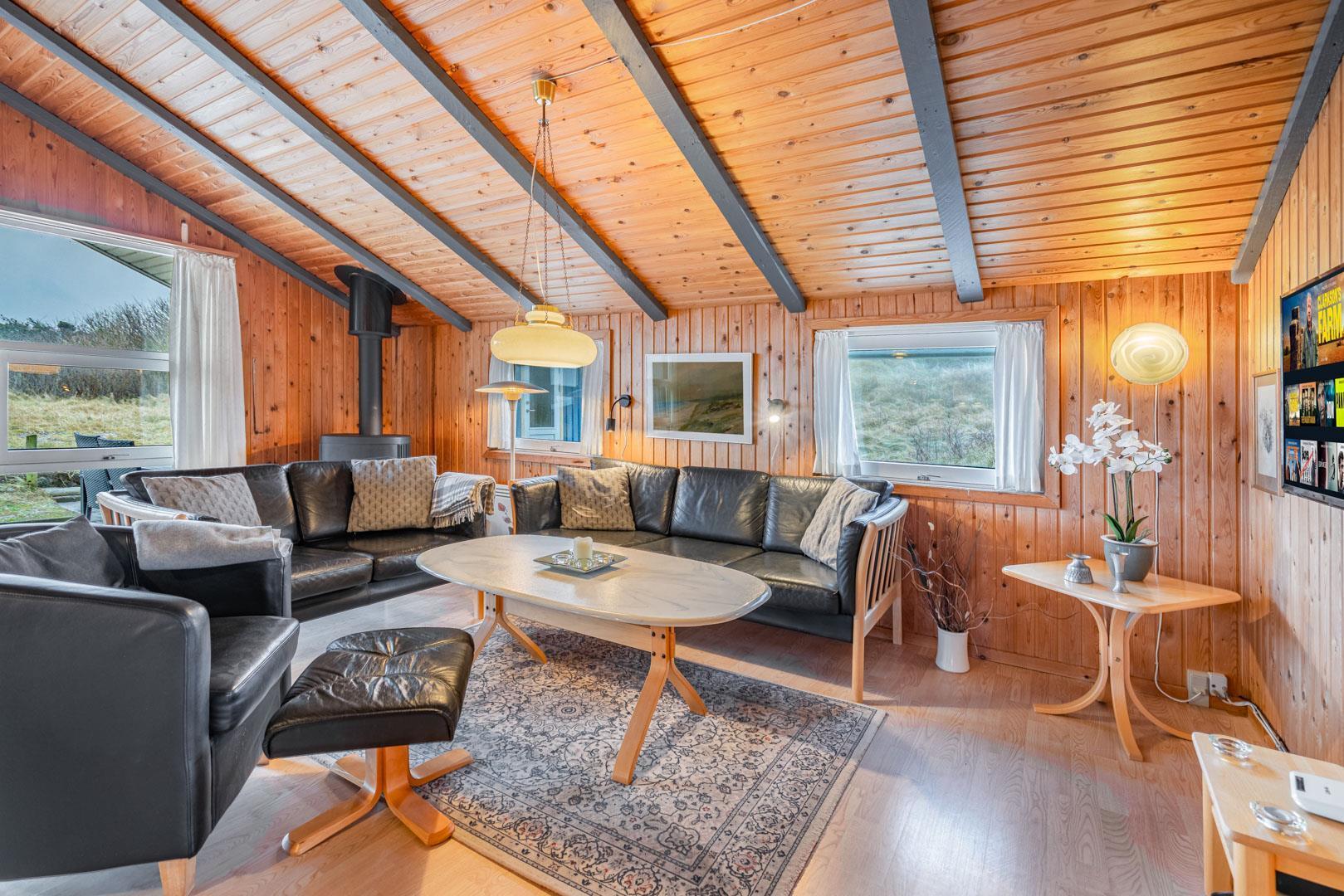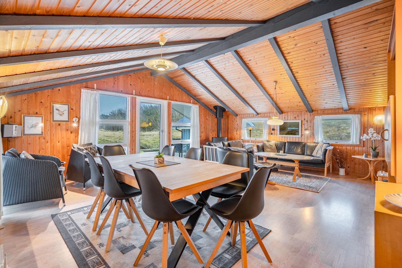 Dieses gemütliche und gepflegte Ferienhaus liegt auf einem prachtvollen, hügeligen Dünengrundstück nahe der Nordsee und dem kleinen Fluss Henne Mølle Å. In 2006 wurden die beiden Badezimmer im Haus erneuert. Eines der Bäder verfügt über einen Whirlpool und eine Sauna. Die große Küche ist mit dem geräumigen Wohnraum kombiniert. Die große, ungestörte und teilweise überdachte Terrasse, von der aus man einen tollen Blick über die Dünen hat, ist vom Wohnbereich aus zugänglich. Auf dem Grundstück befindet sich ein Nebengebäude.