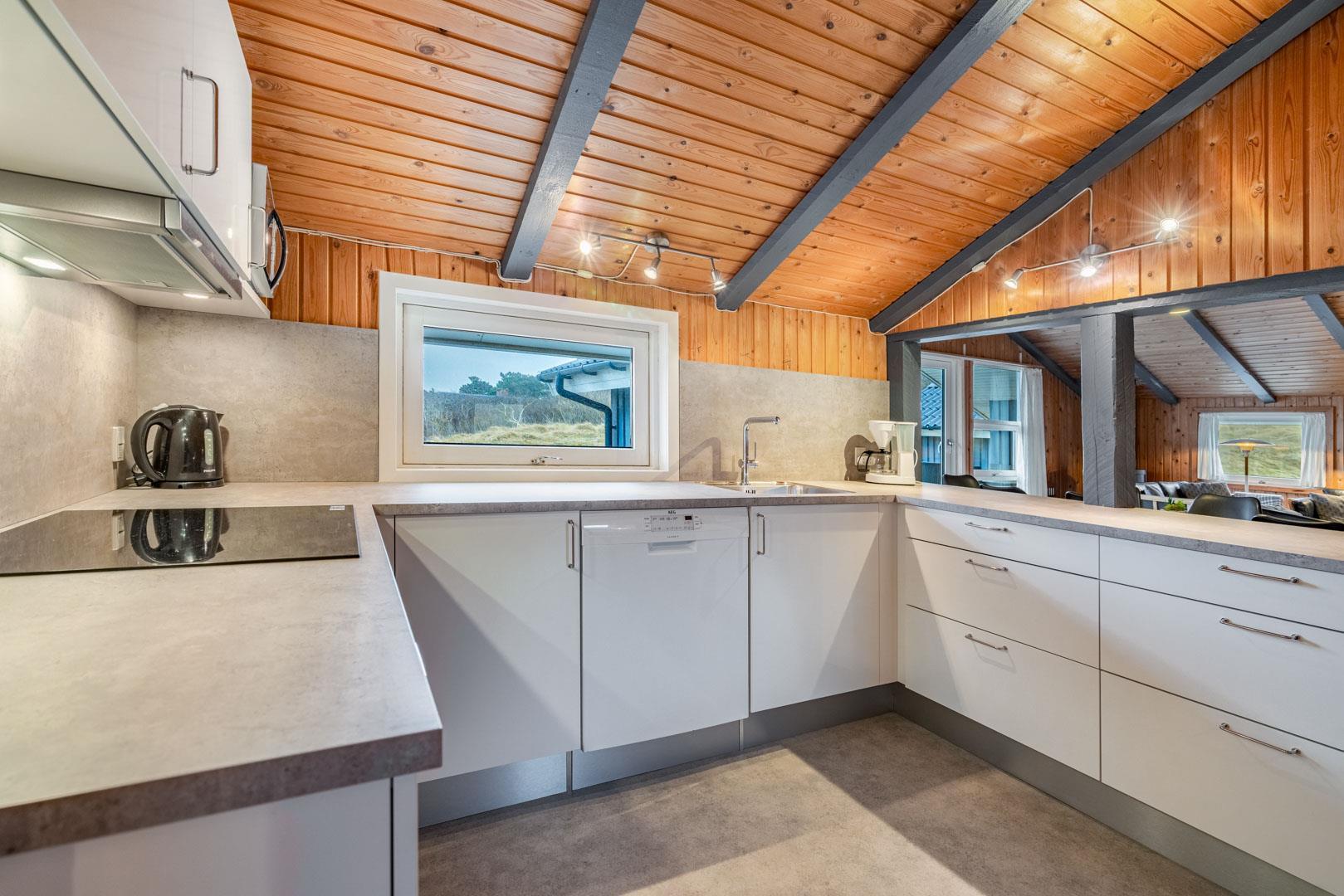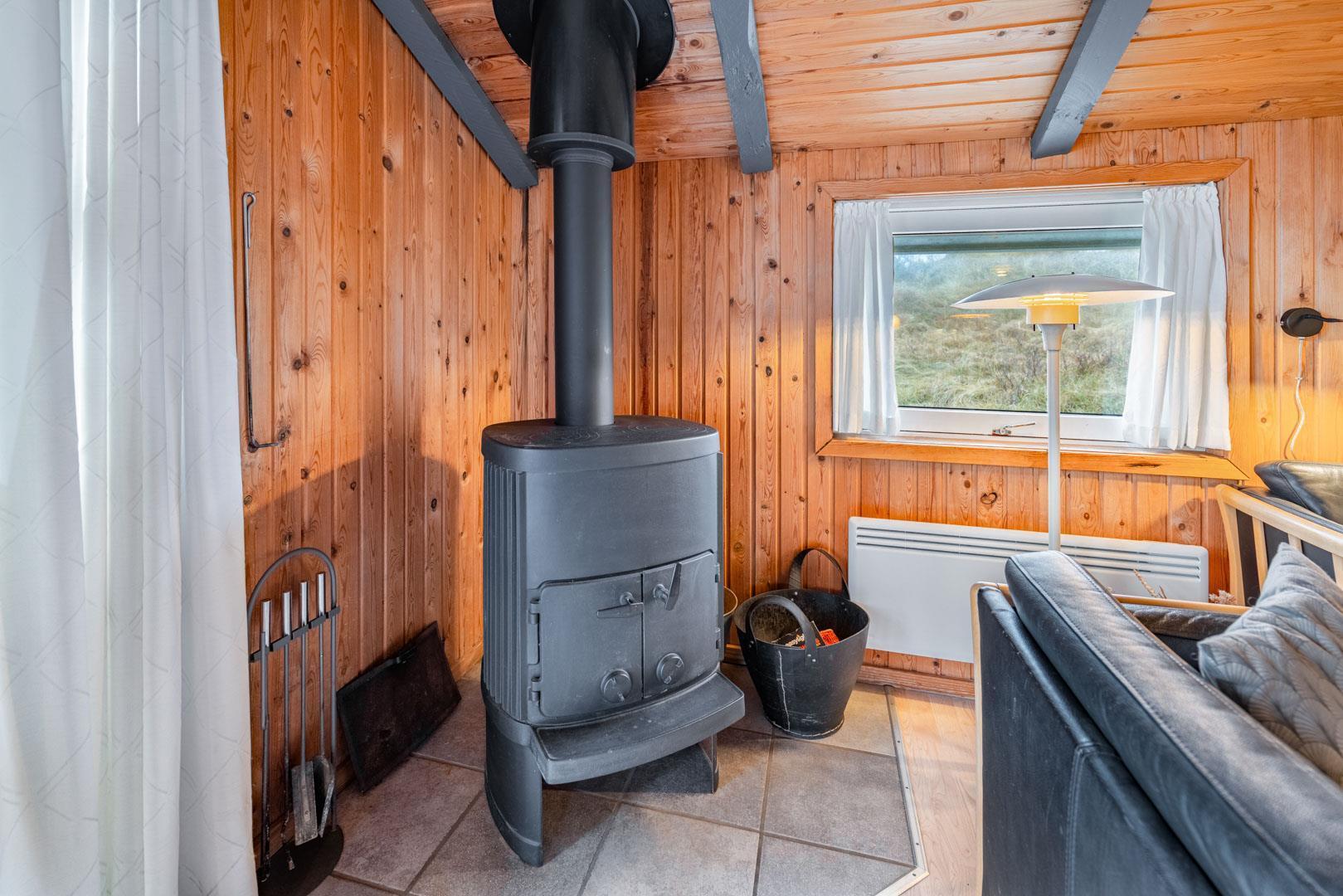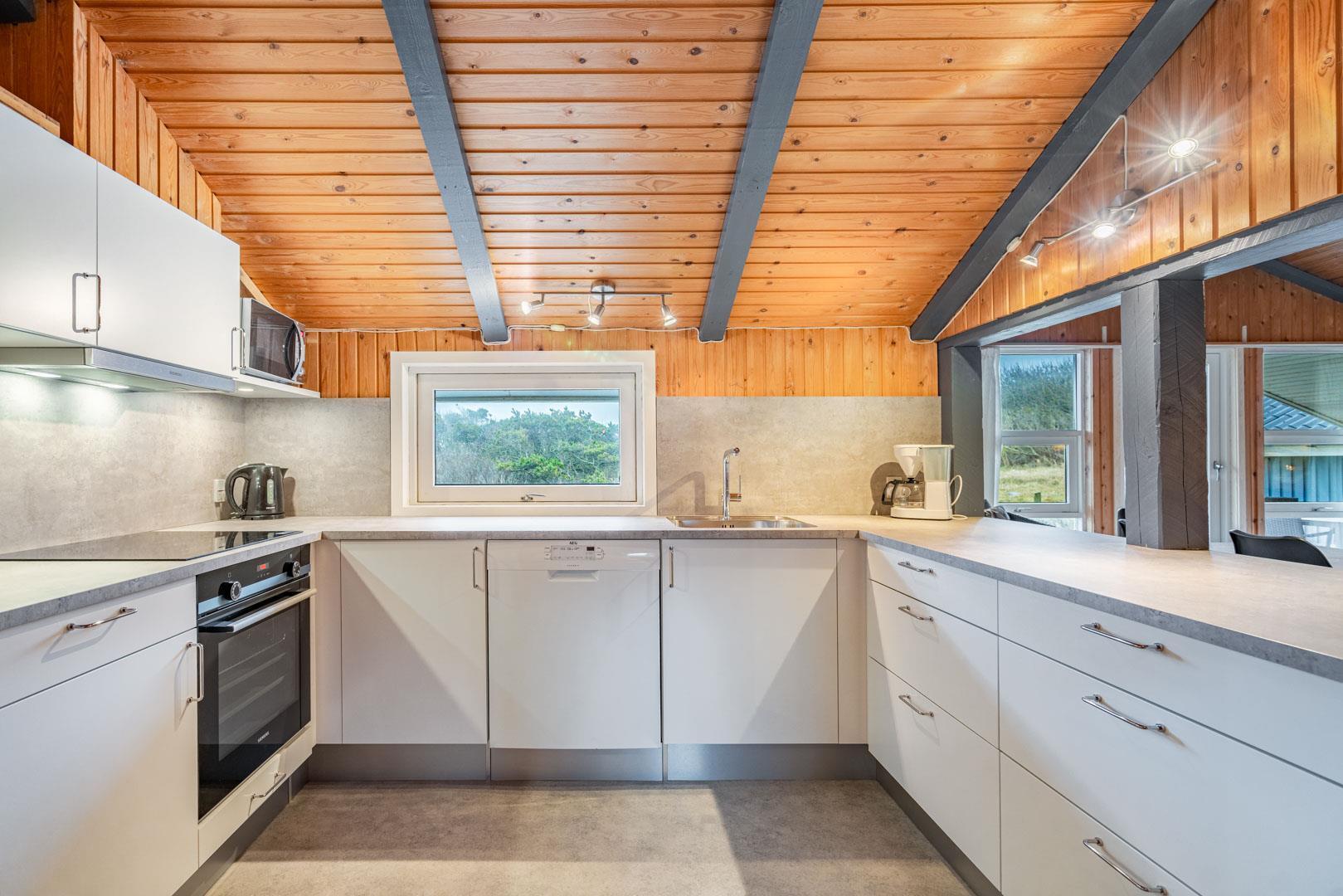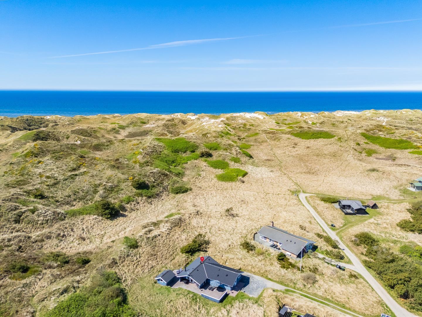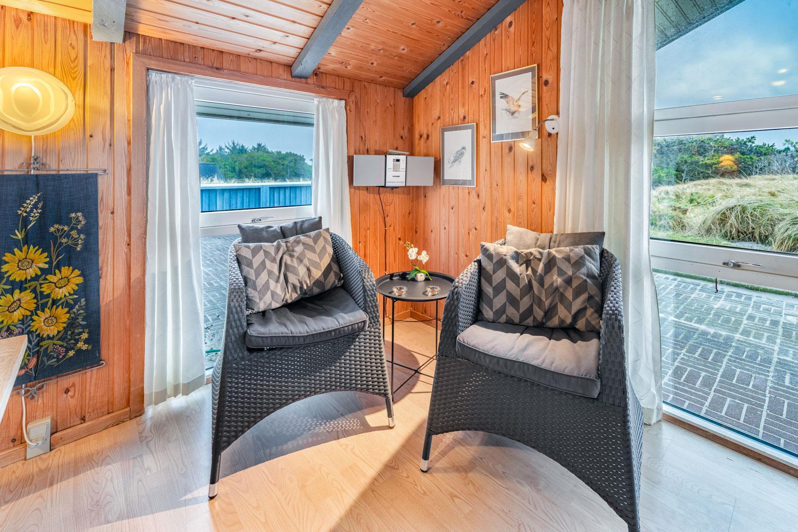 Dieses gemütliche und gepflegte Ferienhaus liegt auf einem prachtvollen, hügeligen Dünengrundstück nahe der Nordsee und dem kleinen Fluss Henne Mølle Å. In 2006 wurden die beiden Badezimmer im Haus erneuert. Eines der Bäder verfügt über einen Whirlpool und eine Sauna. Die große Küche ist mit dem geräumigen Wohnraum kombiniert. Die große, ungestörte und teilweise überdachte Terrasse, von der aus man einen tollen Blick über die Dünen hat, ist vom Wohnbereich aus zugänglich. Auf dem Grundstück befindet sich ein Nebengebäude.