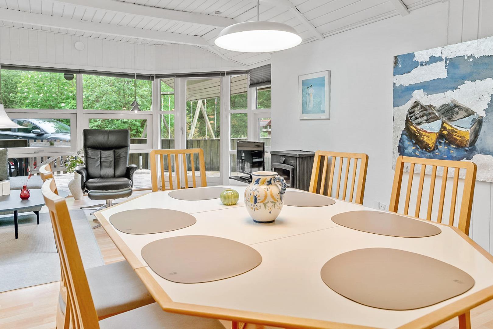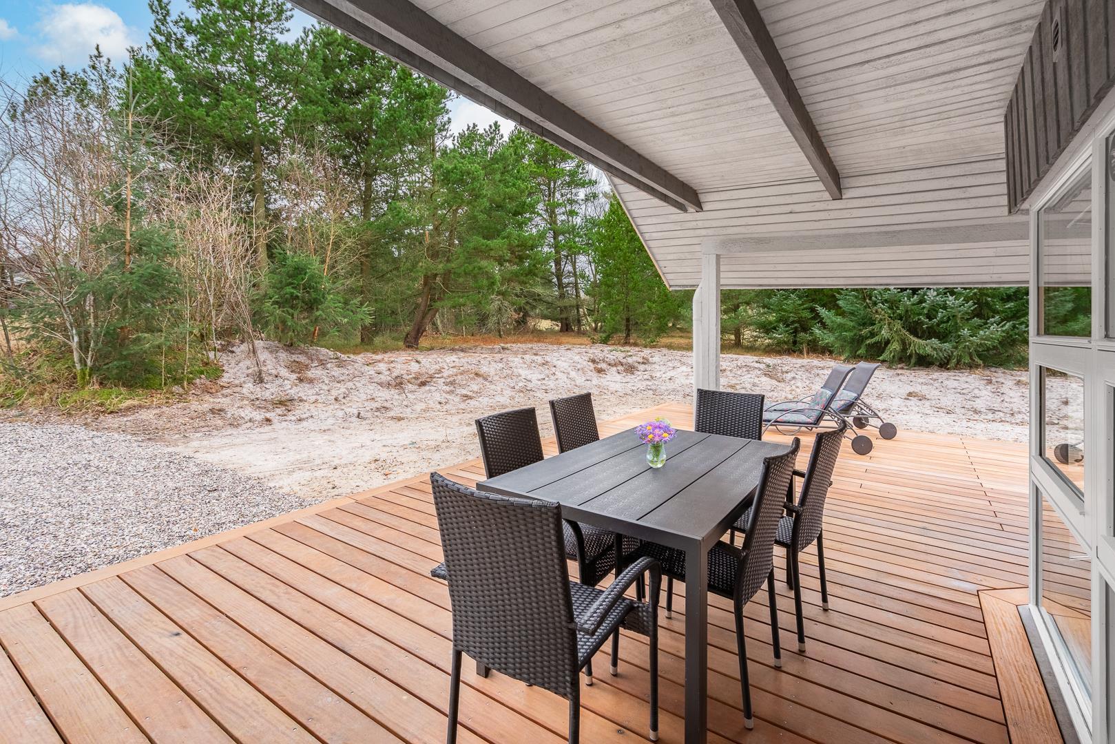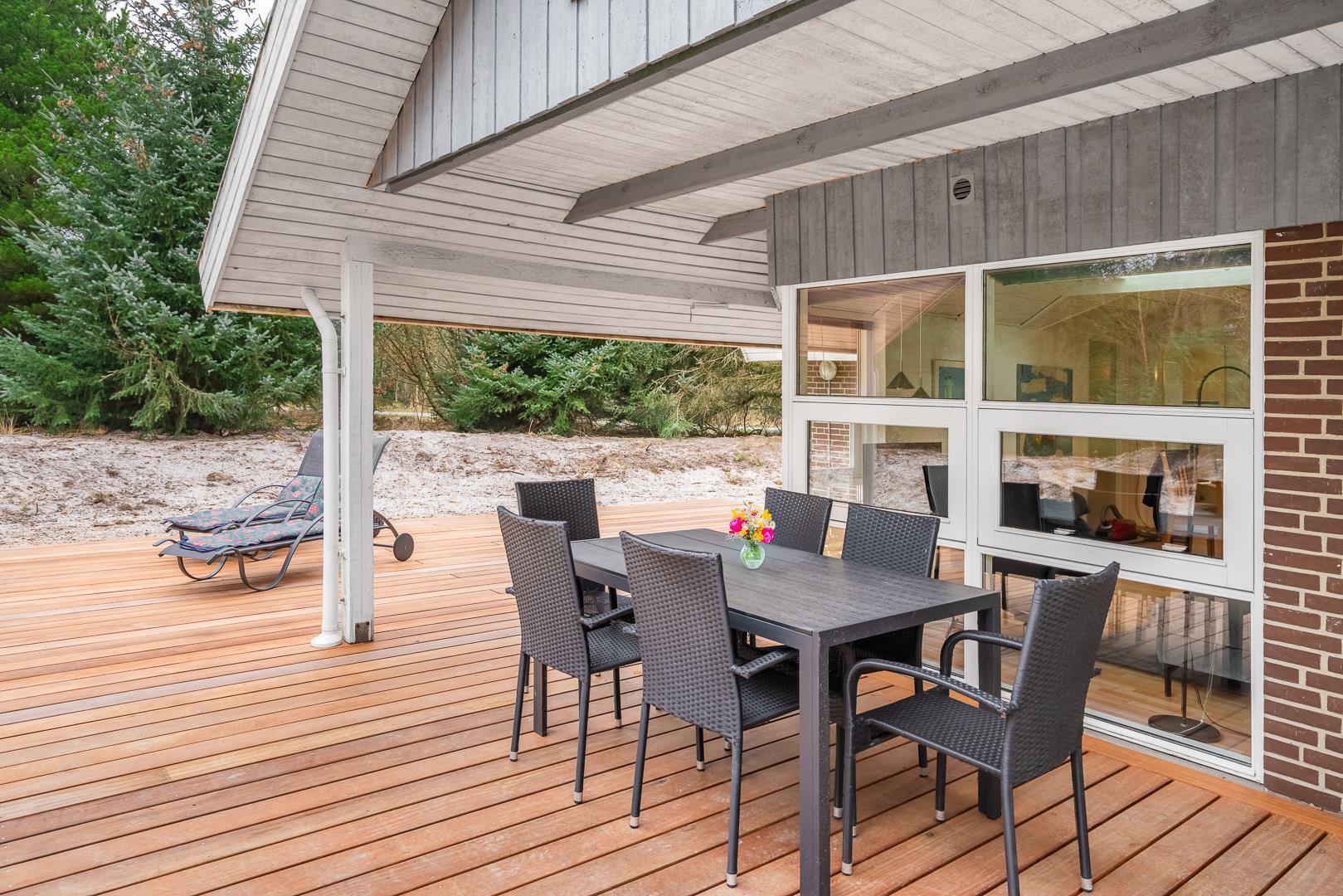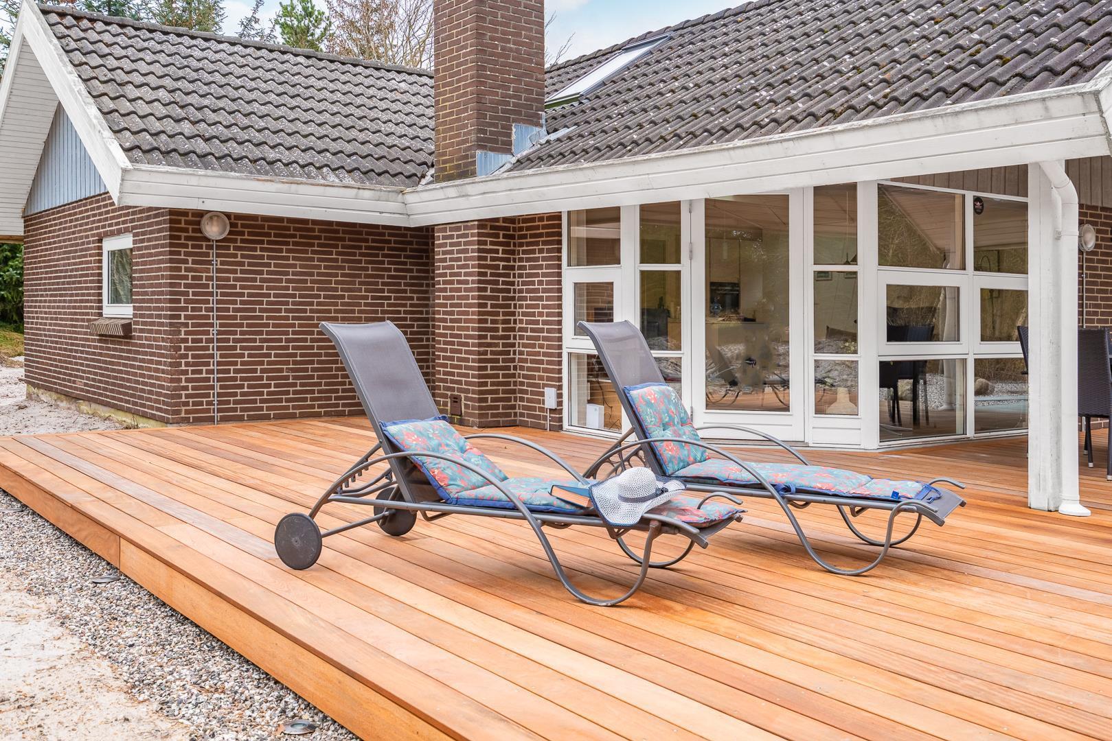 Draußen wird das Ferienhaus von einer Terrasse umgeben, die teilweise überdacht ist. Hier können Sie die Sonne zu jeder Tageszeit genießen, unabhängig vom Wetter. Die Terrasse ist der ideale Ort, um sich in ein gutes Buch zu vertiefen oder einfach die Ruhe und den Blick auf die umliegende Natur zu genießen.