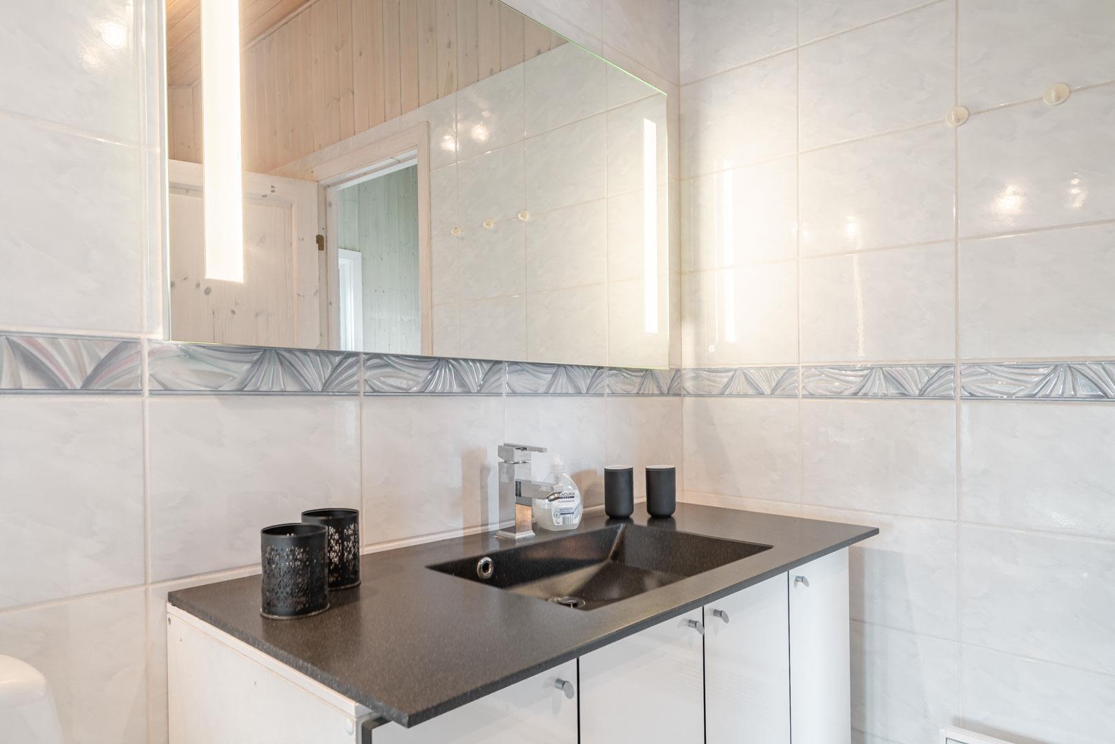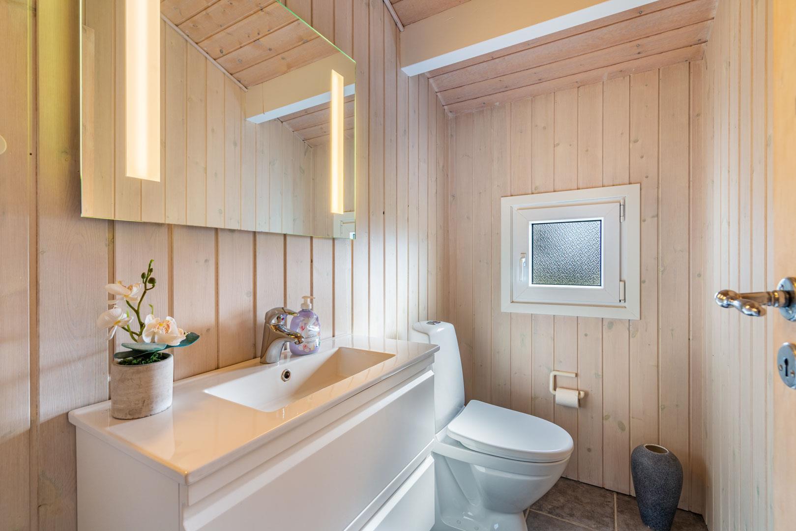 Das große Badezimmer verfügt über eine eigene Sauna und bietet reichlich Platz. Ein zusätzliches Gäste-WC sorgt für noch mehr Komfort – besonders bei Familien oder mehreren Gästen.