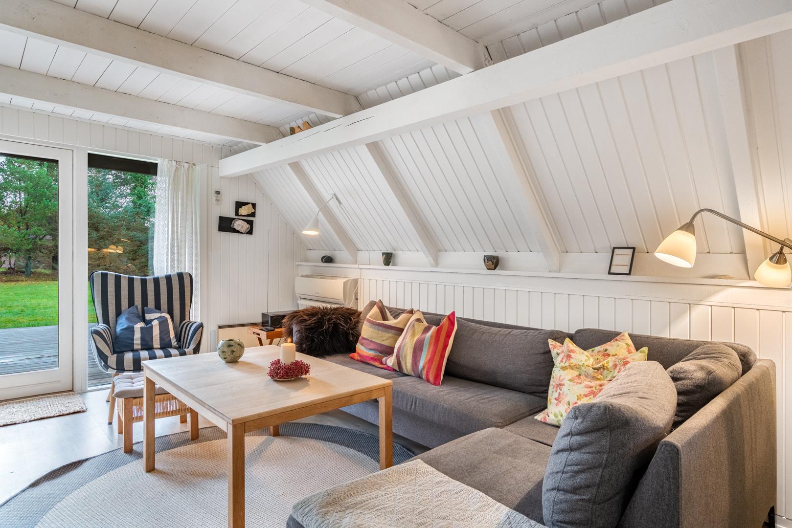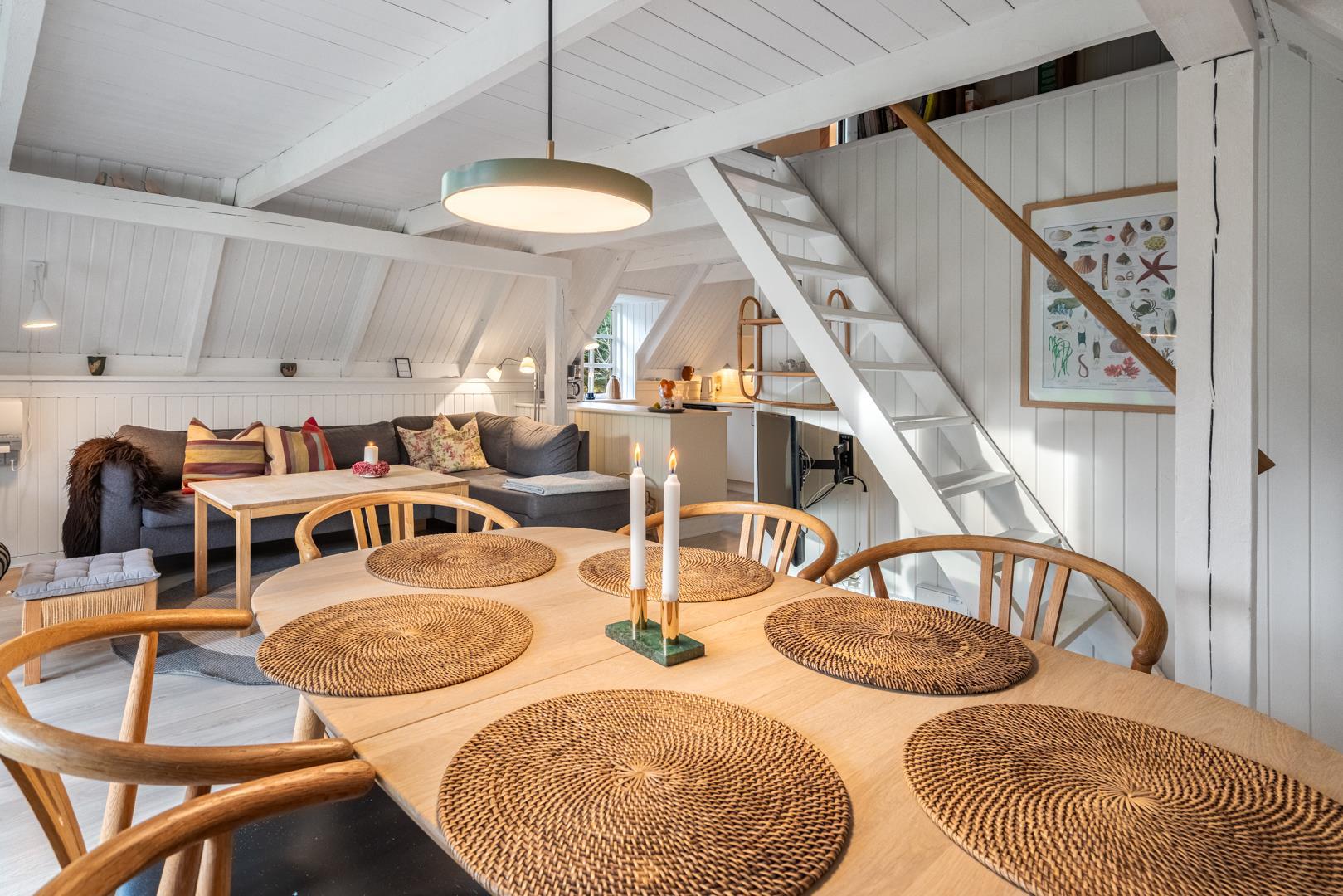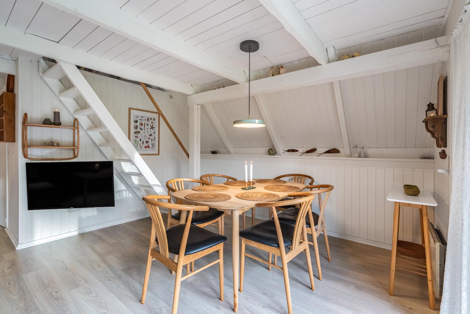 Das Haus ist hell, funktional und gemütlich eingerichtet. Der offene Wohn- und Essbereich bietet direkten Zugang zur teilüberdachten Holzterrasse mit großem Außen-Whirlpool – ideal zum Entspannen in ruhiger Umgebung. Der Kühlschrank befindet sich im Flur.