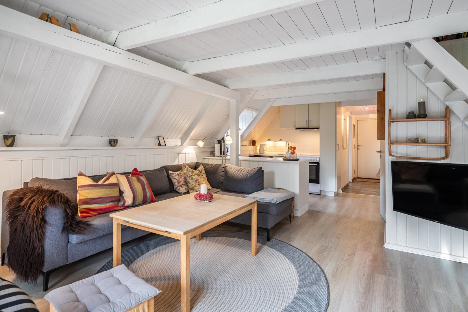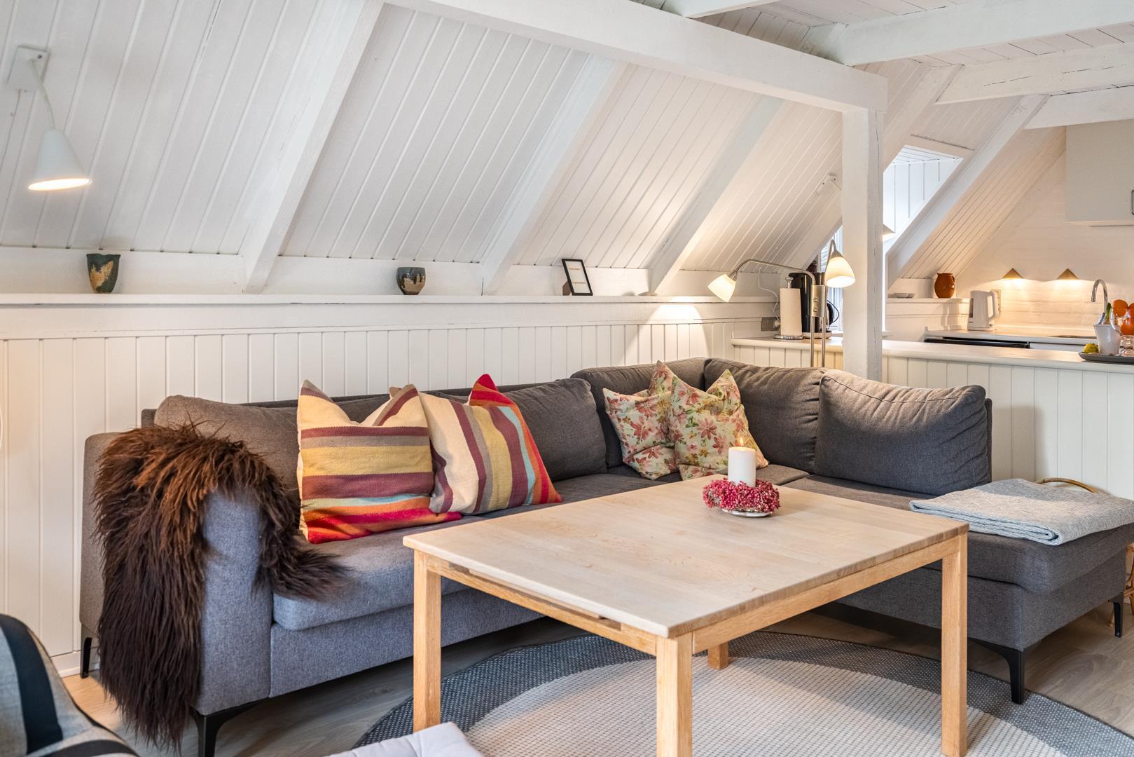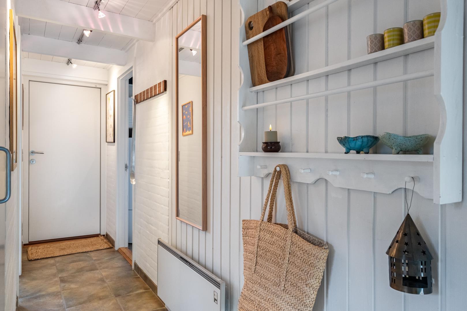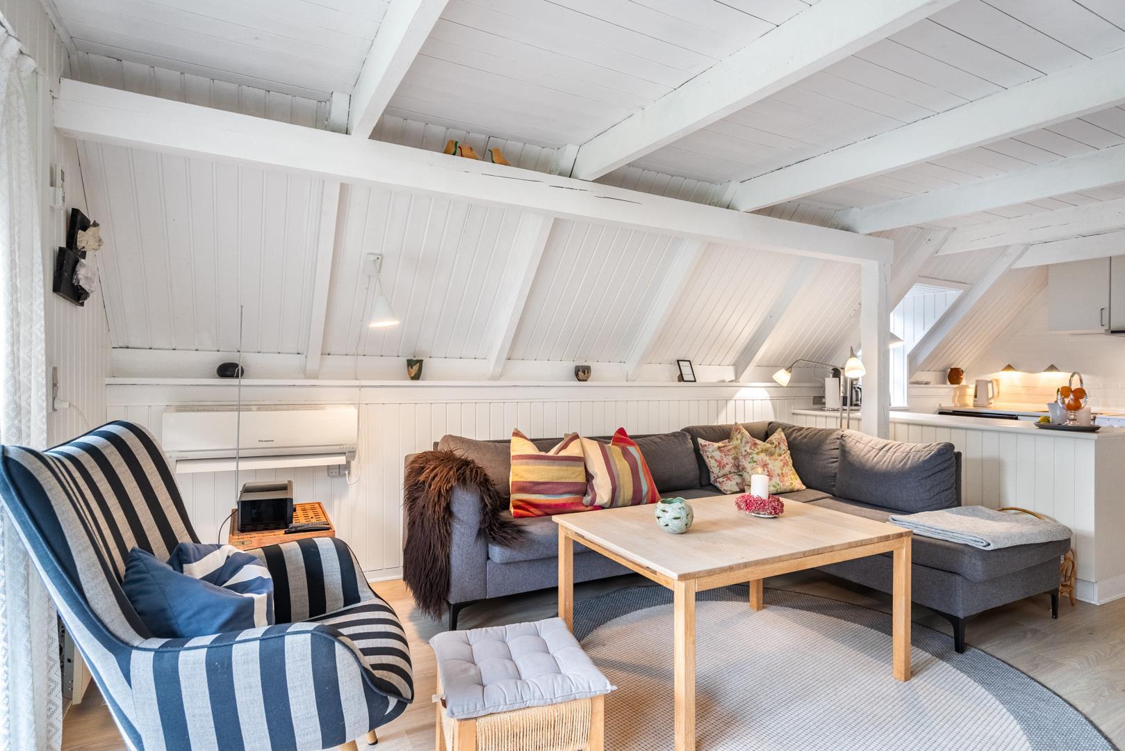 Das Haus ist hell, funktional und gemütlich eingerichtet. Der offene Wohn- und Essbereich bietet direkten Zugang zur teilüberdachten Holzterrasse mit großem Außen-Whirlpool – ideal zum Entspannen in ruhiger Umgebung. Der Kühlschrank befindet sich im Flur.