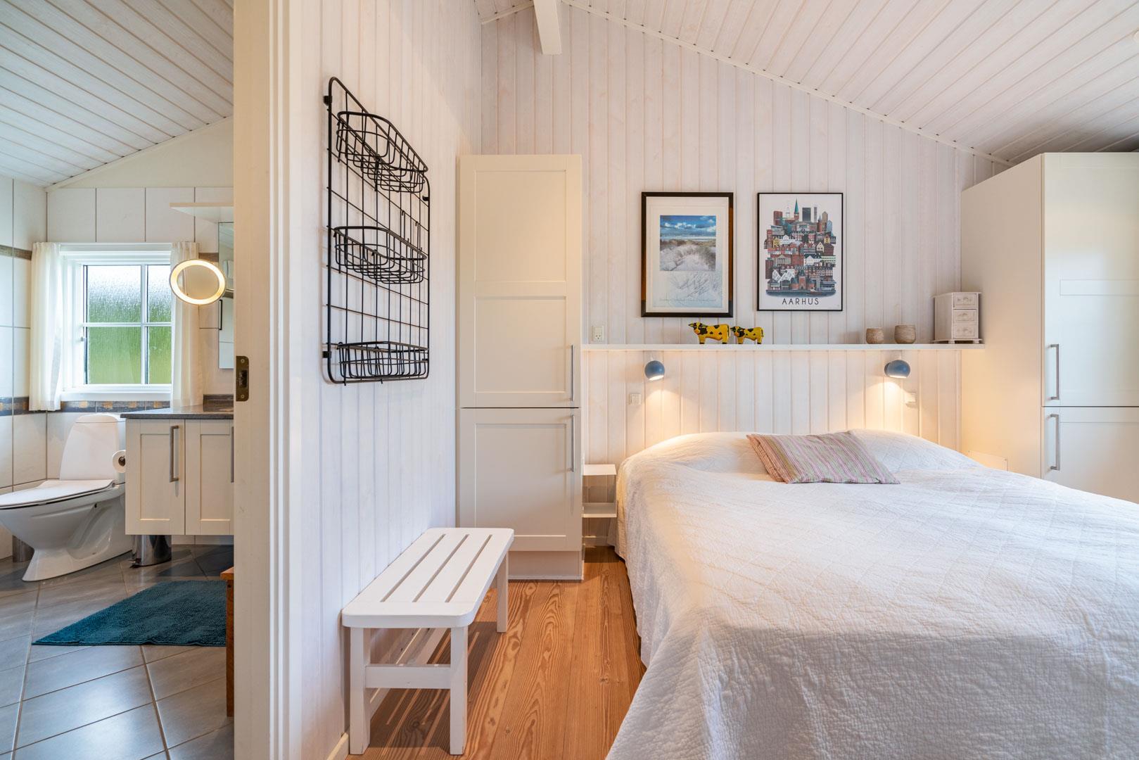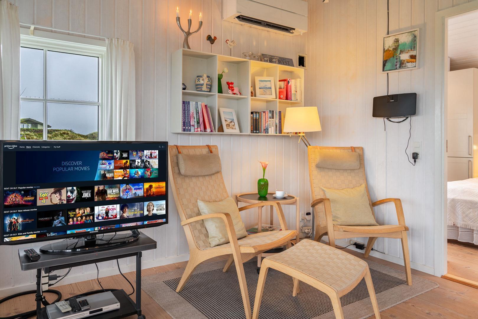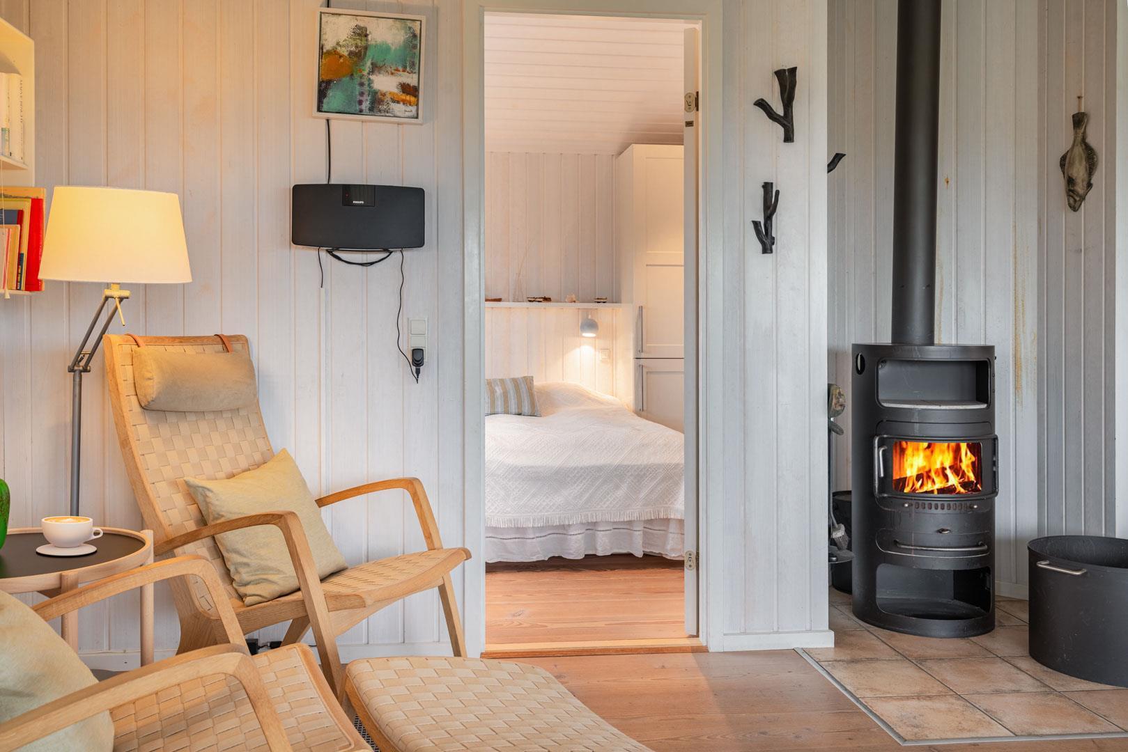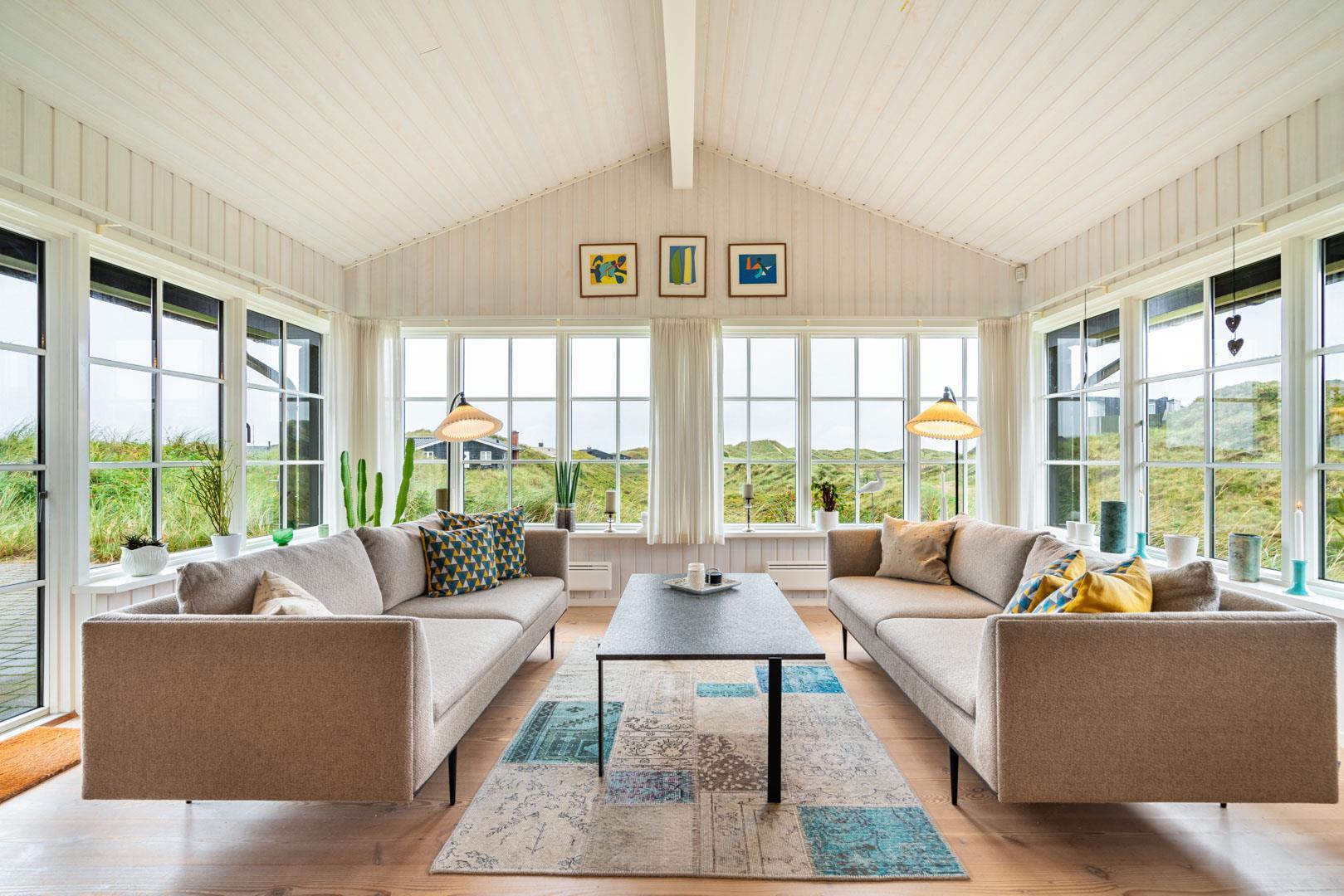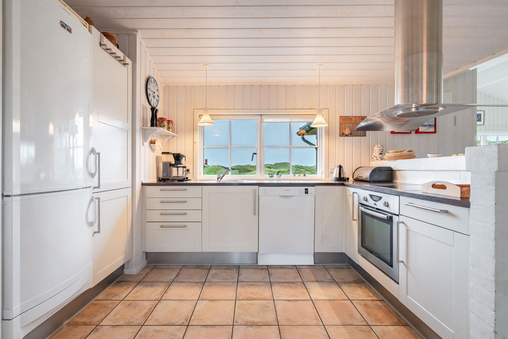 Das Ferienhaus ist mit Komfort und Stil eingerichtet. Die gut ausgestattete Küche ist offen mit dem Ess- und Wohnzimmer verbunden und schafft so einen hellen, großzügigen Wohnraum, in dem die ganze Familie zusammenkommen kann. Vom Wohnzimmer aus gelangen Sie direkt auf die große westlich gelegene Terrasse, wo Sie den Sonnenuntergang und die frische Meeresluft genießen können.