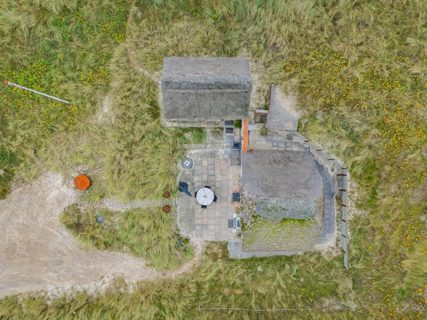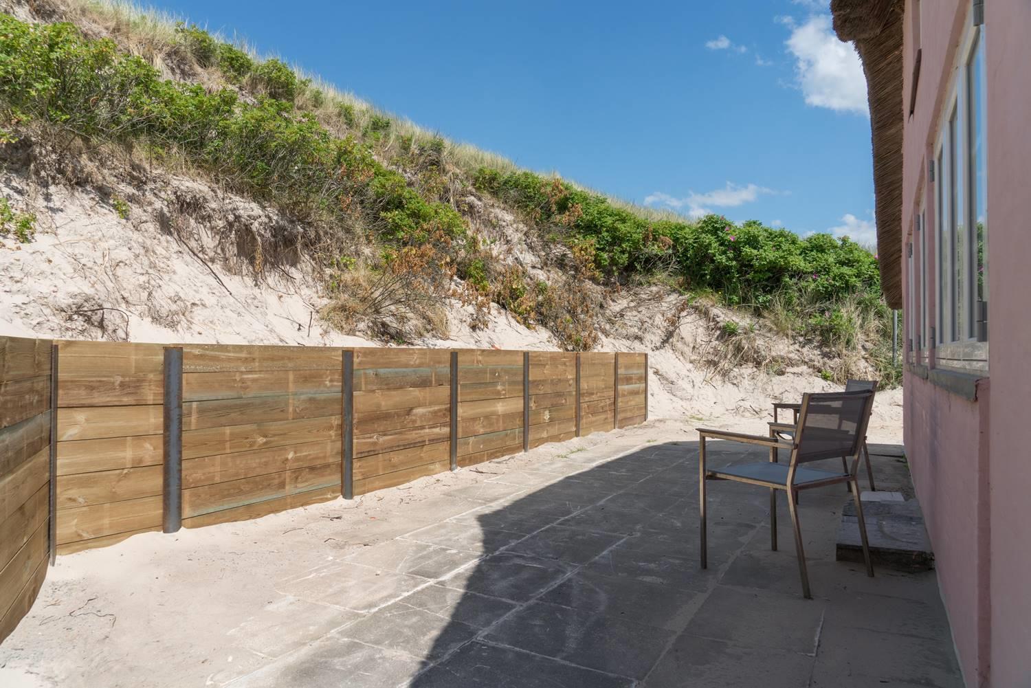 Der Außenbereich dieses charmanten Ferienhauses lädt zum Verweilen unter freiem Himmel ein. Auf der geschützten Terrasse genießt ihr sonnige Stunden und laue Abende – ob beim Frühstück mit Vogelgezwitscher oder beim Grillen mit Blick in die Dünenlandschaft.