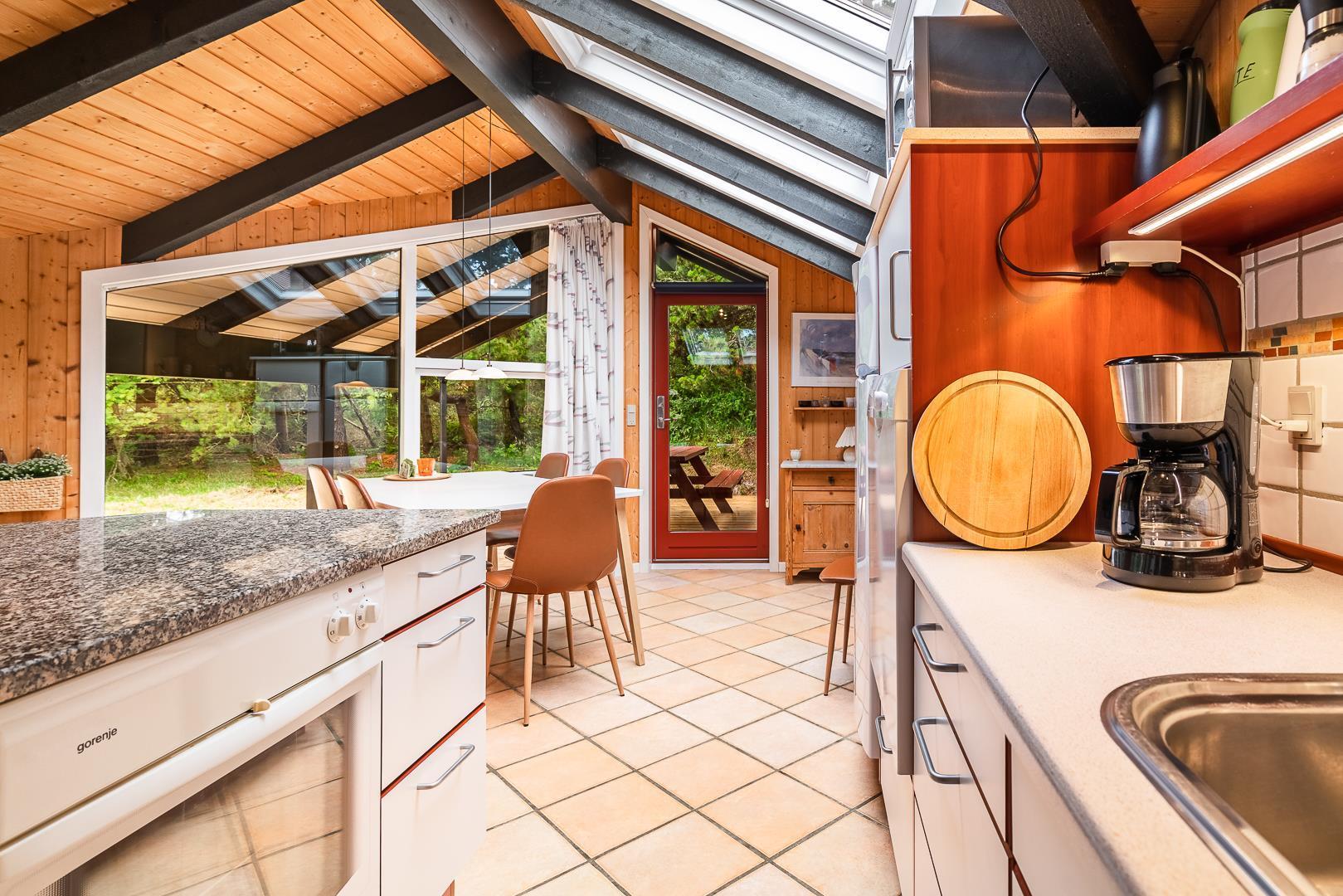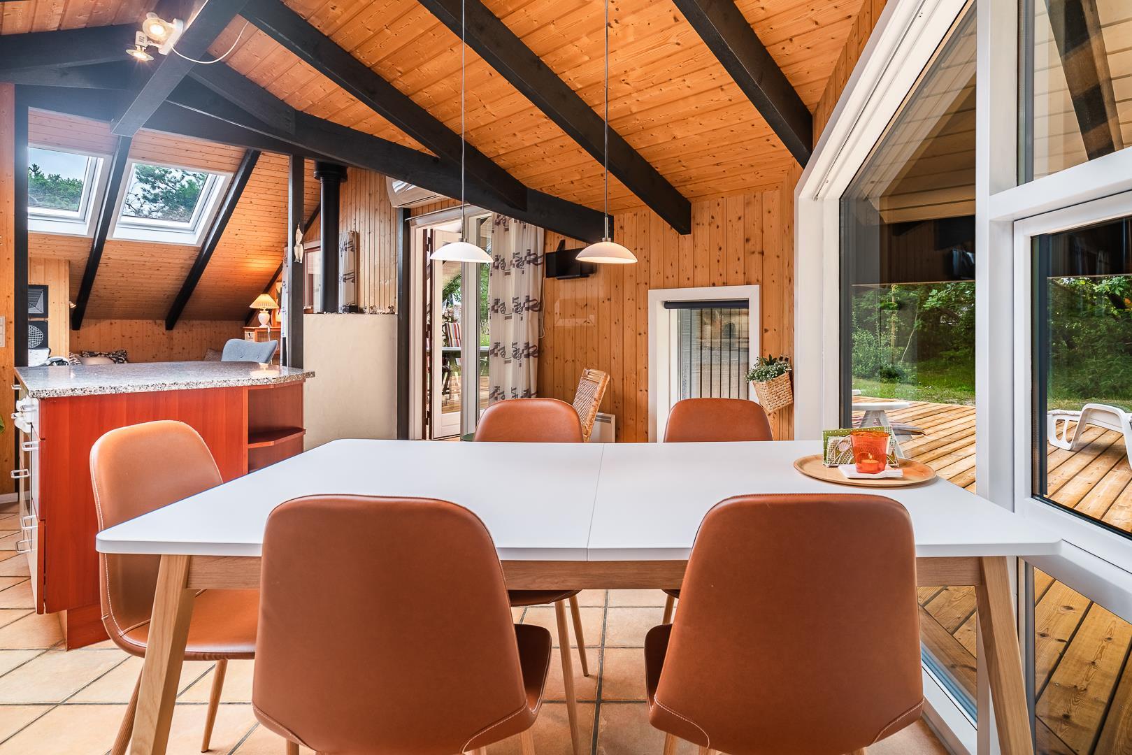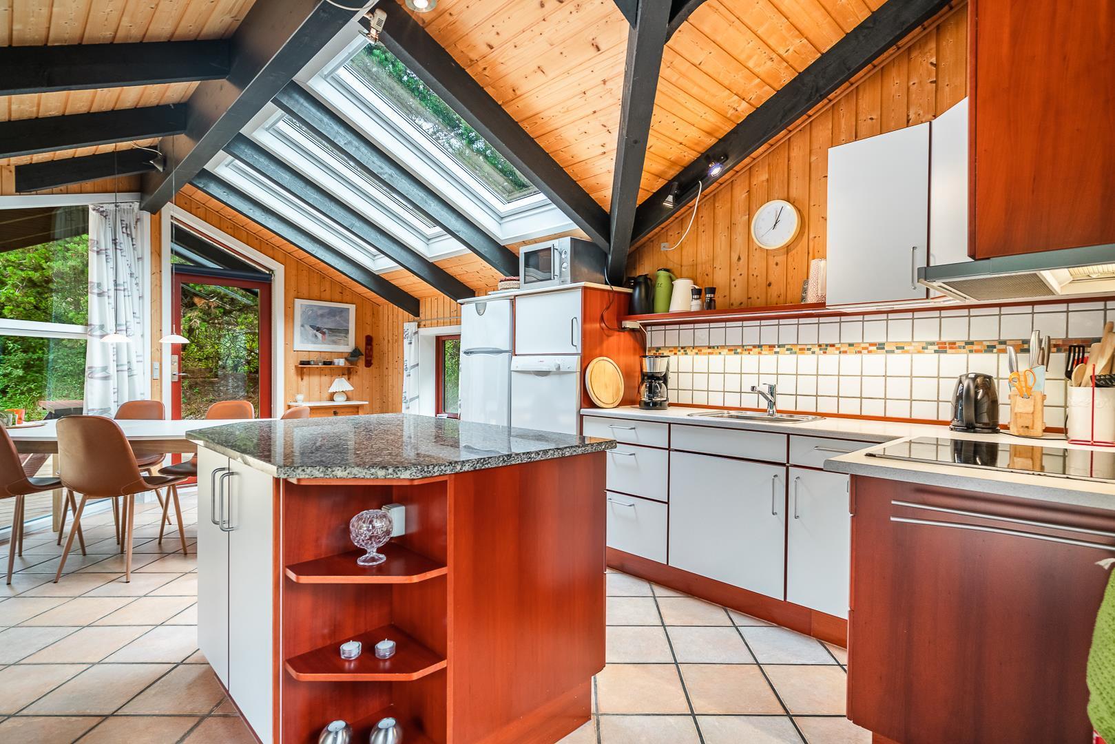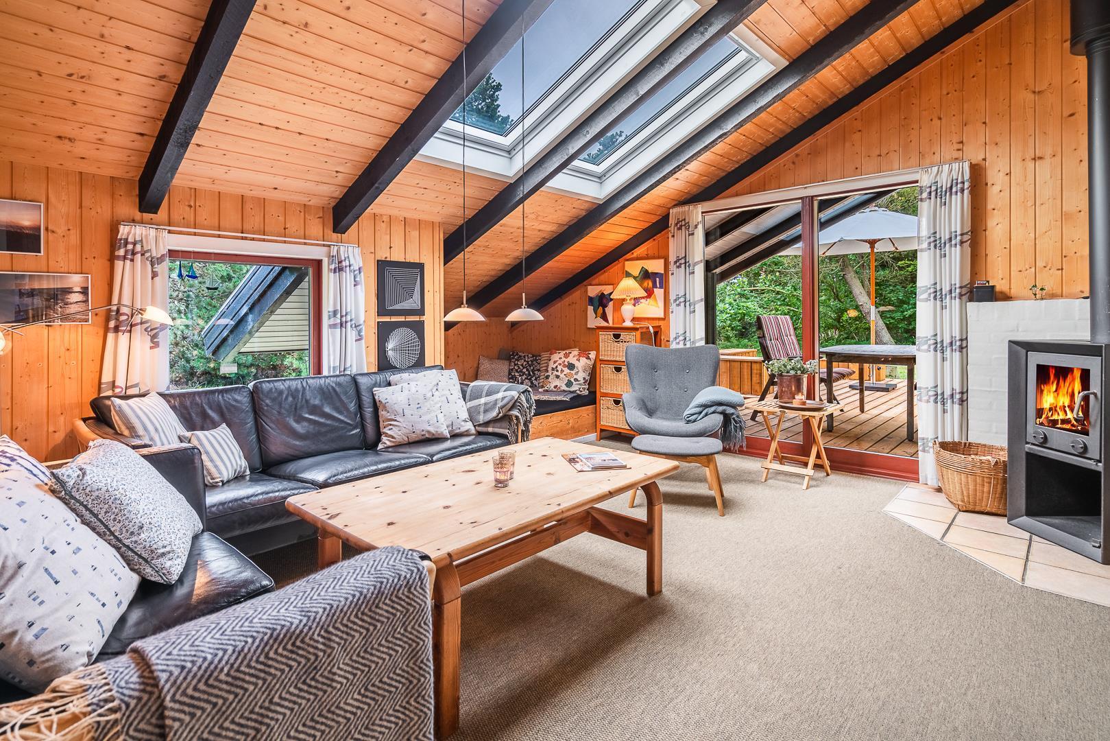 Die große Wohnküche mit Fußbodenheizung ist offen mit dem behaglichen Wohnzimmer verbunden, wo ein Kaminofen mit Glastür für echte Ferienhaus-Gemütlichkeit sorgt. Vom Wohnzimmer aus gelangt man direkt auf eine große, teilweise überdachte und windgeschützte Terrasse, auf der man den ganzen Tag über Sonne und Natur in vollen Zügen genießen kann.