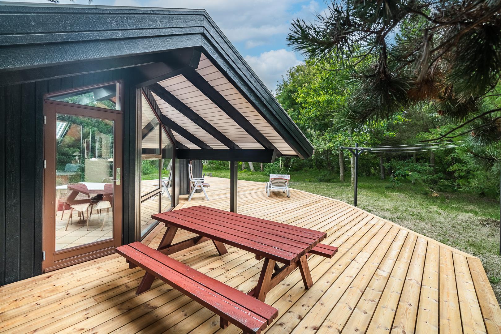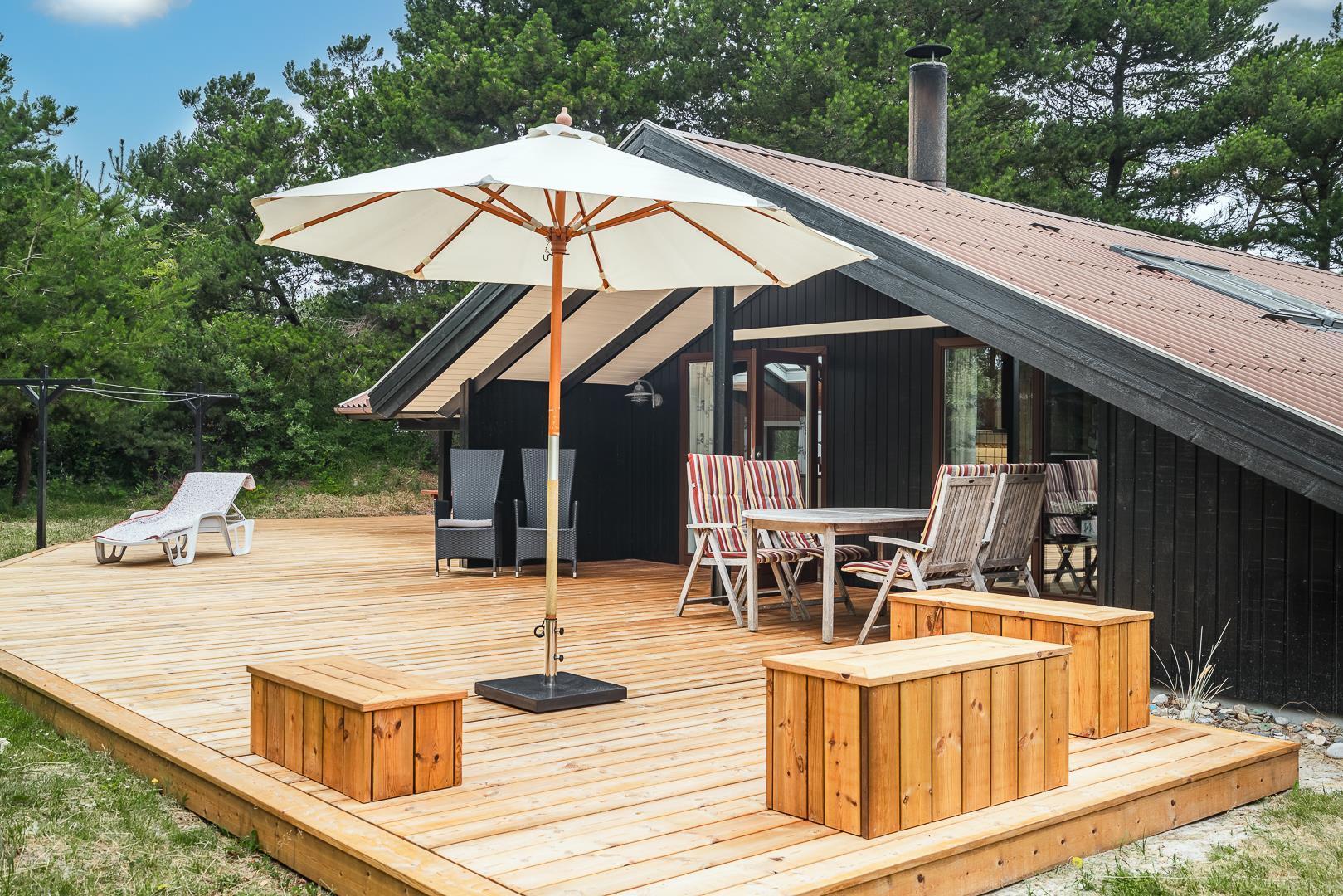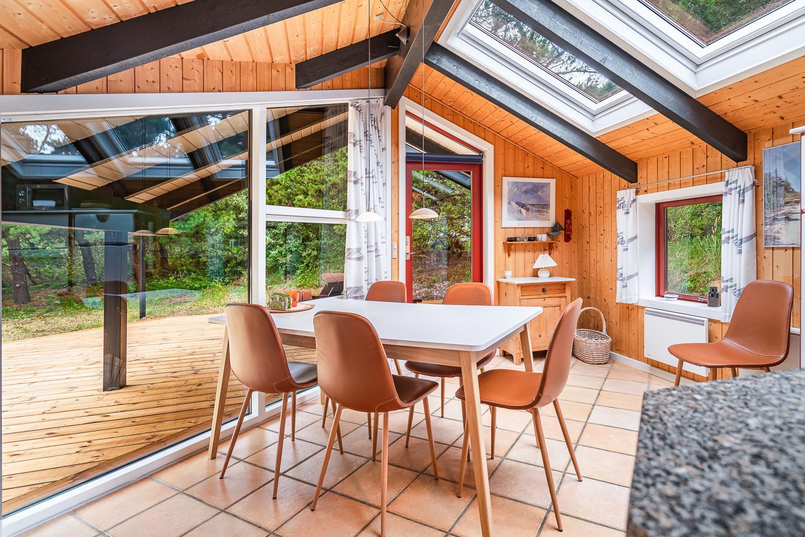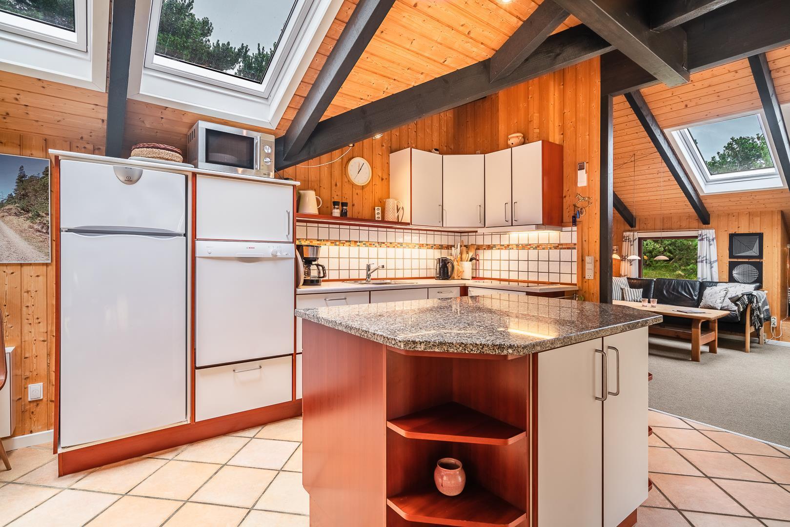 Die große Wohnküche mit Fußbodenheizung ist offen mit dem behaglichen Wohnzimmer verbunden, wo ein Kaminofen mit Glastür für echte Ferienhaus-Gemütlichkeit sorgt. Vom Wohnzimmer aus gelangt man direkt auf eine große, teilweise überdachte und windgeschützte Terrasse, auf der man den ganzen Tag über Sonne und Natur in vollen Zügen genießen kann.