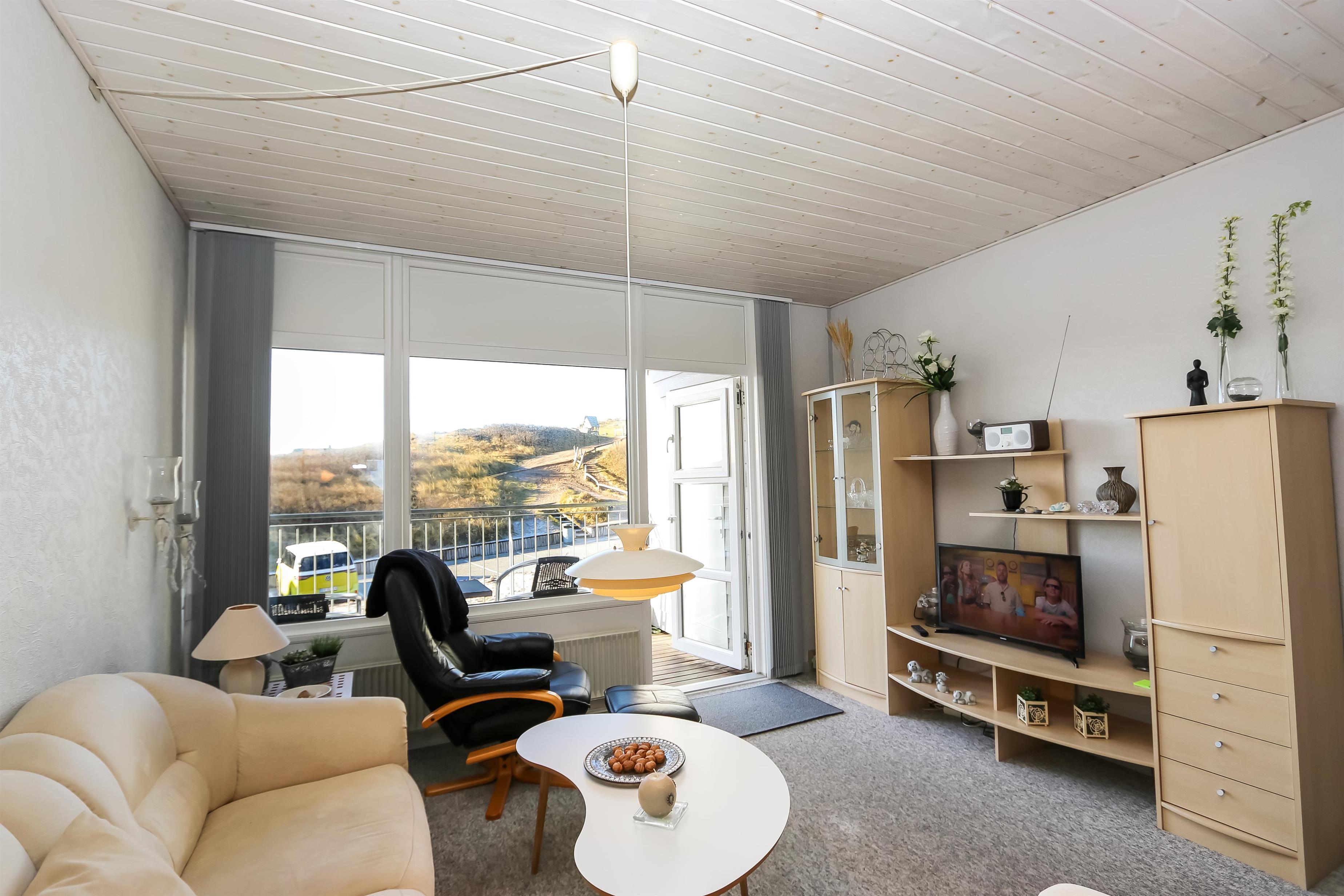 Vom Wohnzimmer aus gibt es Zugang zu einem überdachten Balkon mit Gartenmöbeln und schönem Blick auf die Dünenlandschaft. Die Treppe zum 1. Stock besteht aus 16 Stufen.