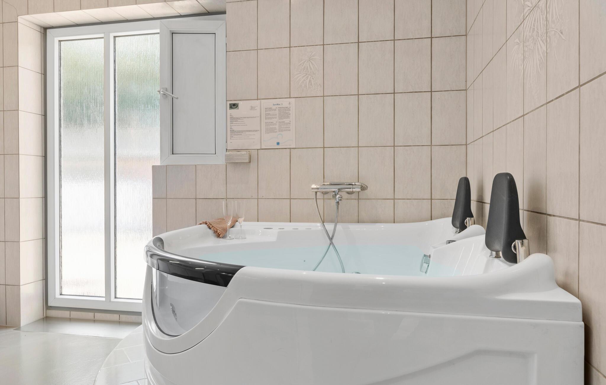 Entspannen Sie sich abends im Whirlpool im Haus oder im Finnischen Holzbad auf der Terrasse.
