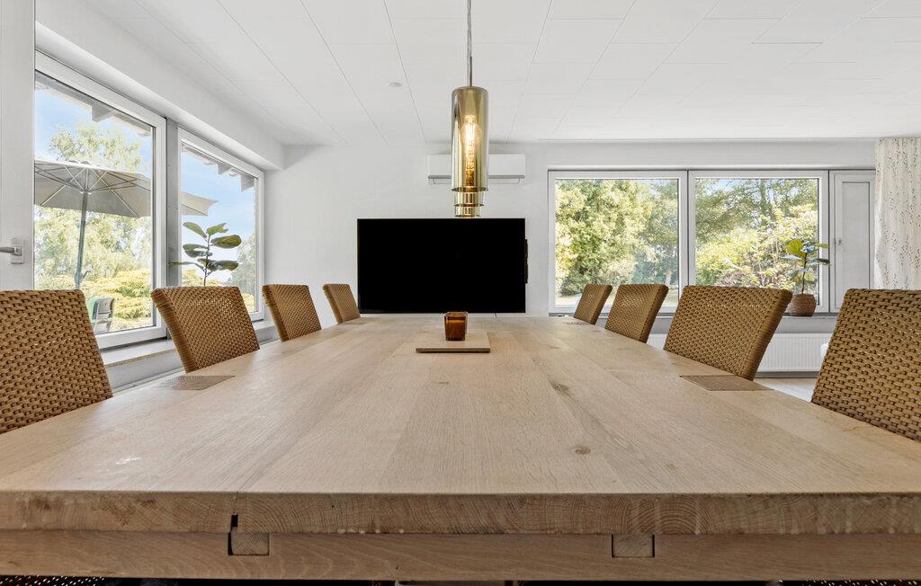 Ihr Ferienhaus am Himmark Strand ist der ideale Rückzugsort für alle, die Ruhe, Natur und Komfort miteinander verbinden möchten. Hier können Sie den Alltag hinter sich lassen und entspannte Tage an der frischen Luft genießen. Ihr gemütliches Ferienhaus bietet den idealen Rahmen für einen Aufenthalt in einer ruhigen und naturnahen Umgebung. Das Haus empfängt Sie mit einem hellen und freundlichen Wohnbereich, der mit bequemen Sitzmöbeln zum Entspannen einlädt. Große Fenster sorgen dafür, dass viel Tageslicht in die Räume strömt, und bieten gleichzeitig einen schönen Blick auf den grünen Garten. Der Essbereich, der an das Wohnzimmer anschließt, bietet Platz für gesellige Mahlzeiten in fröhlicher Runde.