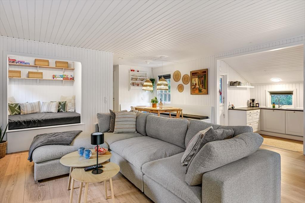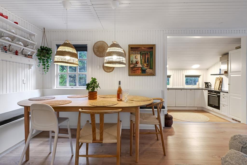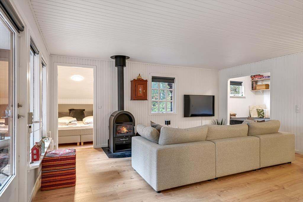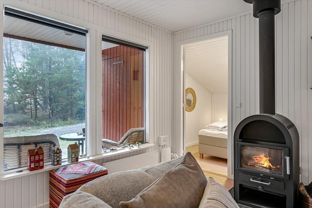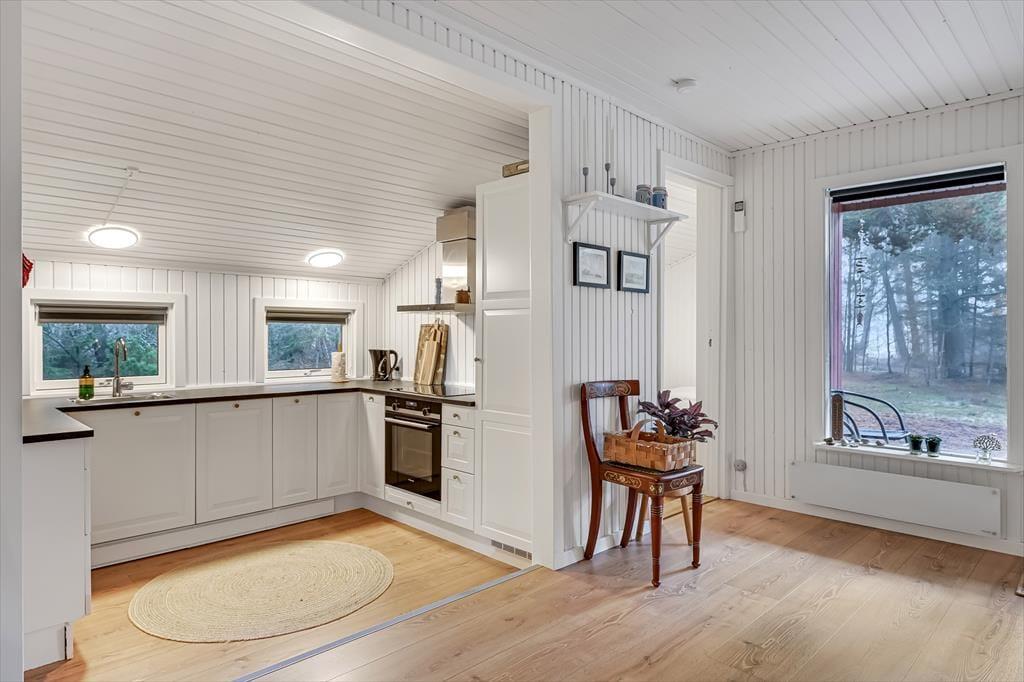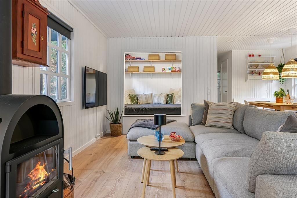 Wenn Sie dieses charmante Ferienhaus betreten, werden Sie sich sofort wie zu Hause fühlen. Der Aufenthaltsraum strahlt mit seinen hellen Holzwänden und dem warmen Glanz des Kamins Gemütlichkeit aus. Hier können Sie abends zusammensitzen, die Flammen Licht und Wärme verbreiten lassen und einen guten Film oder ein spannendes Buch genießen. Die Küche ist schön und gut ausgestattet, sodass es eine Freude ist, köstliche Mahlzeiten zuzubereiten, die Sie am geräumigen Esstisch genießen können. Das Ferienhaus bietet Platz für die kleine Familie mit vier Personen. Es gibt drei Schlafzimmer und ein helles Badezimmer. Auch für den Hund der Familie ist Platz, sodass niemand zu Hause bleiben muss.
