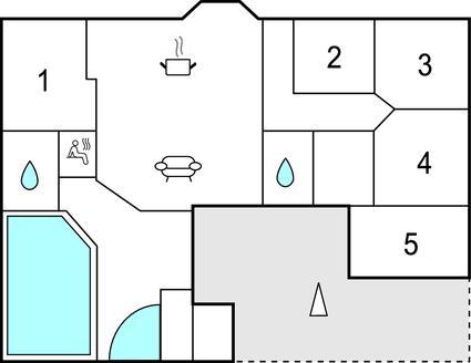 Das Herz des Hauses ist das Wohnzimmer, das zur Küche offen ist. Vom Esstisch und der Küche habe Sie Sicht auf den Poolraum. In den gemütlichen Wohnzimmermöbeln können Sie gut Filme im TV genießen. Außer Pool sind hier auch Massagewanne und Sauna vorhanden, diese werden Sie nach langen Spaziergängen am Meer entlang oder im Wald verwöhnen. Der Wald liegt sozusagen gleich vor der Tür. Die fünf Schlafzimmer, der Eingang des Hauses und der Hauswirtschaftsraum bieten viel Platz. Ihr Urlaub wird hier gelingen. Leicht vom Wohnzimmer erreichbar ist eine schöne Terrasse mit windstillen Bereichen. Hier können Sie schöne Stunden im Freien genießen. Vom Haus haben Sie Aussicht auf den Golfplatz.