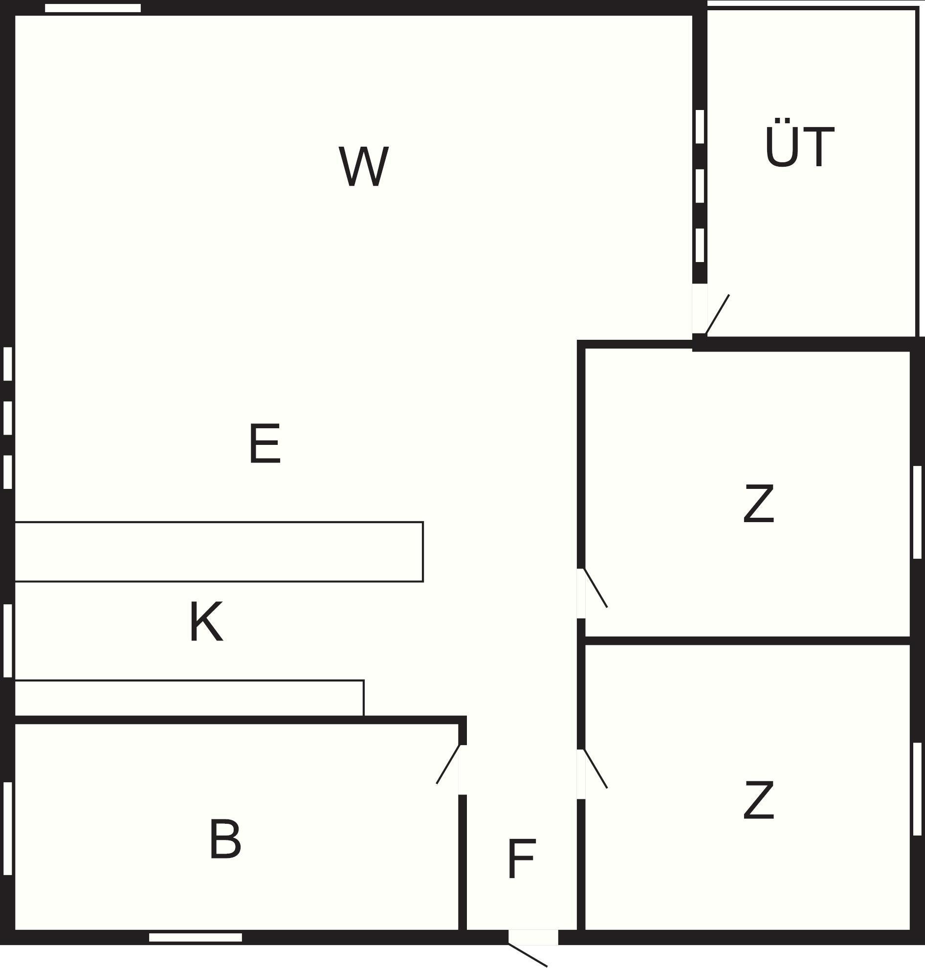 Küche: E-Herd, Kühlschr. m. Gefrierfach, Abzugsh., Kaffeem.