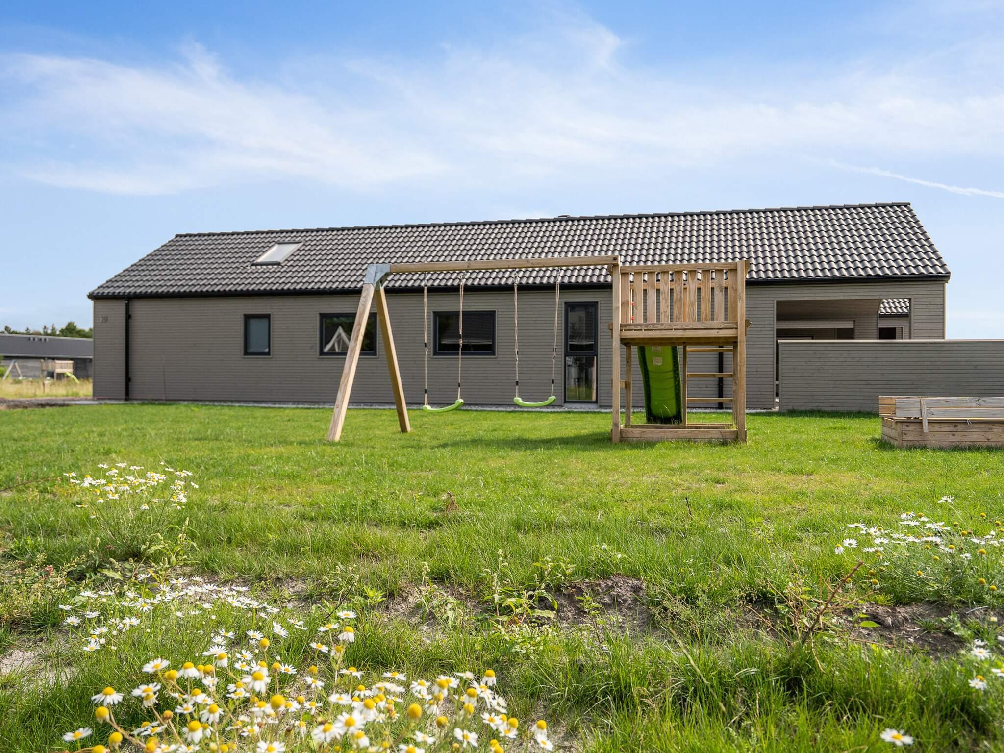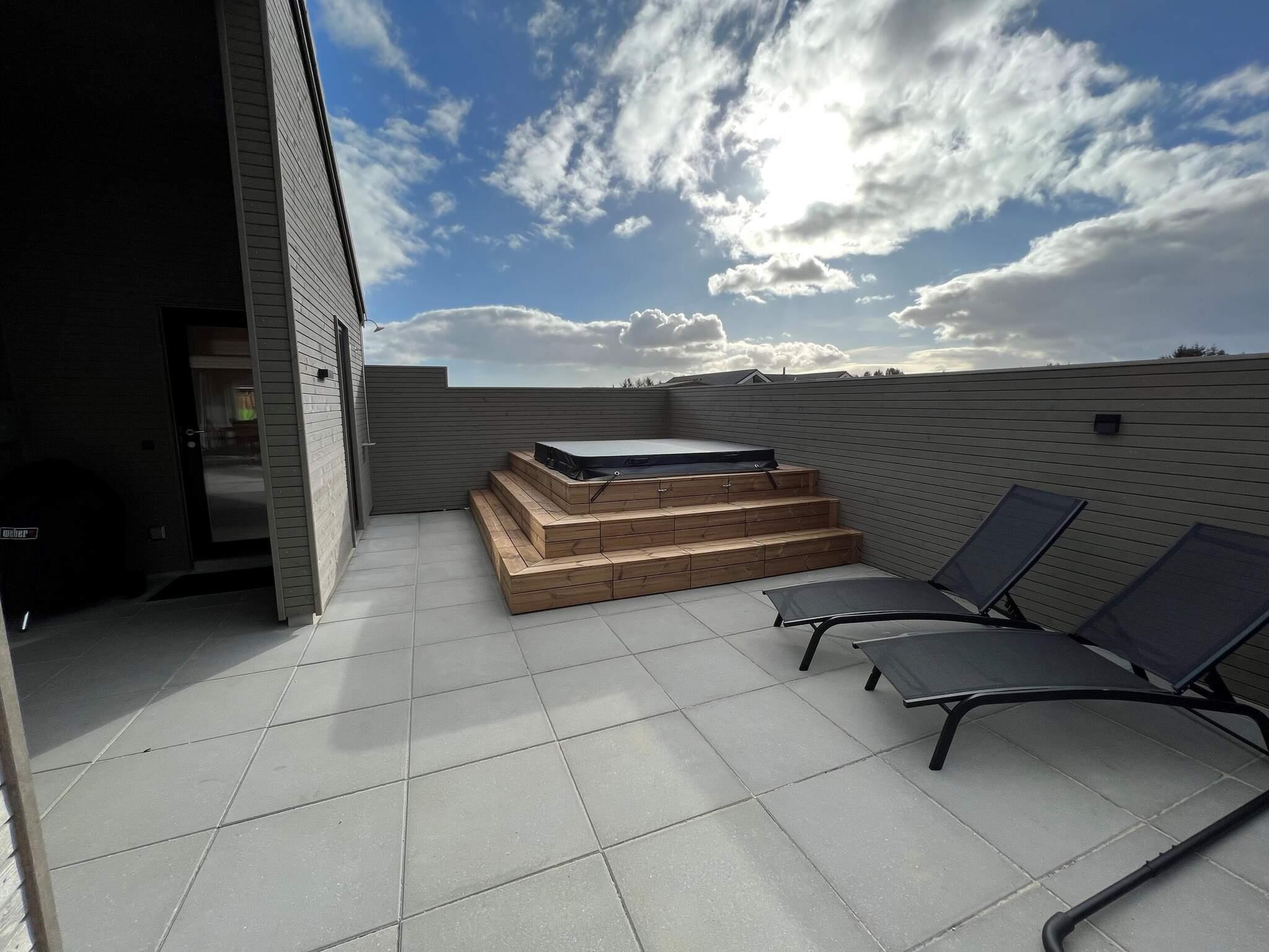 Auch im Außenbereich gibt es viel Platz zum Entspannen und Spielen, und zwar auf der teilweise überdachten Terrasse, die neben einem Außen-Spa und einer Außensauna auch über Gartenmöbel und einen Grill verfügt. Während das Essen auf dem Grill zubereitet wird, können die Kinder im Garten spielen, wo es ein Bodentrampolin und einen Spielturm mit Schaukeln gibt.