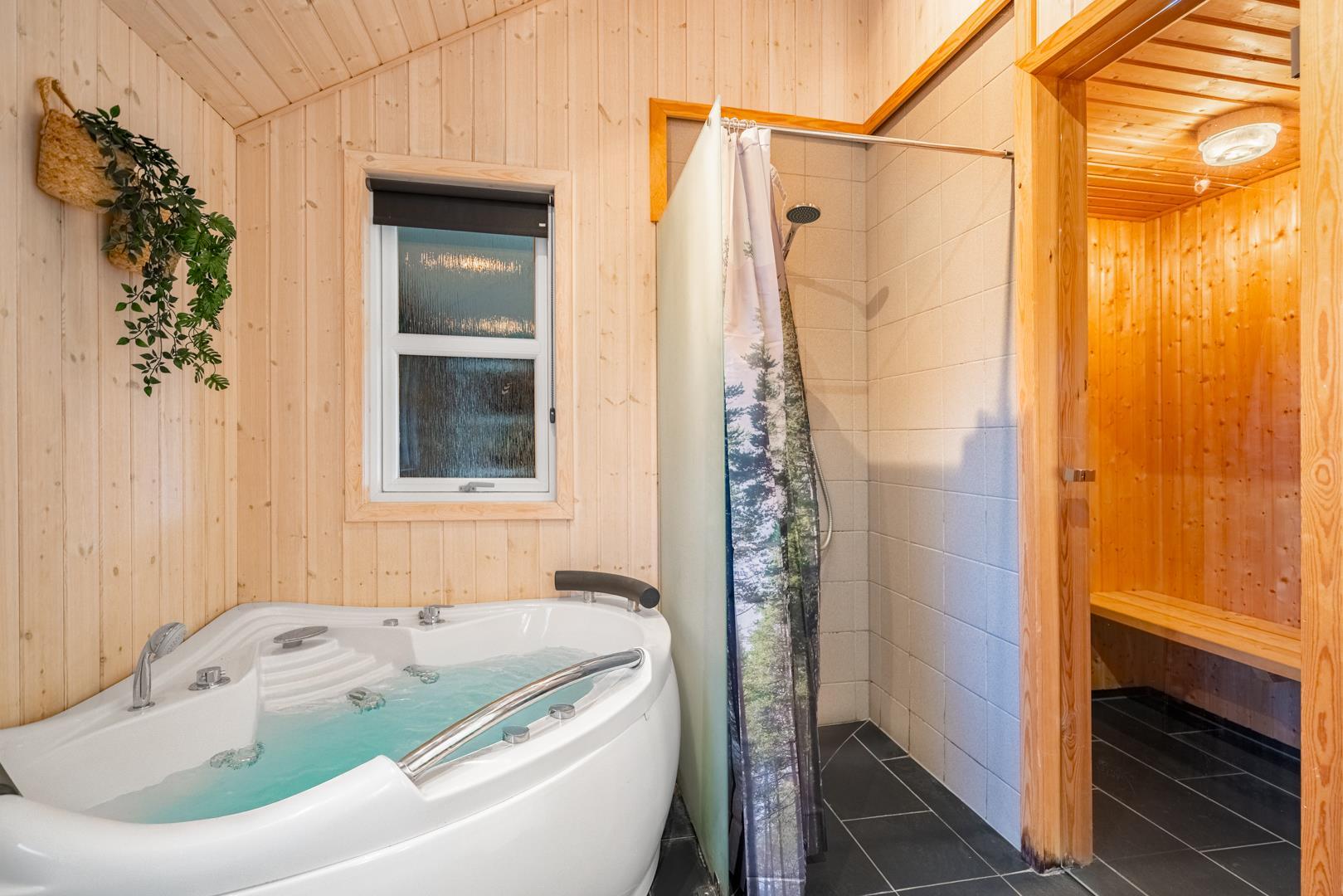 Am Ende des Hauses gibt es noch einen Zwischenboden mit Matratze mit Platz für 1 Person. 2 Badezimmer, das eine mit Whirlpool und Sauna und beide mit Fußbodenheizung. Offene Küche mit extra Gefrierfach 50L, Mikrowelle und Spülmaschine. Stube mit TV und Kaminofen in Verbindung mit der Essecke. Das Haus ist hell und freundlich und es ist viel Platz zur Decke mit gutem Lichteinfall von den großen Fensterpartien. Vom Wohnzimmer gibt es Zugang zur großen Südterrasse, von dem ein Teil überdacht ist. Carport, sowie Schuppen zur Verfügung.