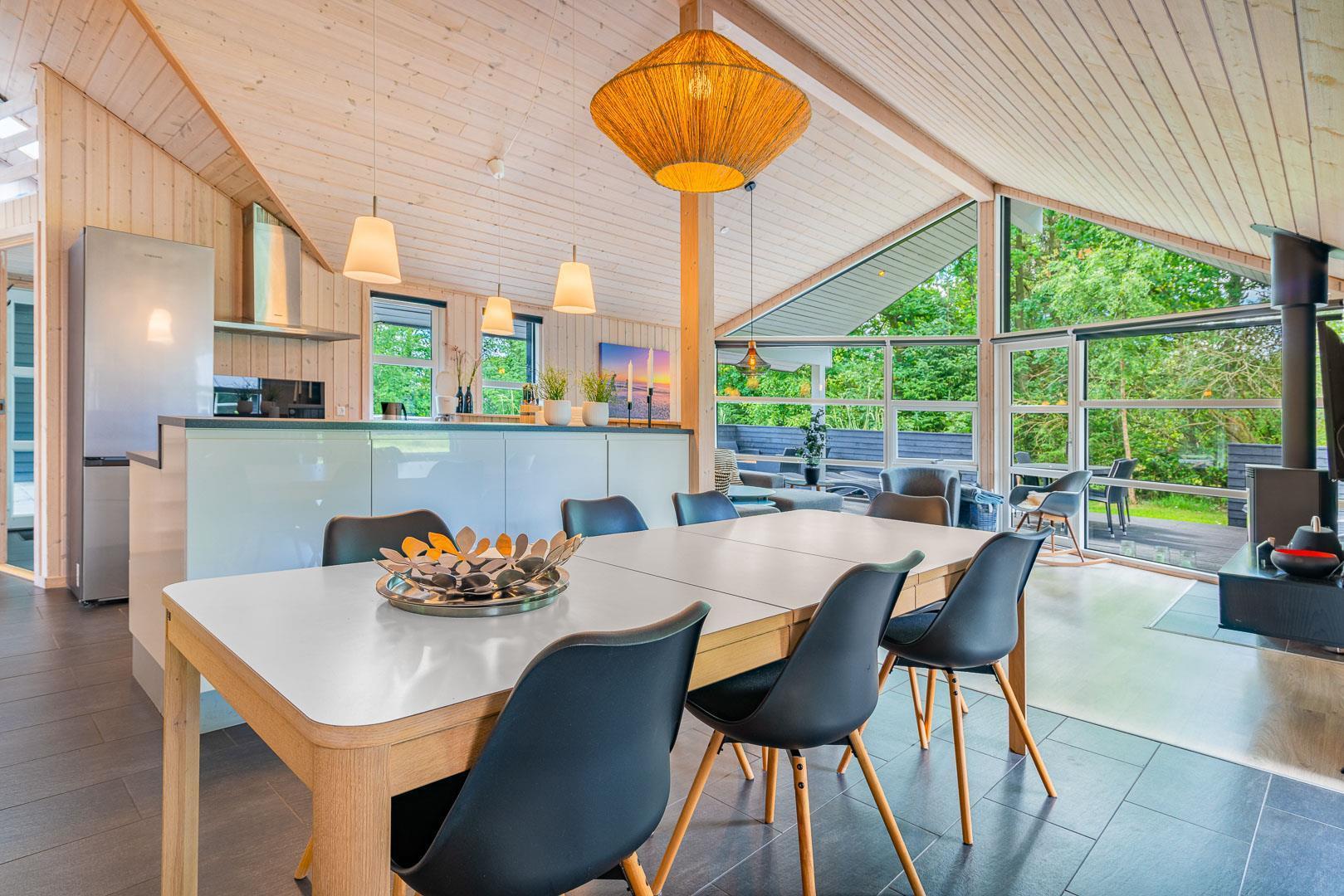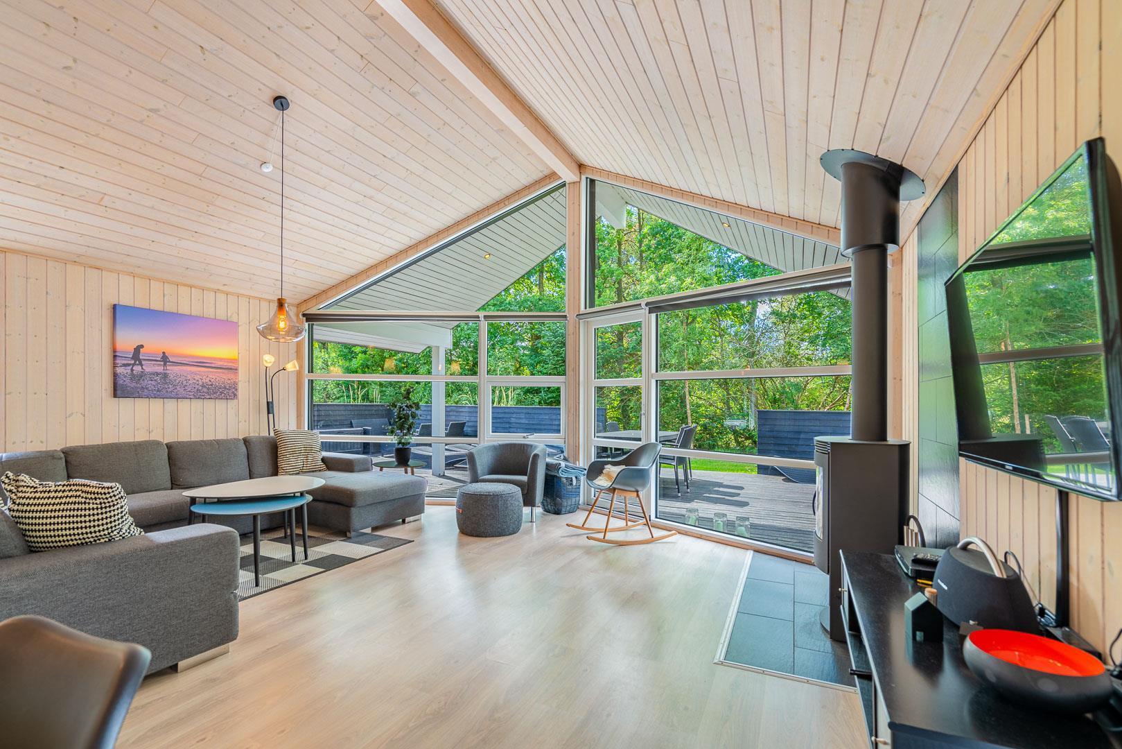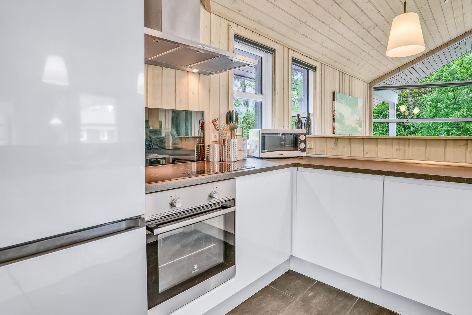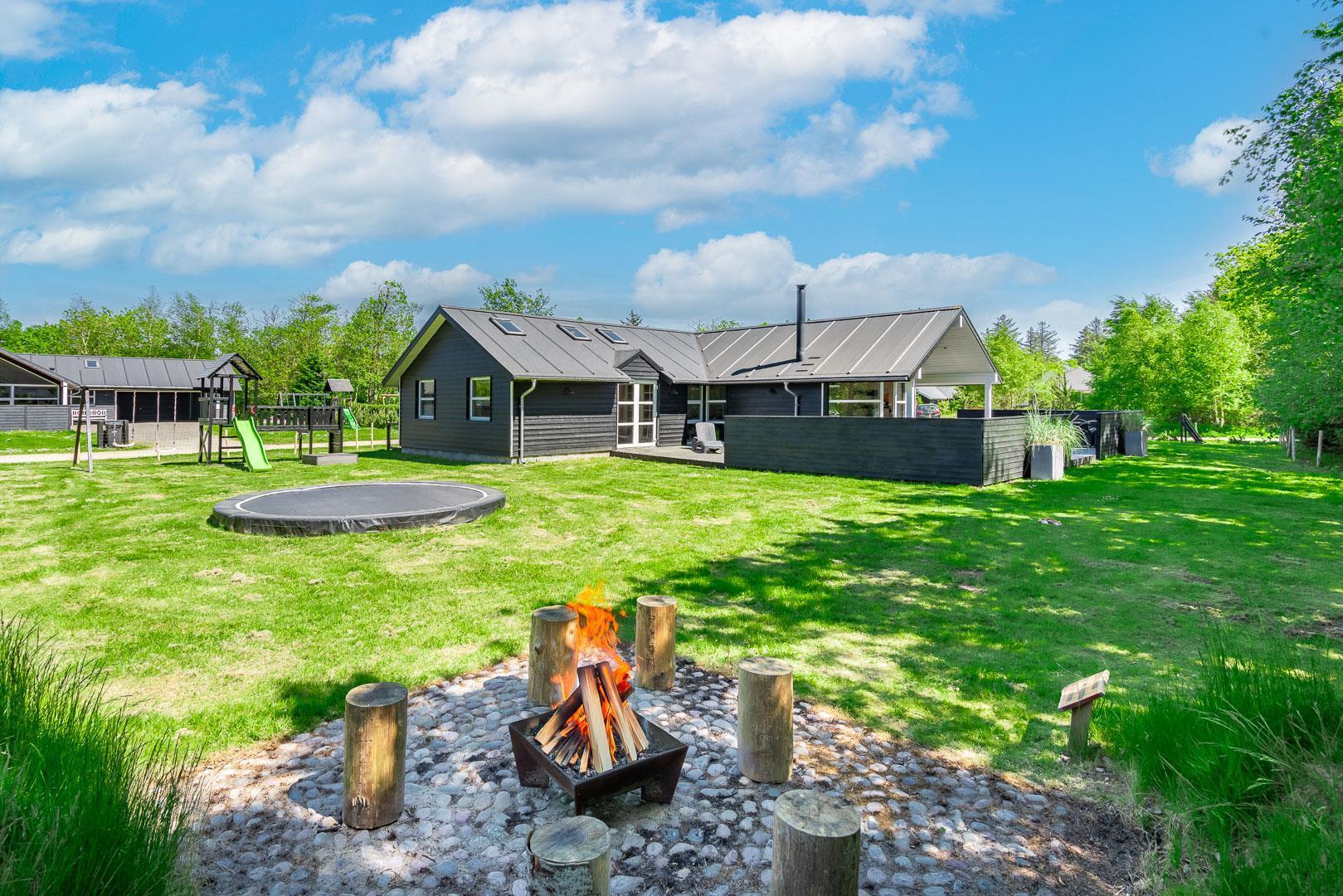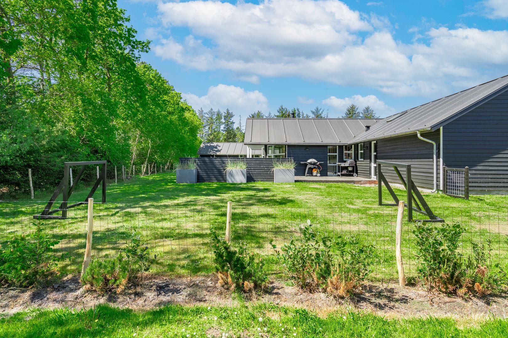 In einem geschlossenen Schotterweg liegt dieses schöne Aktivitätshaus mit Aktivitäten und Herausforderungen für die ganze Familie, draußen und drinnen. Das Ferienhaus macht einen äußerst gepflegten Eindruck und ist sehr praktisch eingerichtet. Große offene, hell eingerichtete Wohnküche mit Dachschrägen und großen Panoramafenstern, Holzofen und Wärmepumpe. Von hier aus gibt es einen direkten Zugang zu mehreren Holzterrassen, die den größten Teil des Hauses umgeben. Hier findet man immer Gemütlichkeit am Grill, es wurde extra ein Gasgrill aufgestellt. Auf dem komplett eingezäunten Grundstück wurde eine gemütliche Lagerfeuerstelle eingerichtet.