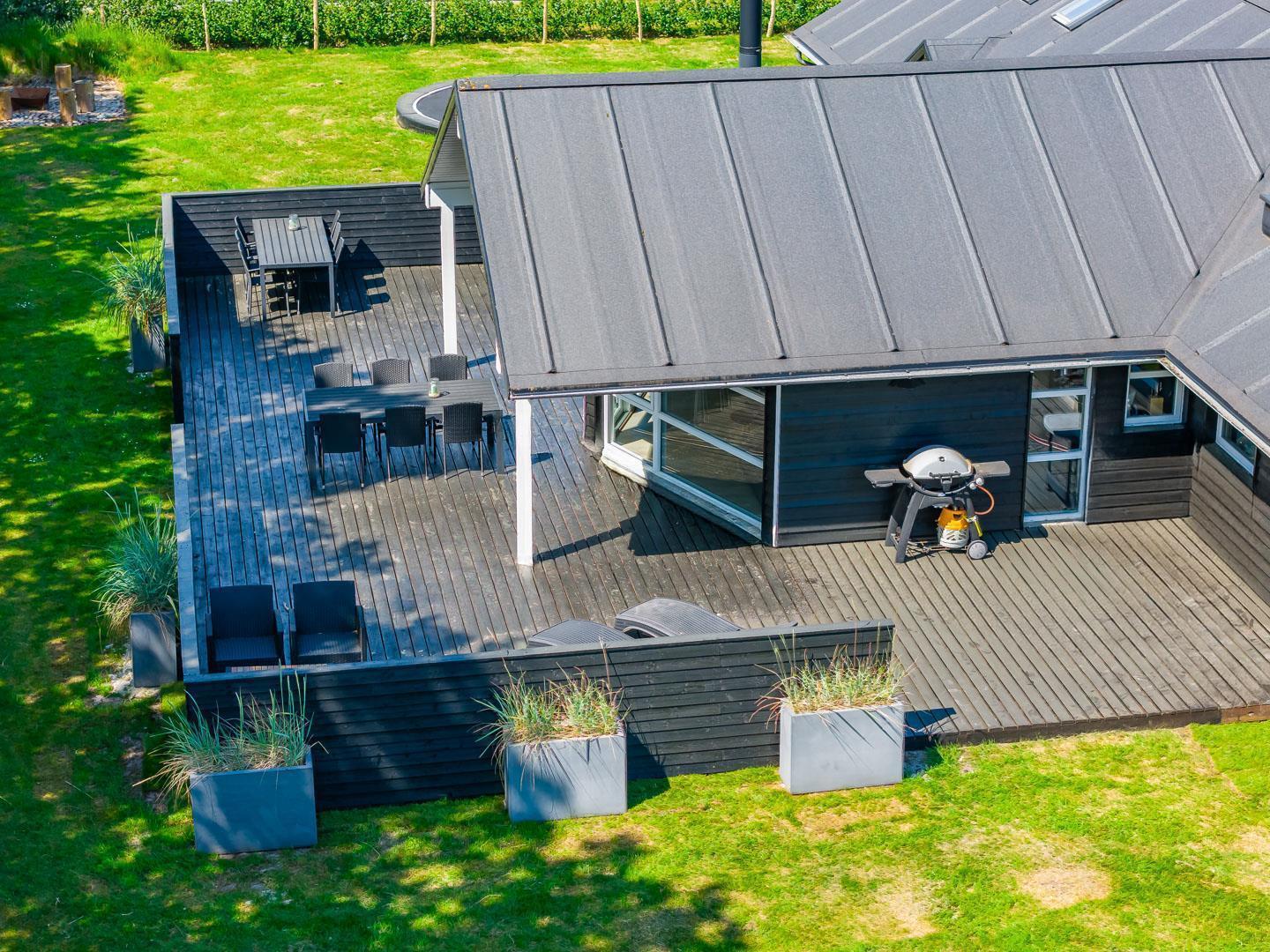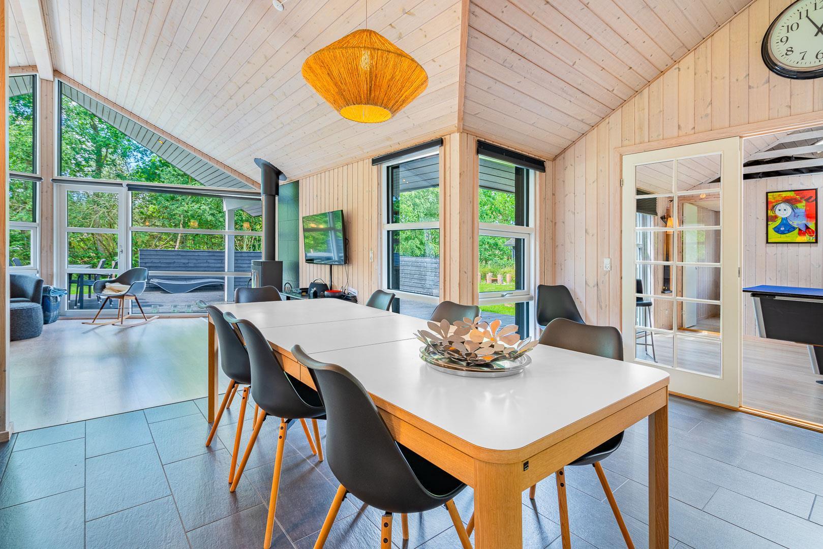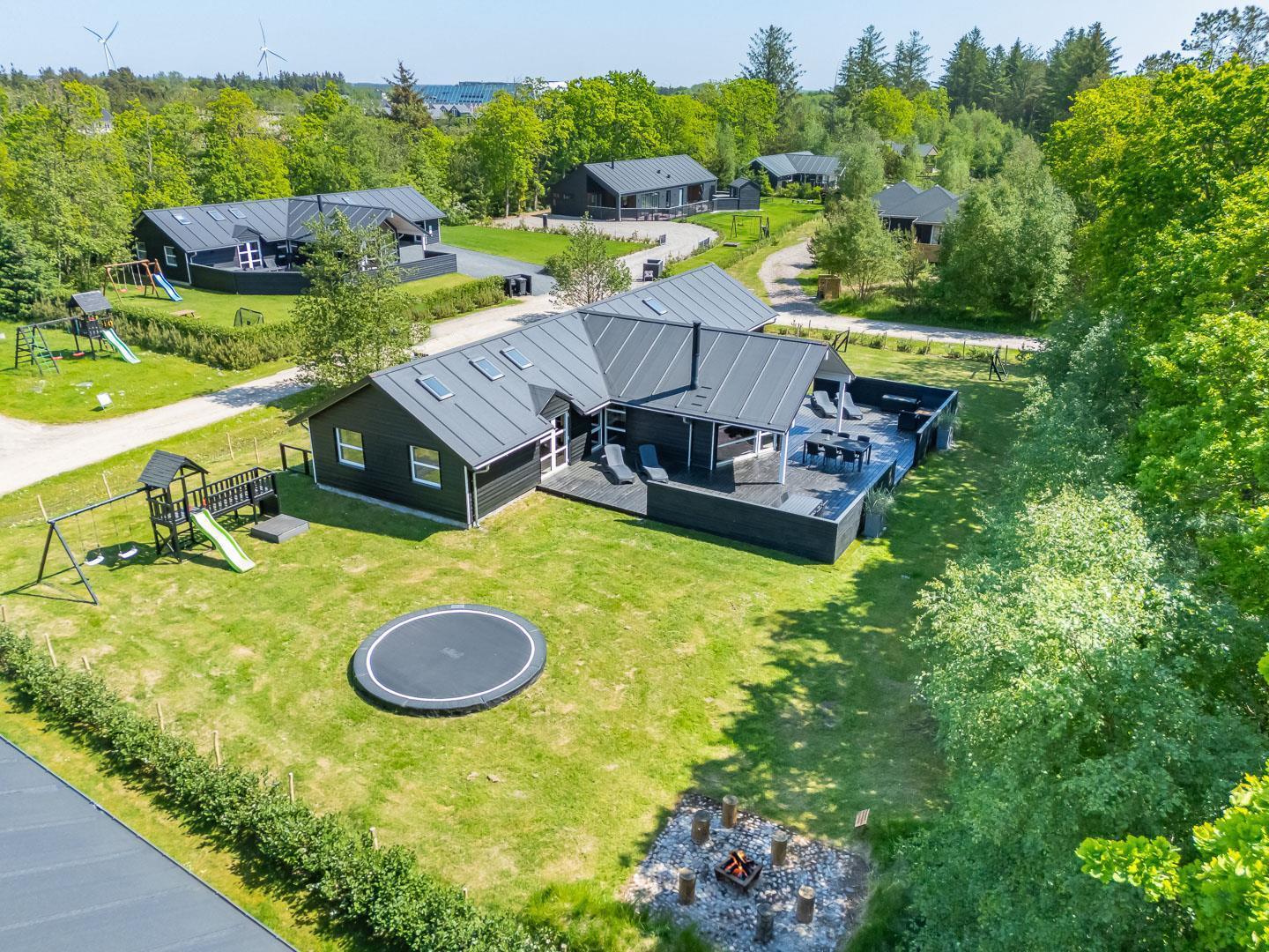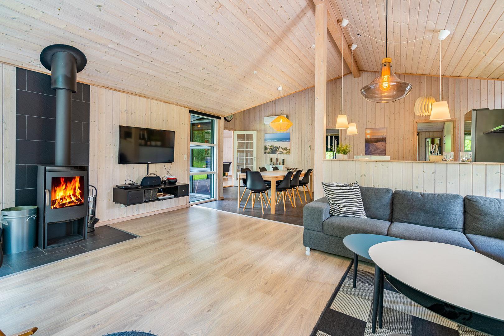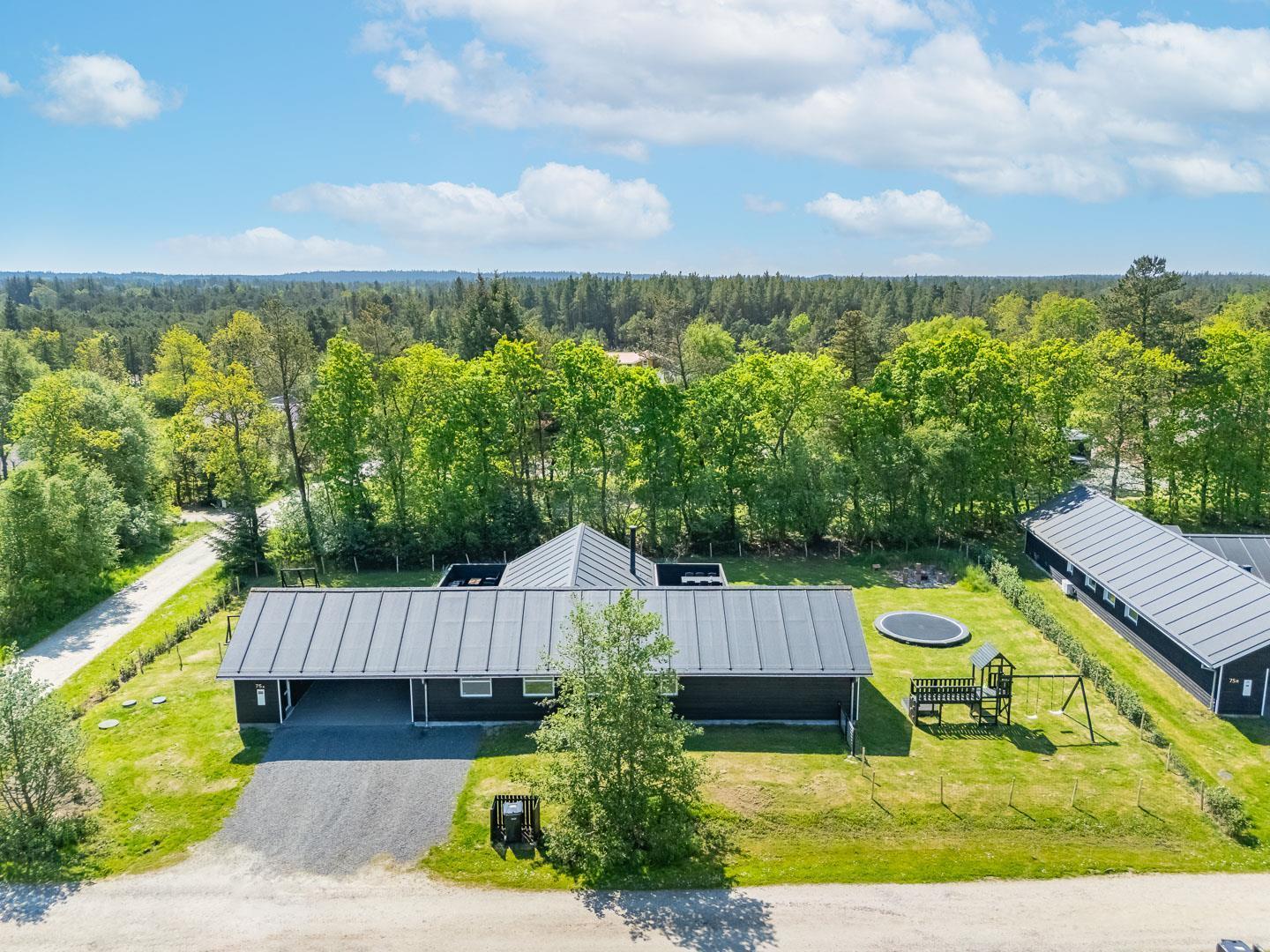 In einem geschlossenen Schotterweg liegt dieses schöne Aktivitätshaus mit Aktivitäten und Herausforderungen für die ganze Familie, draußen und drinnen. Das Ferienhaus macht einen äußerst gepflegten Eindruck und ist sehr praktisch eingerichtet. Große offene, hell eingerichtete Wohnküche mit Dachschrägen und großen Panoramafenstern, Holzofen und Wärmepumpe. Von hier aus gibt es einen direkten Zugang zu mehreren Holzterrassen, die den größten Teil des Hauses umgeben. Hier findet man immer Gemütlichkeit am Grill, es wurde extra ein Gasgrill aufgestellt. Auf dem komplett eingezäunten Grundstück wurde eine gemütliche Lagerfeuerstelle eingerichtet.
