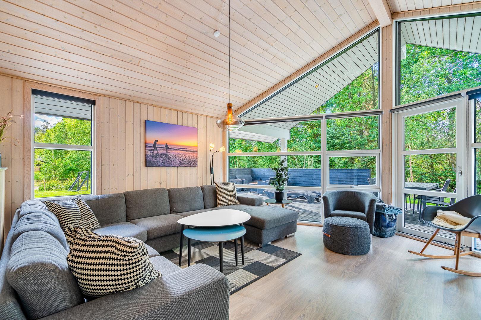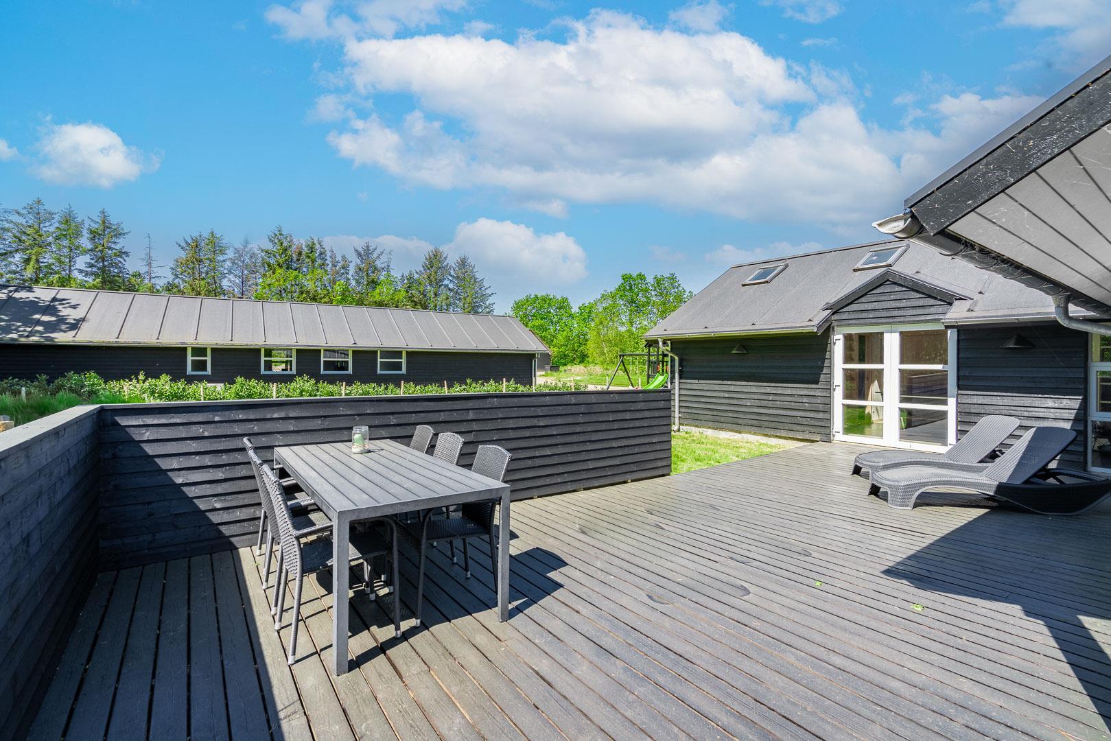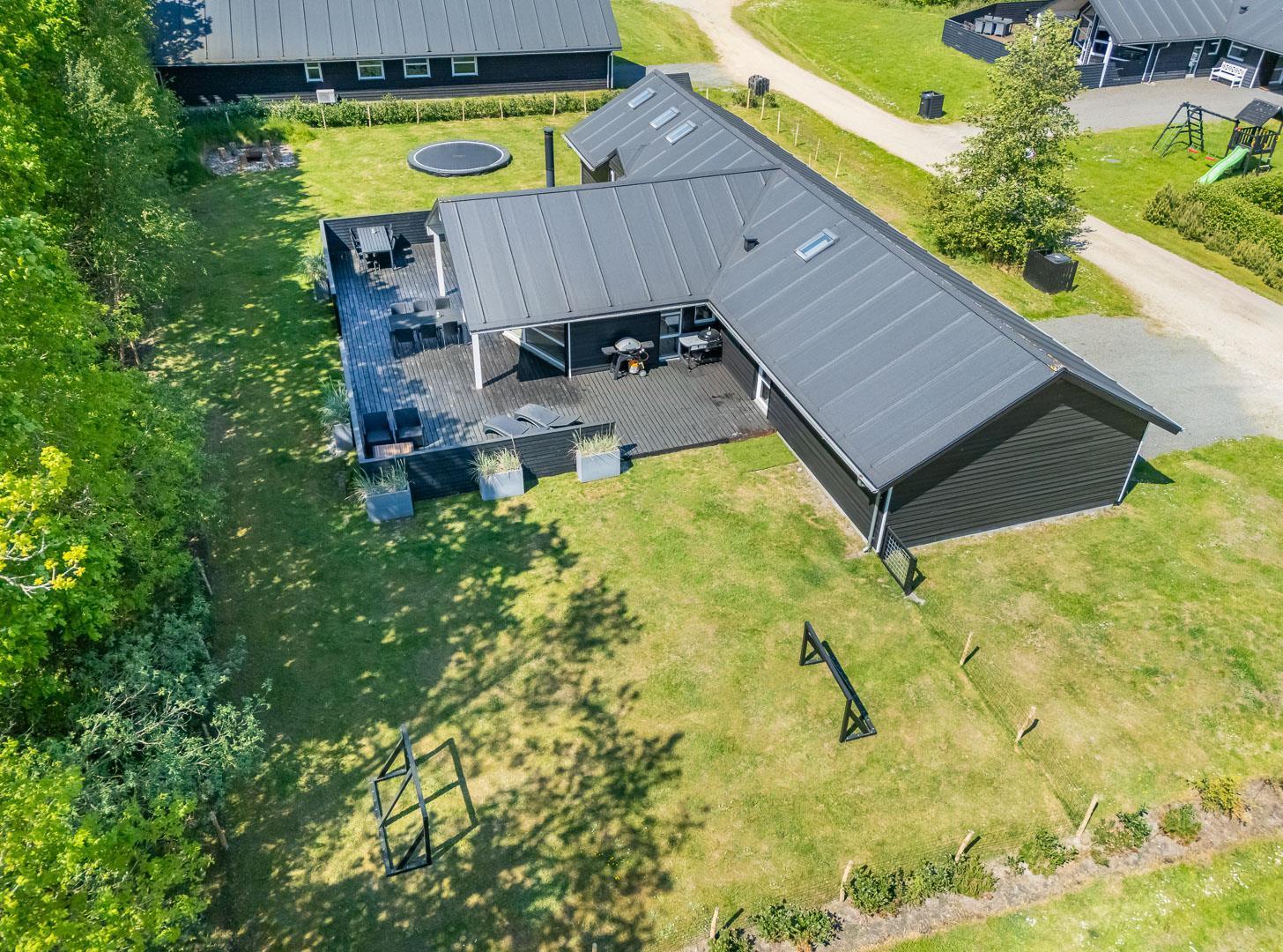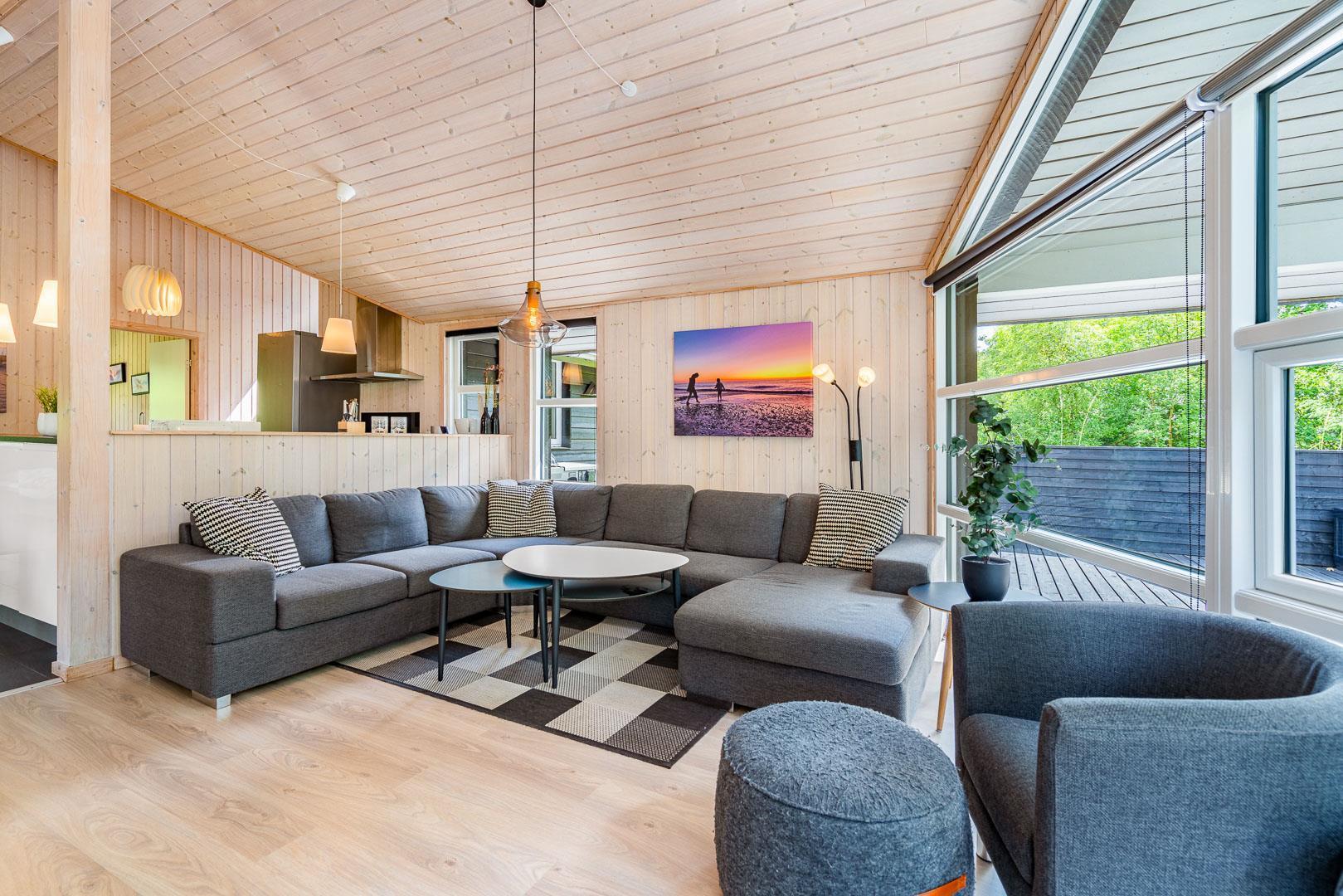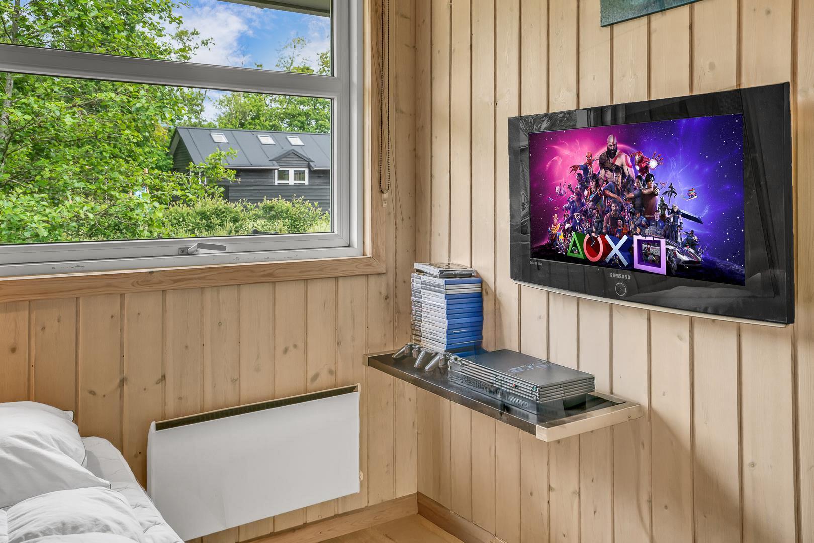 In einem geschlossenen Schotterweg liegt dieses schöne Aktivitätshaus mit Aktivitäten und Herausforderungen für die ganze Familie, draußen und drinnen. Das Ferienhaus macht einen äußerst gepflegten Eindruck und ist sehr praktisch eingerichtet. Große offene, hell eingerichtete Wohnküche mit Dachschrägen und großen Panoramafenstern, Holzofen und Wärmepumpe. Von hier aus gibt es einen direkten Zugang zu mehreren Holzterrassen, die den größten Teil des Hauses umgeben. Hier findet man immer Gemütlichkeit am Grill, es wurde extra ein Gasgrill aufgestellt. Auf dem komplett eingezäunten Grundstück wurde eine gemütliche Lagerfeuerstelle eingerichtet.