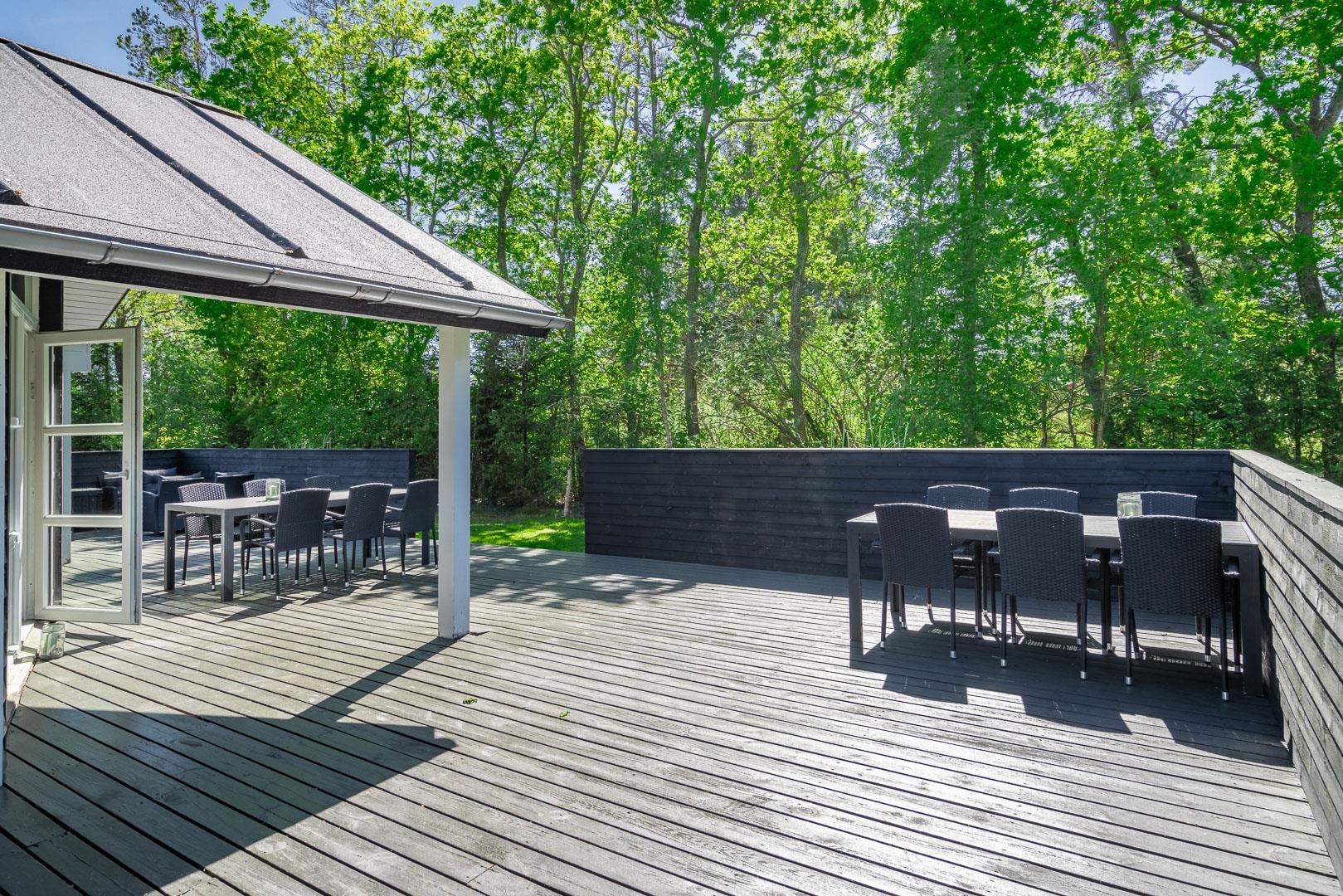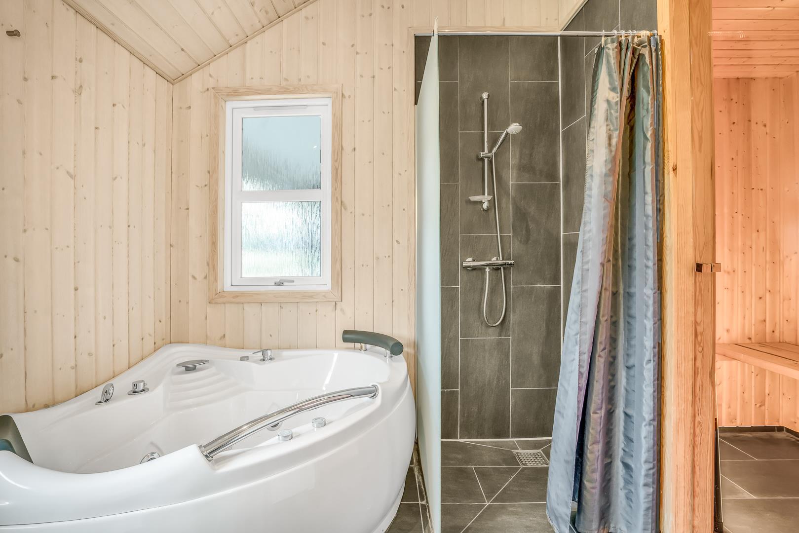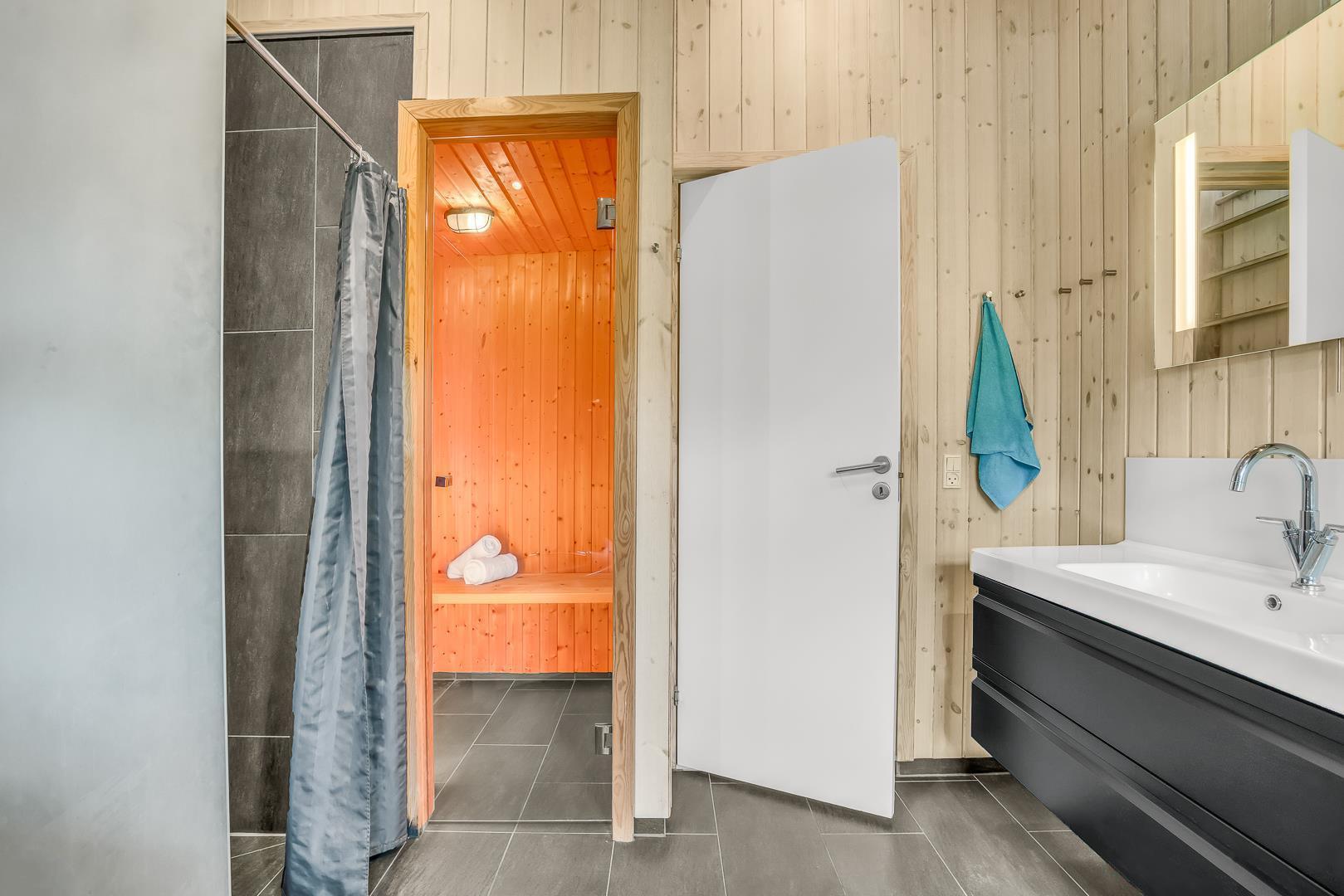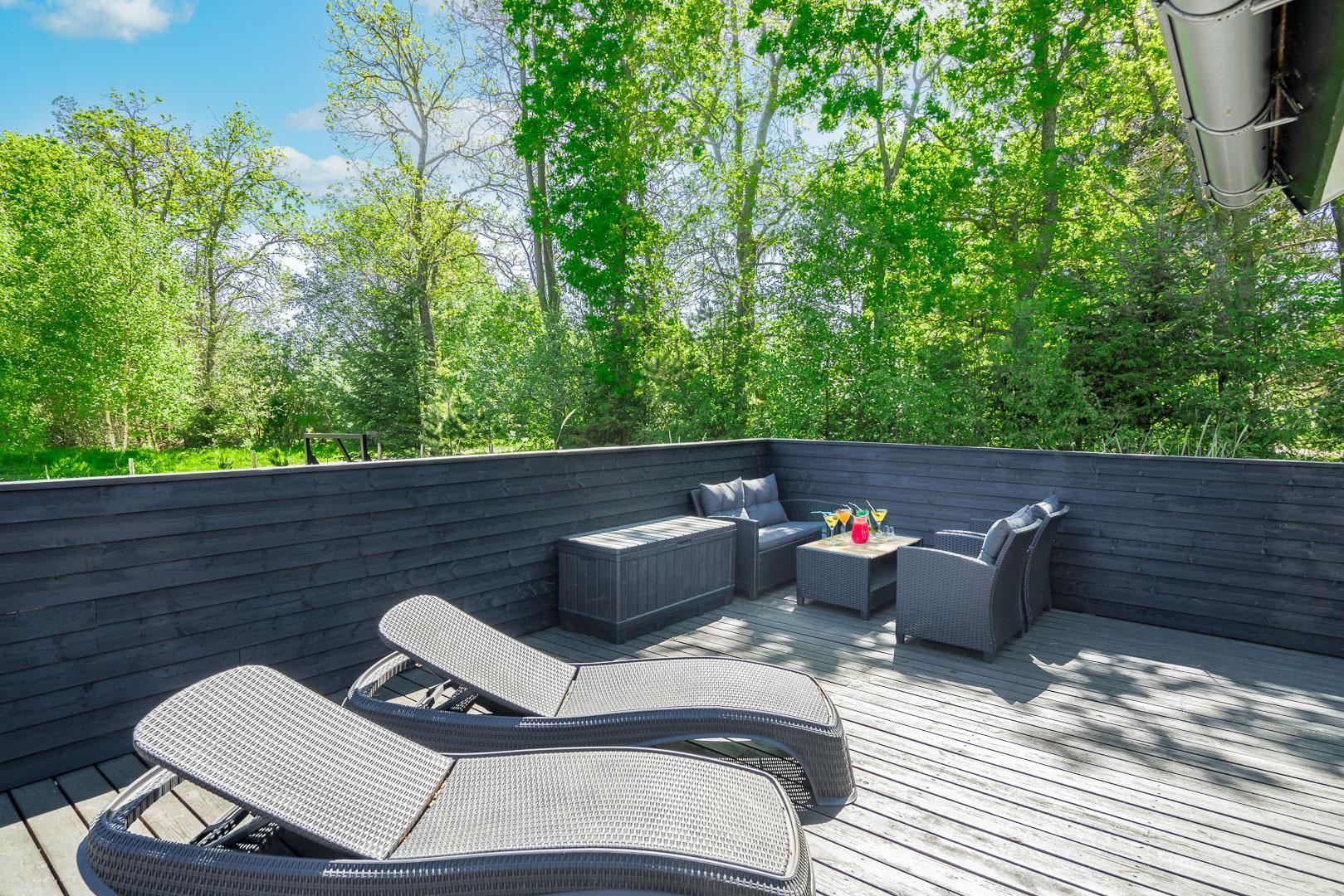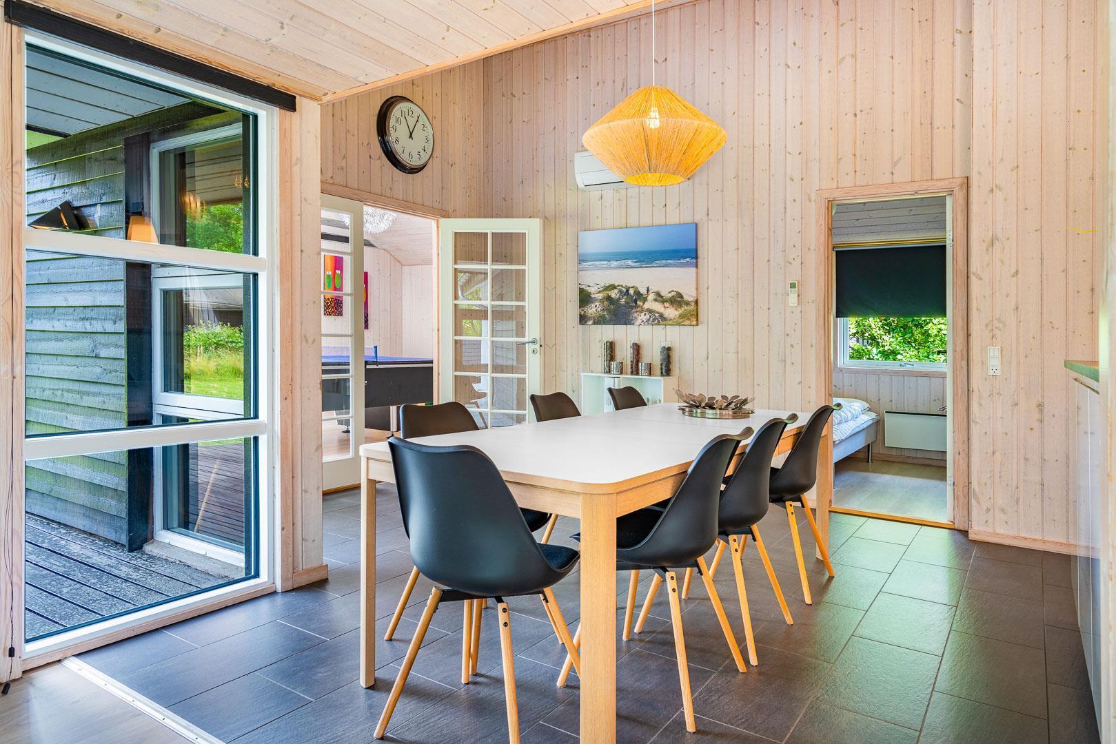 In einem geschlossenen Schotterweg liegt dieses schöne Aktivitätshaus mit Aktivitäten und Herausforderungen für die ganze Familie, draußen und drinnen. Das Ferienhaus macht einen äußerst gepflegten Eindruck und ist sehr praktisch eingerichtet. Große offene, hell eingerichtete Wohnküche mit Dachschrägen und großen Panoramafenstern, Holzofen und Wärmepumpe. Von hier aus gibt es einen direkten Zugang zu mehreren Holzterrassen, die den größten Teil des Hauses umgeben. Hier findet man immer Gemütlichkeit am Grill, es wurde extra ein Gasgrill aufgestellt. Auf dem komplett eingezäunten Grundstück wurde eine gemütliche Lagerfeuerstelle eingerichtet.