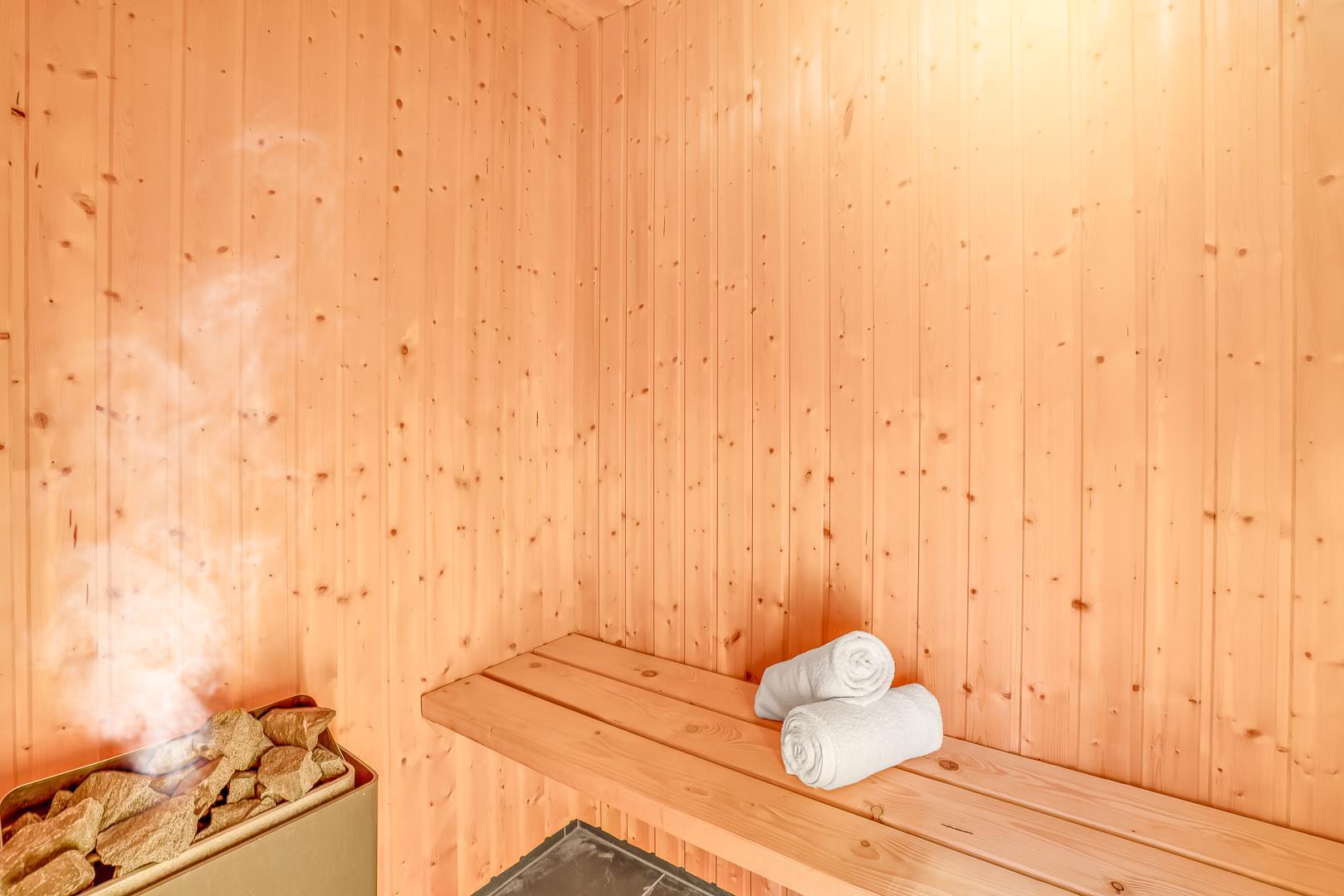 Von hier aus gibt es auch einen direkten Zugang zur Terrasse. 4 gute Schlafzimmer mit Doppelbetten, Badezimmer mit Whirlpool mit Zugang zur Sauna. Es gibt 2 Badezimmer, beide mit Fußbodenheizung.