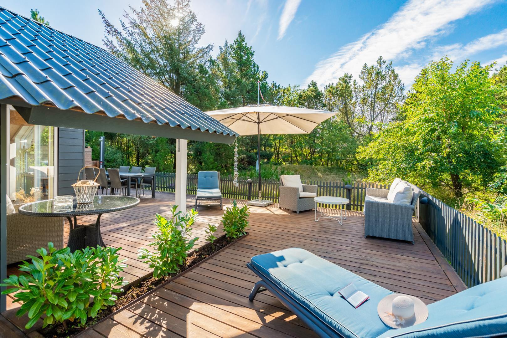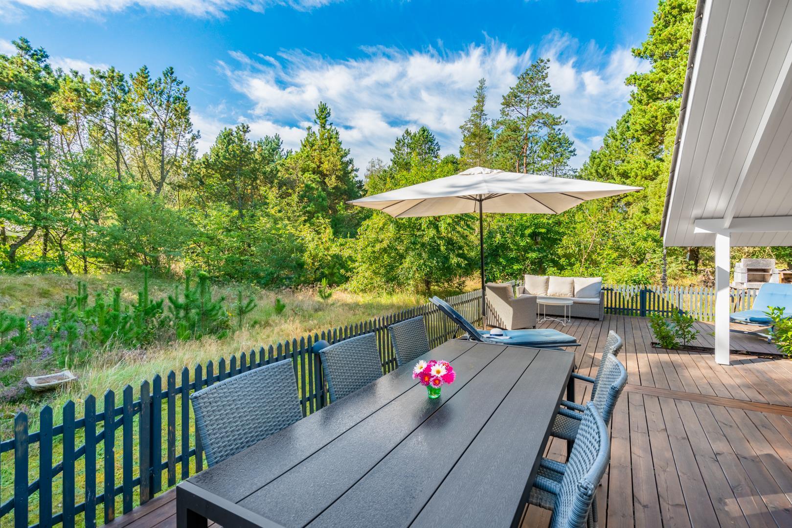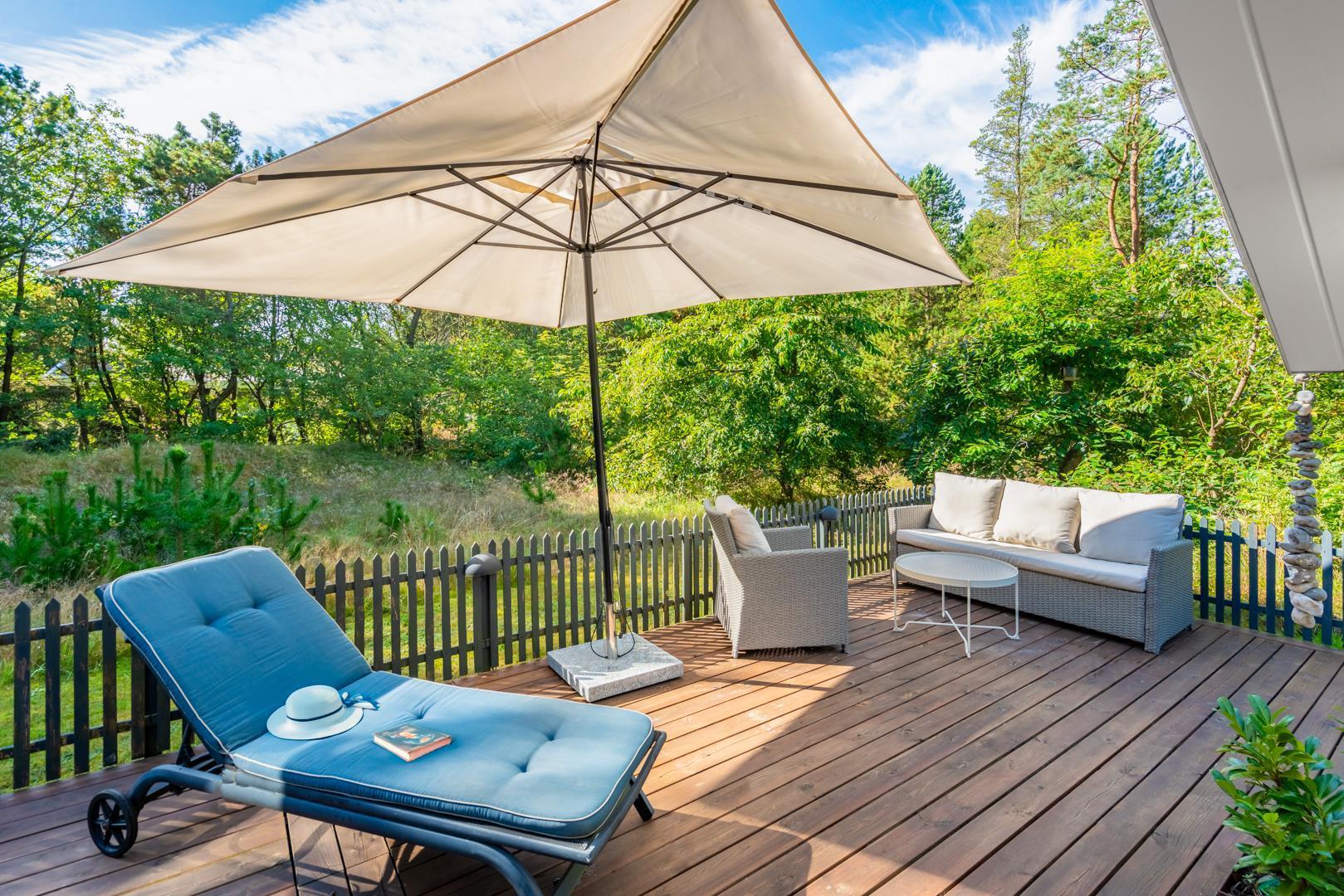 Das Ferienhaus liegt auf einem großzügigen, grünen Grundstück, das vollständig eingezäunt ist und damit Sicherheit und Ruhe zugleich bietet. Auf der überdachten Terrasse könnt ihr den Tag entspannt beginnen oder am Abend bei einem Glas Wein ausklingen lassen. Kinder haben im Garten viel Platz zum Spielen und freuen sich über die Schaukel, während sich euer Hund frei bewegen kann. Ein besonderes Extra ist die Außendusche, die nach einem Bad in der Nordsee oder einem langen Strandtag für Erfrischung sorgt.