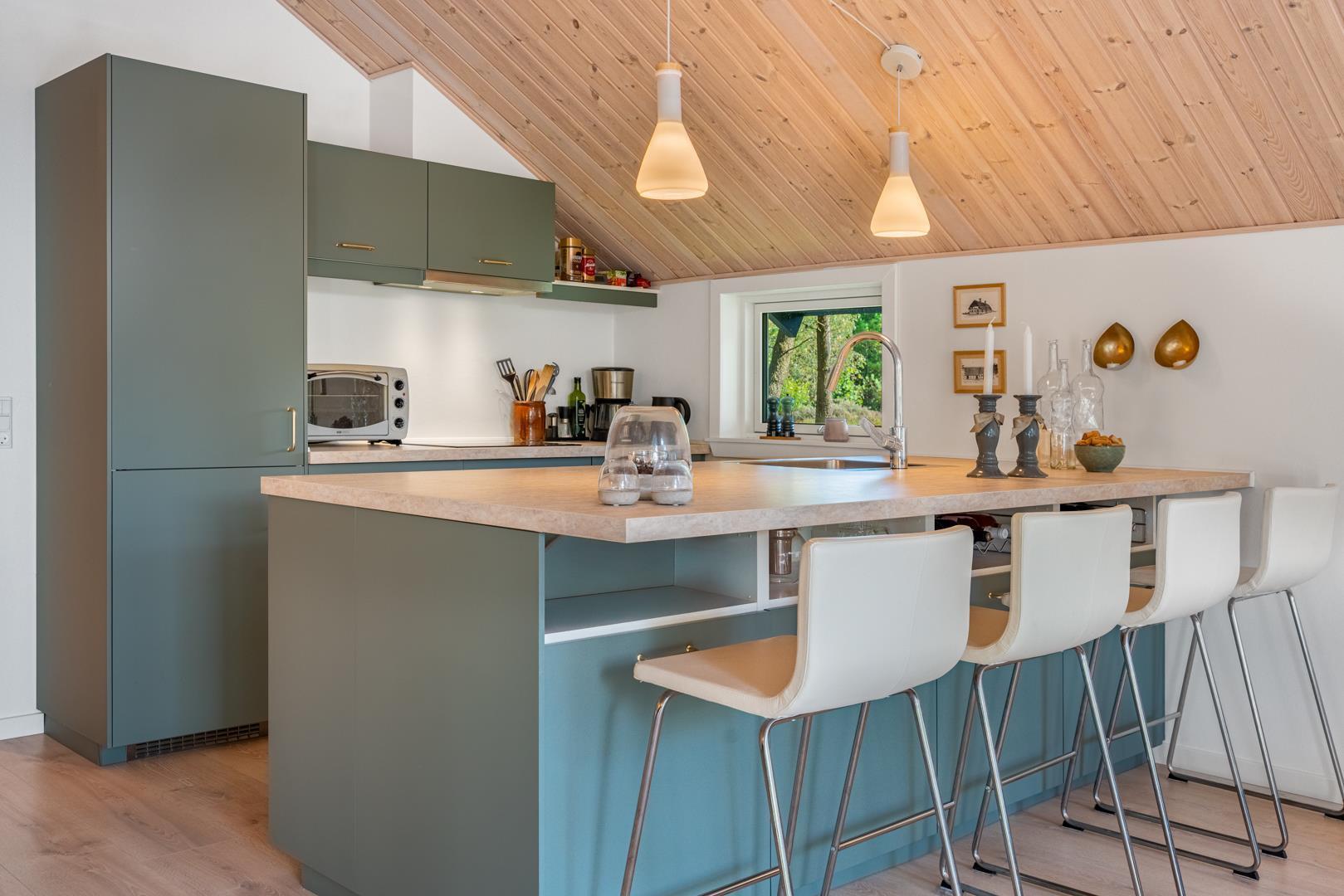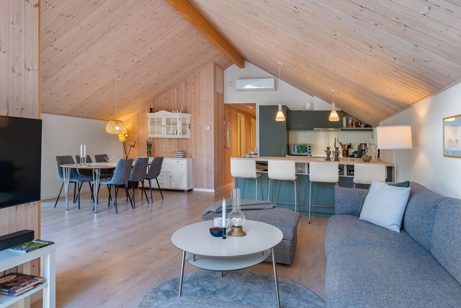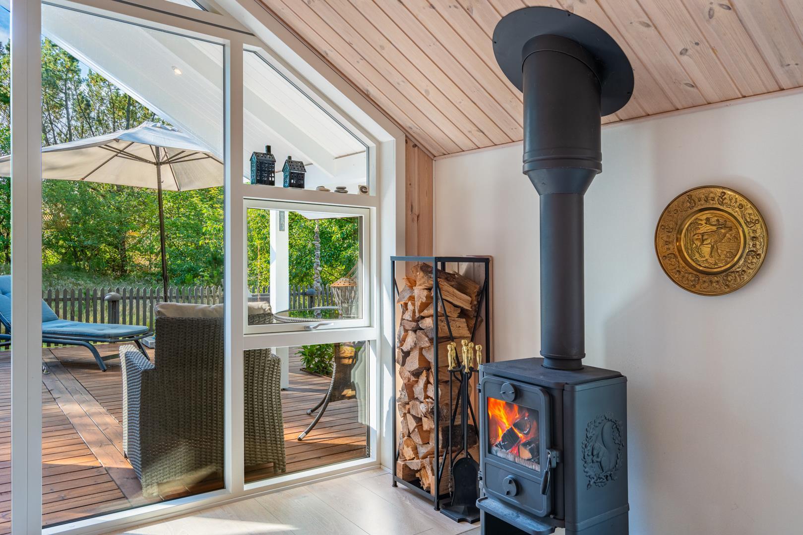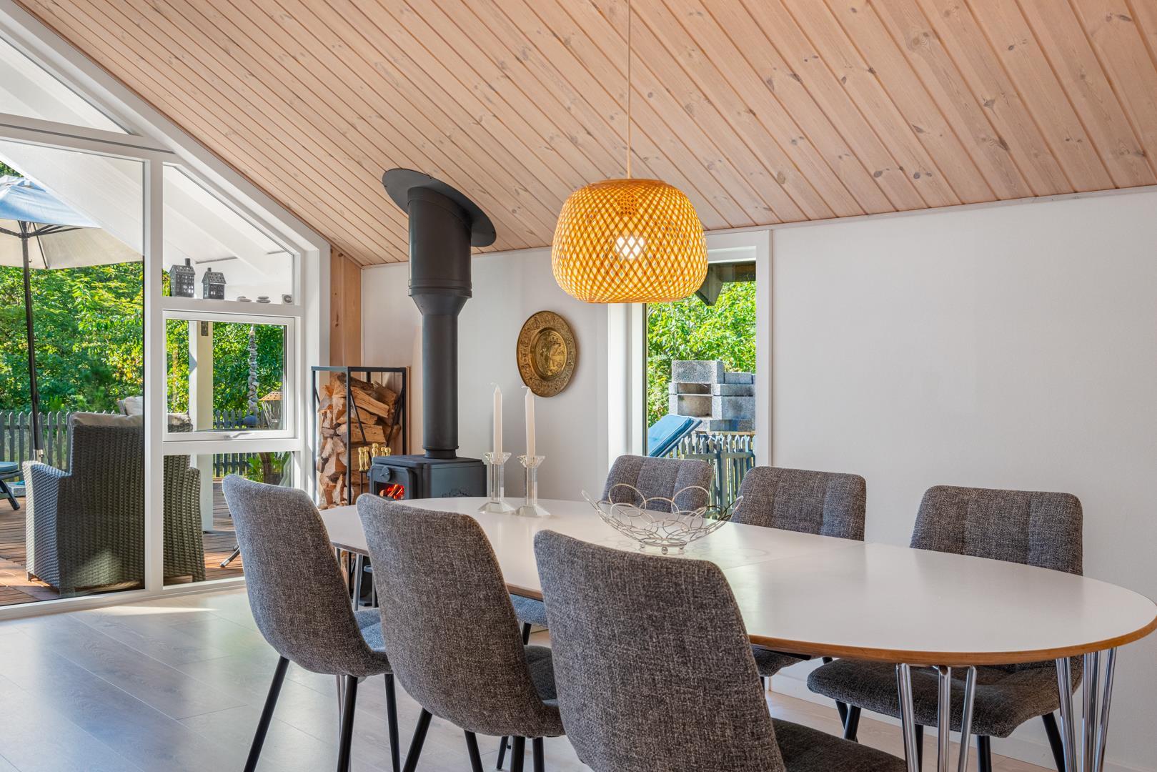 Der offene Wohn- und Essbereich bildet das Herz des Ferienhauses. Große Fenster lassen viel Licht herein und geben den Blick ins Grüne frei, während helle Holzelemente für eine freundliche Atmosphäre sorgen. Der Kaminofen macht den Raum zu einem gemütlichen Treffpunkt an kühlen Tagen, unterstützt von einer energiesparenden Wärmepumpe, die das ganze Jahr über für ein angenehmes Klima sorgt.