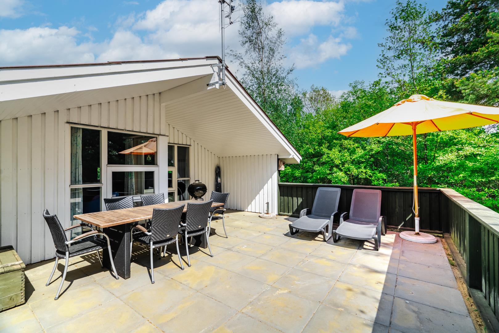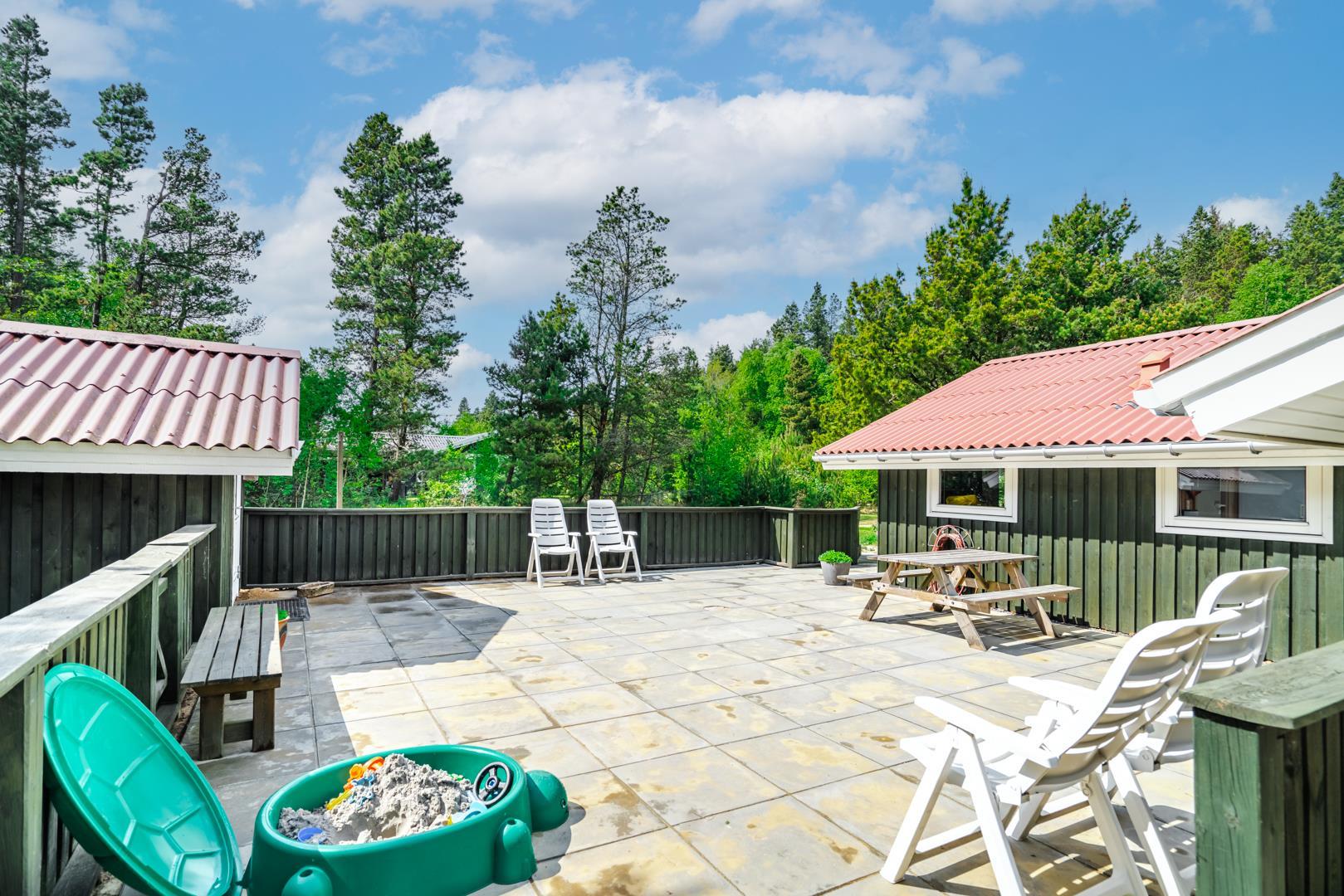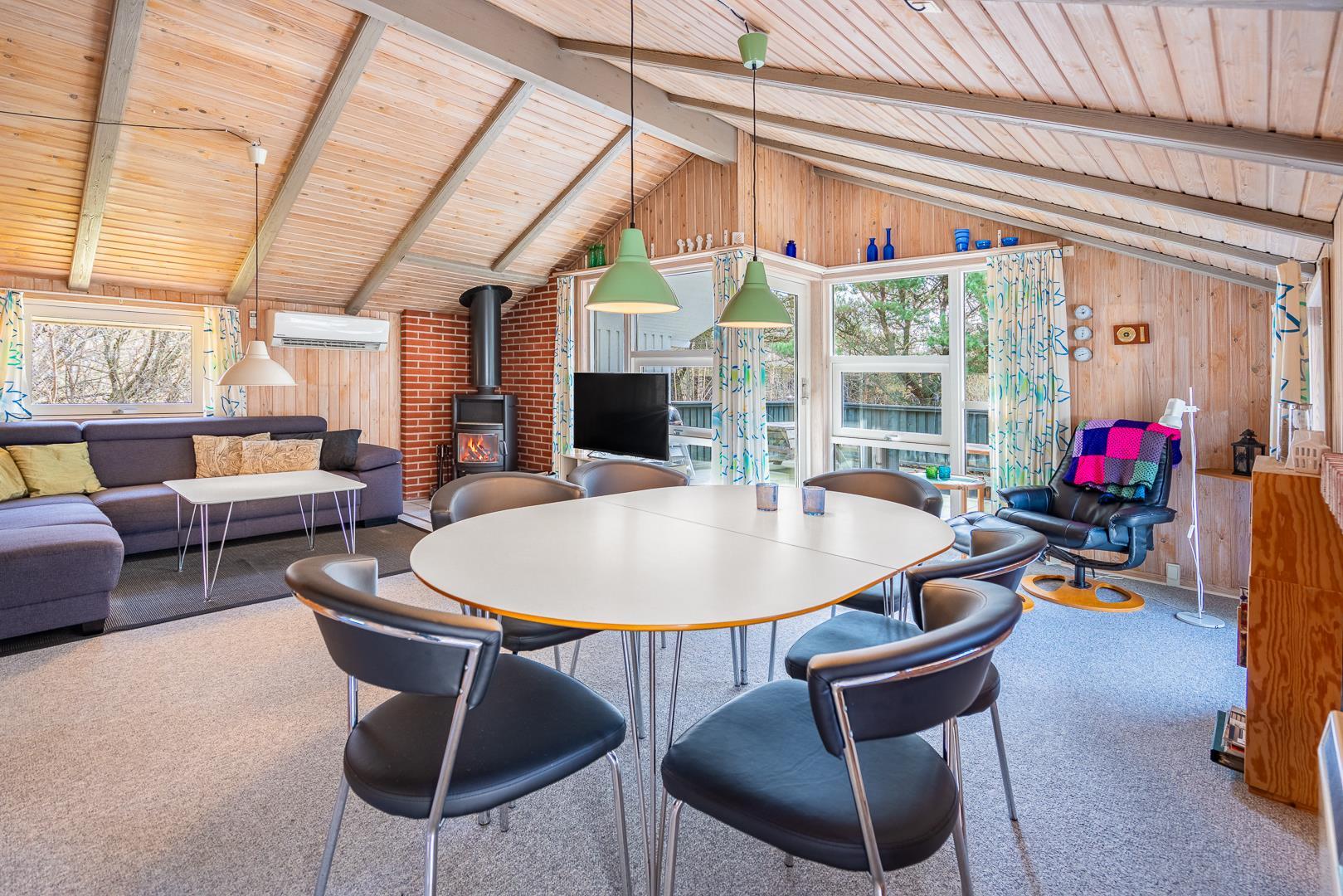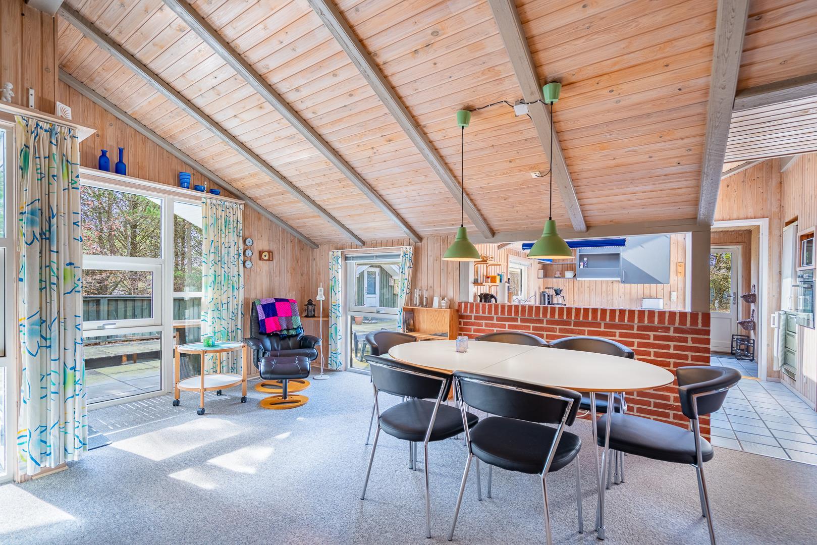 Auf einem schönem Grundstück auf 3000 m2 - mit eingezäunter und überdachter Terrasse, liegt dieses gut gepflegte Ferienhaus mit Platz für 6 Personen. Die Einrichtung ist hell und freundlich. Praktischer Hauswirtschaftsraum mit Waschmaschine und Trockner. Funktionelle Küche mit Dachfenster, Spülmaschine, Mikrowelle und extra Gefrierschrank mit 50 L.