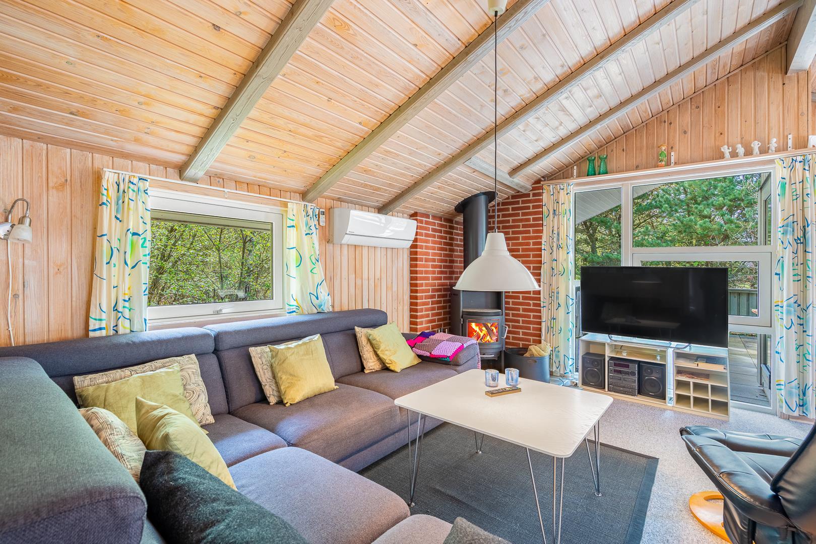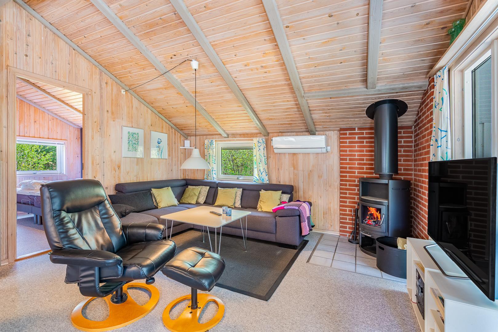 Badezimmer mit Fußbodenheizung und Zugang zur Sauna. 3 gute Schlafzimmer, von denen 2 mit Einzelbetten und 1 mit Doppelbett sind. Das Wohnzimmer ist ausgestattet mit TV, Kaminofen und Wärmepumpe, die energiesparend ist und für ein gutes Innenklima sorgt. Das Haus liegt auf einem Naturgrundstück mit Möglichkeit zum Fußballspielen vor dem Haus. Rauchen nicht erlaubt. 1 Hund ist erlaubt.