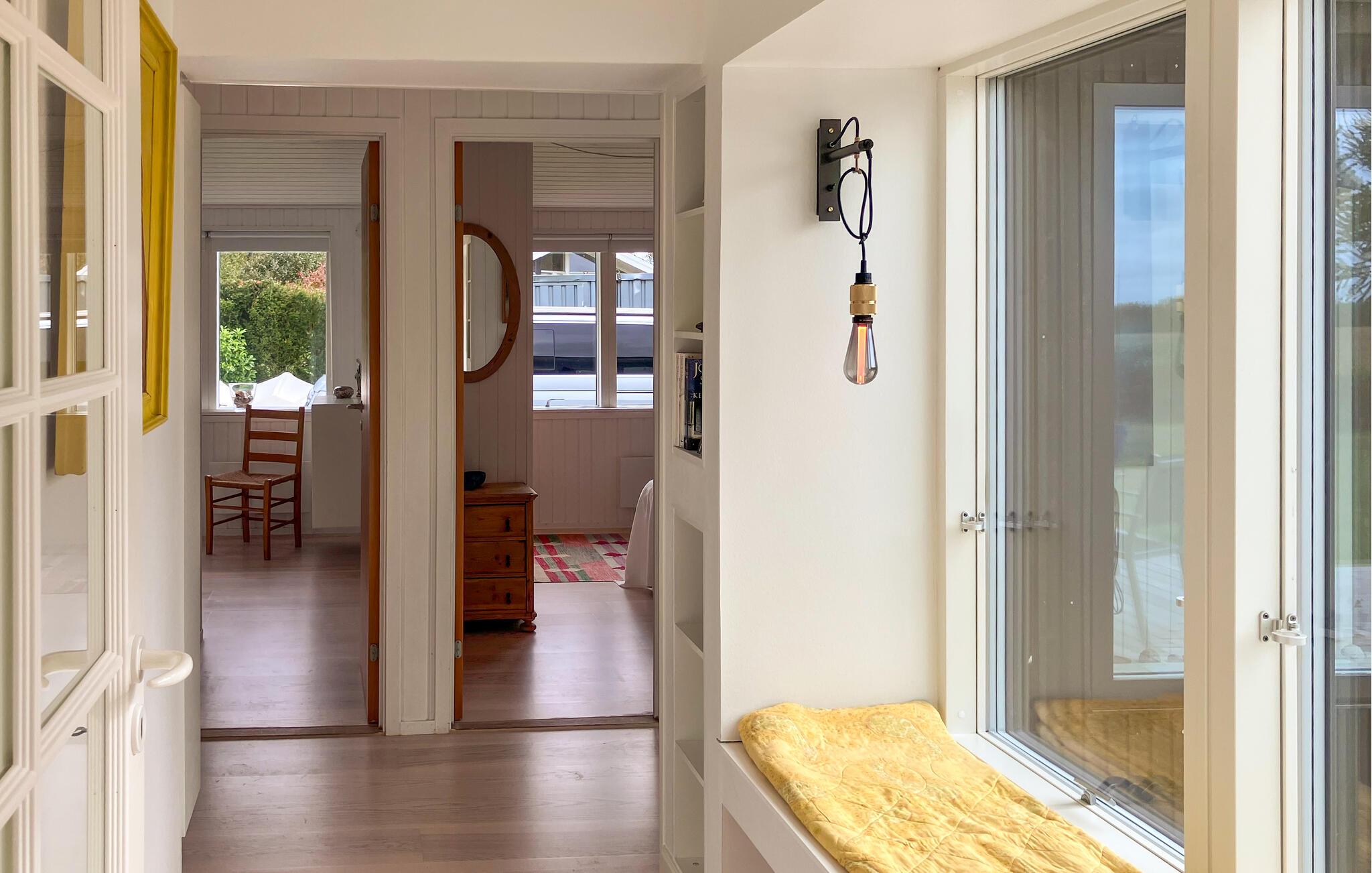 Genießen Sie stilvolle Urlaubstage in diesem schönen Ferienhaus mit Blick auf Fjord und Wiesen.