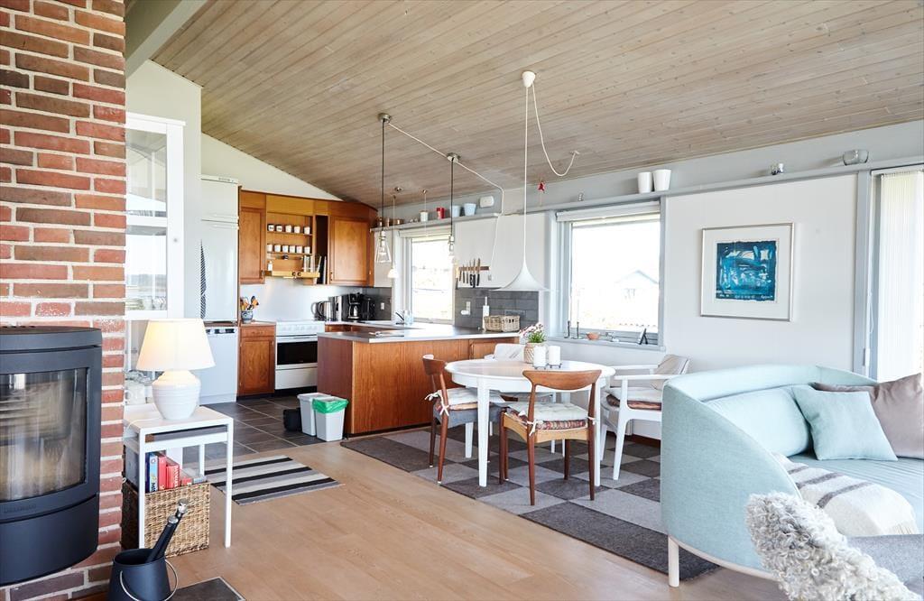 In diesem Haus wirst du sofort in Ferienstimmung versetzt und dich entspannen. Die Küche ist offen in das Wohnzimmer integriert und erlaubt dem Koch oder der Köchin während der Essenszubereitung ein Teil der Gemeinschaft zu sein. Entzünde ein Feuer im Kaminofen und genieße eine Flasche Wein beim entspannten Gespräch, während deine Kinder am Abend in Ihren Betten liegen.