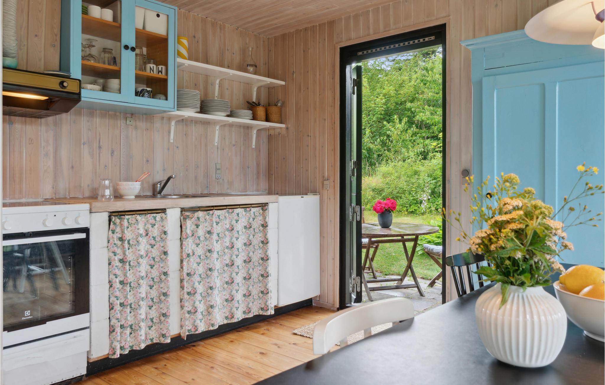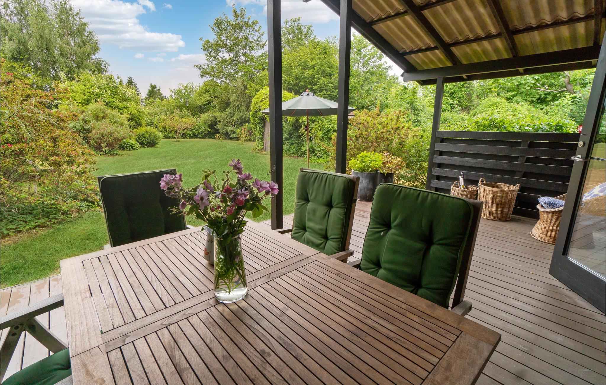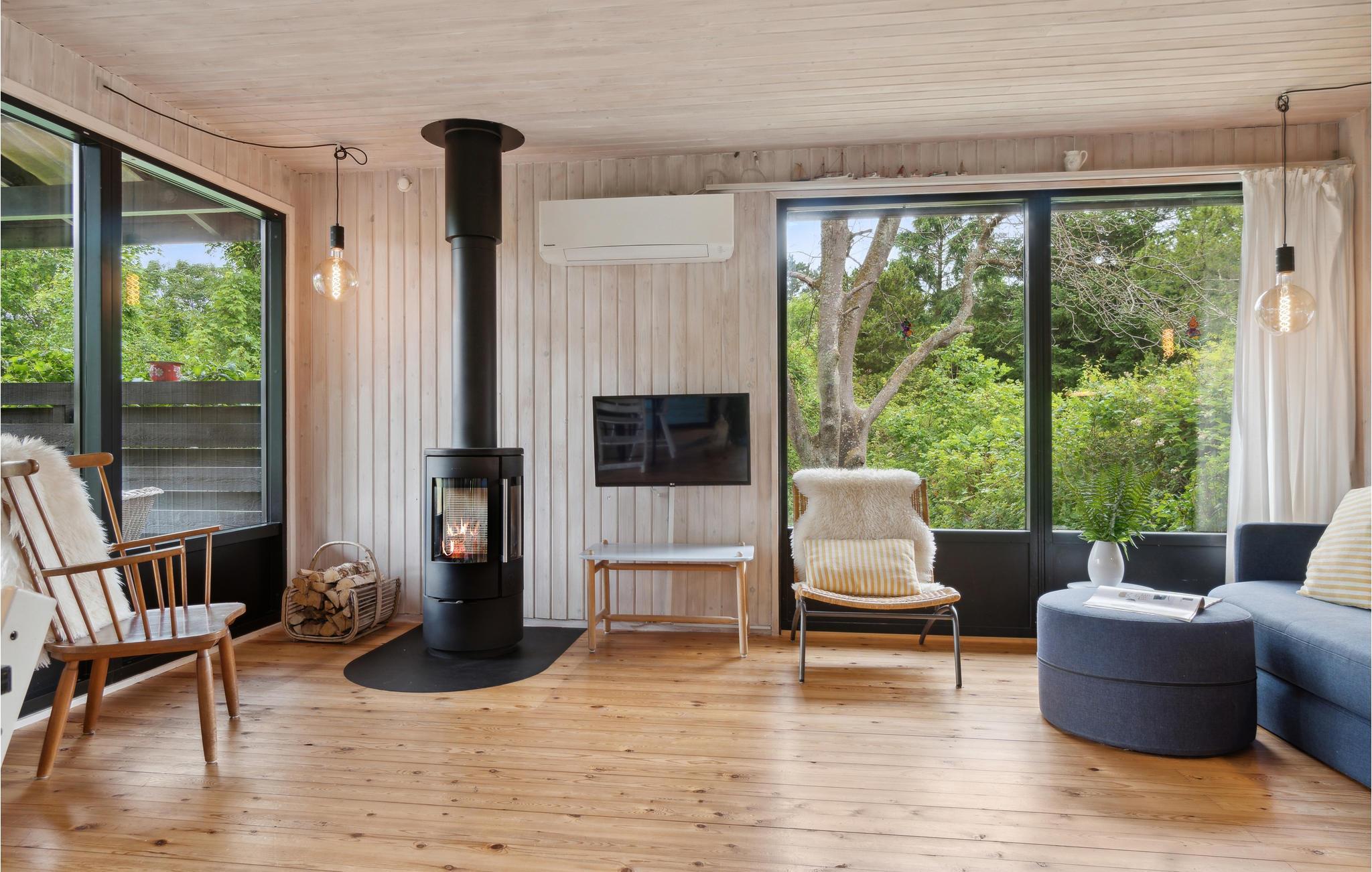 Umgeben von Bäumen erwartet Sie dieses ansprechende Ferienhaus. Die wohnlich gestalteten Räume laden zum Entspannen ein, die holzverkleideten Wände und der schöne Blick ins Freie durch bodentiefe Fenster sorgen dafür, dass Sie sich hier gleich wohlfühlen. Machen Sie es sich abends auf dem Sofa bequem, feuern Sie im Kaminofen an, der eine behagliche Wärme verströmt, und plaudern Sie noch lange.