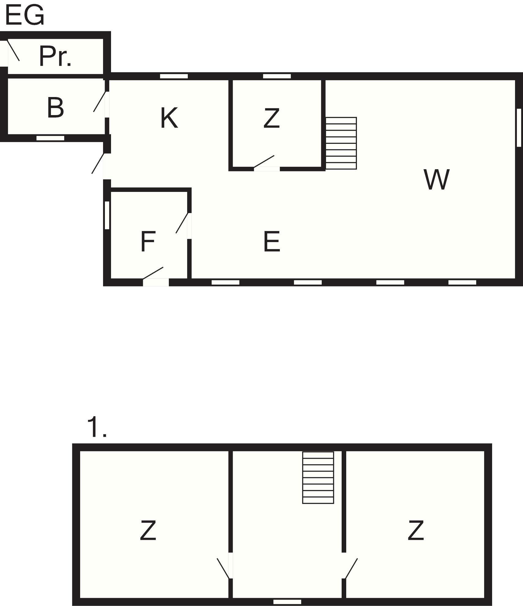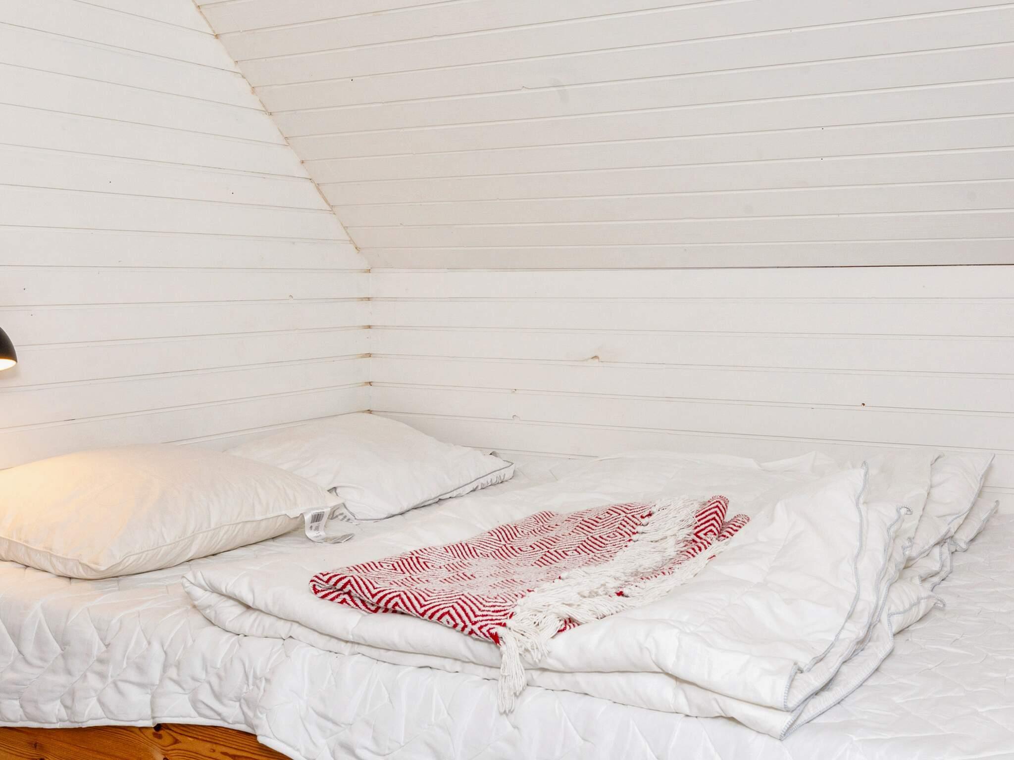 Oben im Dachgeschoss des Hauses liege zwei der insgesamt drei Schlafzimmer, beide mit Doppelbett ausgestattet. Zudem gibt es oben einen kleinen Absatz neben der Treppe z.B. für Garderobe. Das Erdgeschoss verfügt über einen großen, offenen Küchen-/Wohnbereich für das Familienleben, inklusive Essecke und Holzofen für kühlere Abende. Außerdem liegen unten das dritte Schlafzimmer mit doppelter Schlafcouch sowie das Badezimmer mit Dusche und angenehmer Fußbodenheizung.