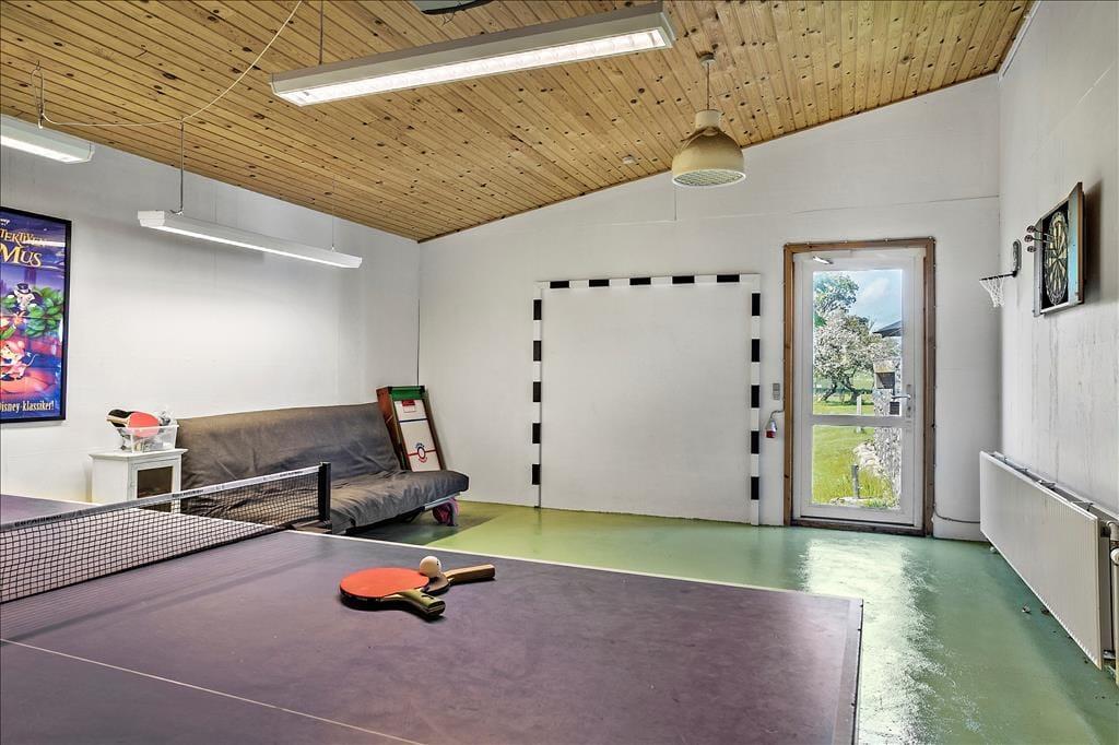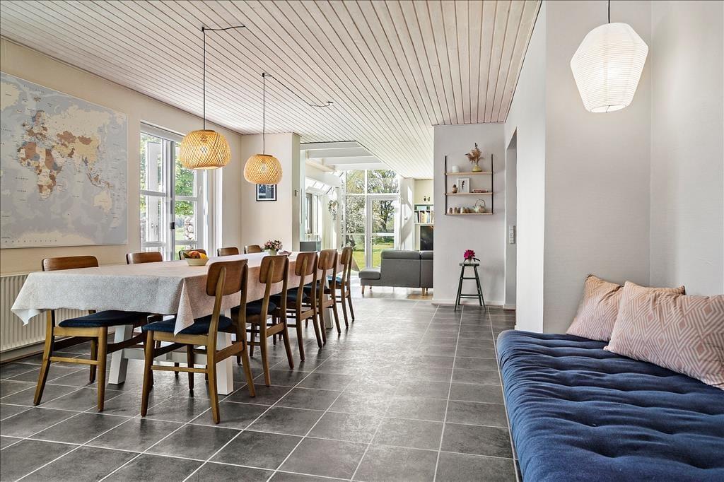Das Herzstück des Hauses bildet der große Küchenbereich samt angrenzendem Esszimmer, um dessen Esstisch sich alle Mitreisenden gemeinsam in gemütlicher Runde versammeln können. In direkter Verbindung zum Esszimmer lockt darüber hinaus auch der Wohnraum, der mit einem schönen Sofa und einer fantastischen Aussicht über den Garten und die umliegenden Felder zu bestechen weiß. Ein Fernseher mit dänischen, deutschen, schwedischen und norwegischen Sendern ist vorhanden. Der Fernseher verfügt zudem über Chromecast, sodass Sie Ihre bevorzugten Internetinhalte über Ihr eigenes Streamingabo auf den Fernseher übertragen können. Die Internetgeschwindigkeit beträgt 100/100 Mbit. Für ein Maximum an Behaglichkeit und echter Ferienhausstimmung sorgt der im Wohnraum platzierte Holzpelletkaminofen, der Ihre gemütlichen Abende mit einem spannenden Film oder einem guten Buch wunderbar untermalt. Vom Esszimmer aus haben Sie direkten Zugang zu einer der hauseigenen Terrassen, auf der Sie bereits von einem schönen Essplatz und einem großen Gasgrill erwartet werden. Hier werden Sie sicherlich oft beisammensitzen und in aller Ruhe grillen. Die tolle Küche ist mit sämtlichen modernen Annehmlichkeiten ausgestattet und ermöglicht Ihnen somit die problemlose Zubereitung köstlichster Urlaubsmahlzeiten. Im Hauswirtschaftsbereich steht neben einer Waschmaschine und einem Wäschetrockner auch ein Gefrierschrank für Sie bereit. Auf täglich saubere Handtücher und das ein oder andere wunderbar erfrischende Eis müssen Sie in diesem Ferienhaus also keinesfalls verzichten. Für viel Begeisterung wird besonders bei den jüngeren Urlaubern der richtig gute Aktivitätsraum sorgen, der mit einer Tischtennisplatte, einer Dartscheibe und einer Wii-Spielekonsole zu überzeugen weiß. Zweifelsohne werden Sie mit Ihrer Familie in diesem Raum viele vergnügte und gesellige Stunden verleben. In Verbindung zum Aktivitätsraum erwartet Sie ein überaus gemütlicher Schlafraum mit einem hohen Doppelbett. Nahe des Hauseingangs befindet sich ein weiterer Schlafraum, der ebenfalls über ein Doppelbett verfügt. Im Erdgeschoss ist außerdem auch ein Badezimmer mit einem WC und einer Dusche platziert.