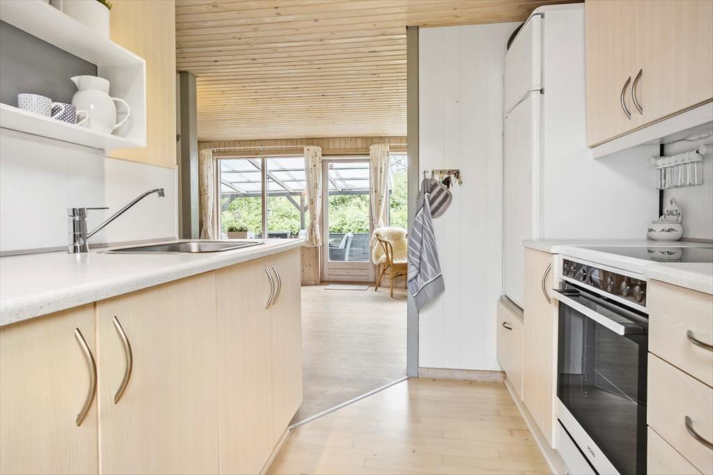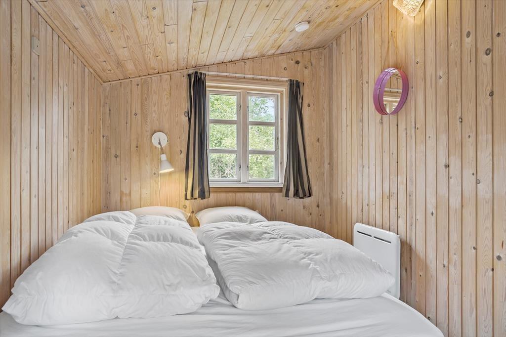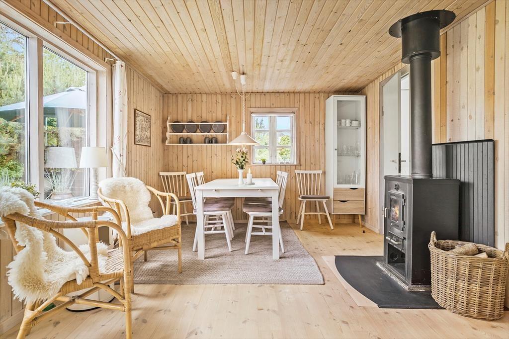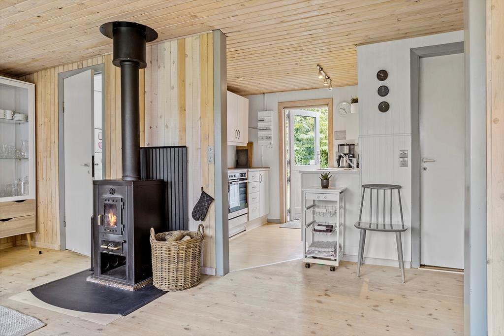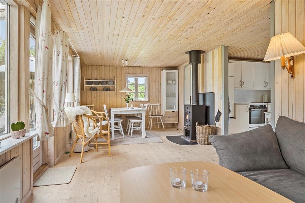 Dieses Ferienhaus ist ein richtiges Sommerhaus, gemütlich eingerichtet und ideal für den gemeinsamen Urlaub. Vom Eingangsbereich aus haben Sie einen direkten Zugang zur offenen Wohnküche. Der Wohnraum ist mit Sitzgruppe, TV, Kaminofen, und Essbereich ausgestattet. Das Haus verfügt über 5 Schlafplätze verteilt auf zwei Zimmer mit Doppelbett sowie ein Zimmer mit doppelter Schlafcouch. Ein Schlafzimmer mit dem Doppelbett hat Zugang von außen. Badezimmer mit Dusche.