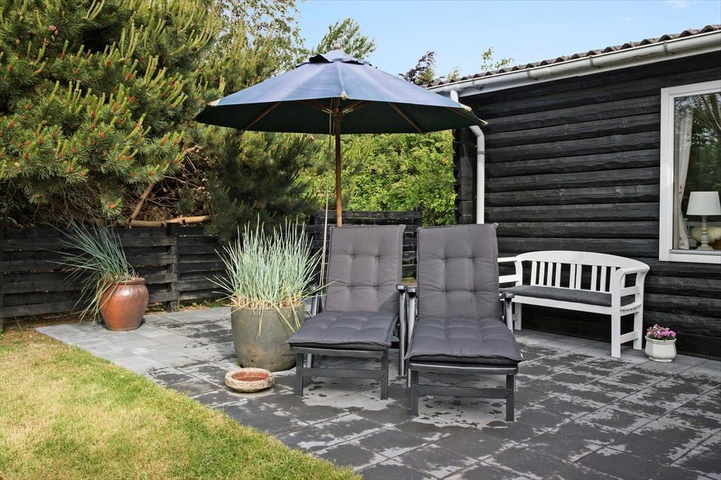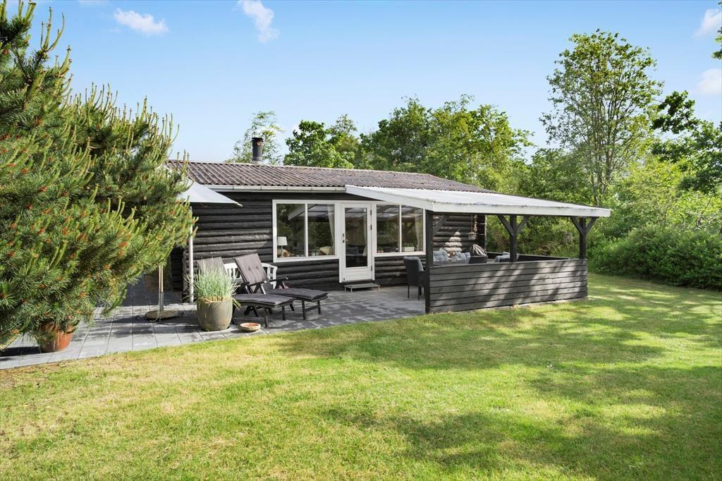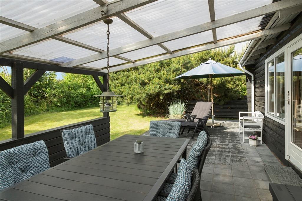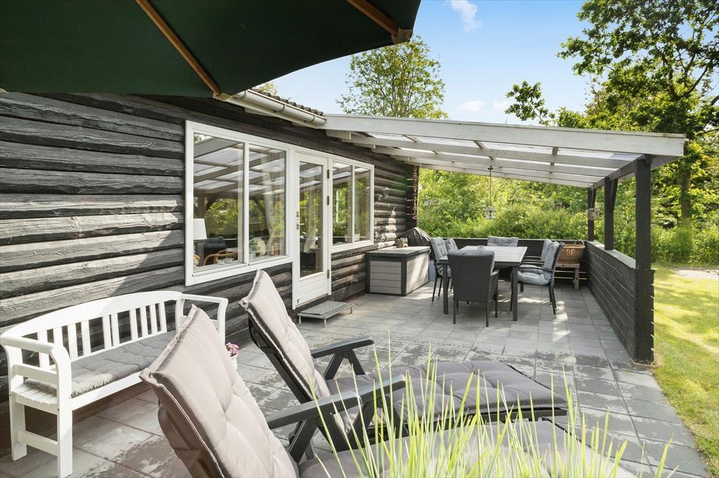 Vom Wohnzimmer aus gelangt man auf die Terrasse des Ferienhauses, die sowohl aus einem überdachten als auch aus einem offenen Teil besteht, sowie aus Gehwegen rund um das gesamte Haus. Das Ferienhaus befindet sich weit hinten auf einem großen Grundstück und ist daher sehr privat. Das Grundstück ist groß und bietet reichlich Gelegenheit für viele Aktivitäten im Freien, einschließlich Gemütlichkeit am Lagerfeuer.