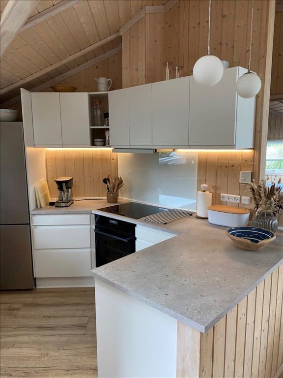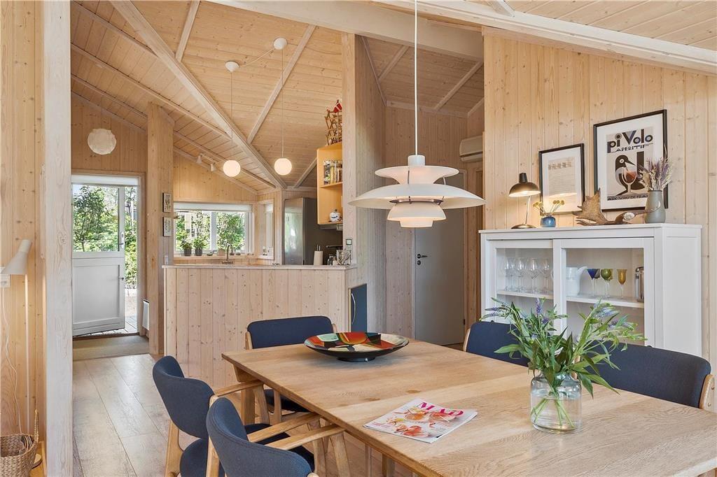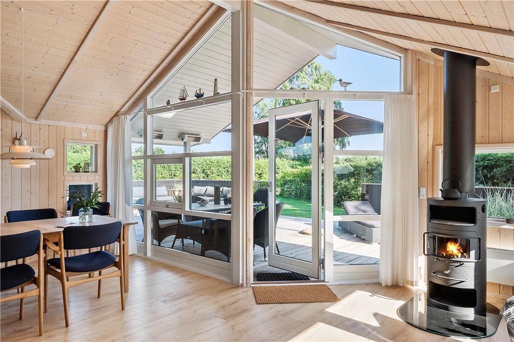 Wir freuen uns sehr darüber, Ihnen dieses helle, wunderschöne Ferienhaus mit hohen Decken und viel Platz für die Familie vorstellen zu dürfen. In der Grundstückseinfahrt können problemlos mehrere Fahrzeuge abgestellt werden. Sie können sogar bis zur Haustür vorfahren, was Ihnen das Entladen des Autos erleichtert. Das Herzstück des Hauses bildet der große, offene Küchen- und Essbereich, in dem Sie mit viel Platz verwöhnt werden und sicherlich zahllose gemütliche Stunden rund um den Esstisch genießen. Wenn Sie sich ein Stündchen vor dem Fernseher entspannen möchten, bietet sich hervorragend die gemütliche Schlafnische an. Der Fernseher empfängt sowohl dänische als auch deutsche Fernsehsender. Eine Internetverbindung ist selbstverständlich ebenfalls vorhanden. Die Schlafplätze verteilen sich auf insgesamt drei Schlafräume, von denen zwei mit je einem Doppelbett eingerichtet sind. Im dritten Schlafraum stehen zwei Einzelbetten für Sie bereit. Das ansprechend modernisierte Badezimmer beinhaltet neben einer Dusche auch eine Waschmaschine. Das wunderbare Urlaubsdomizil wird mittels Elektroheizungen, einer Wärmepumpe und eines gemütlichen Kaminofens beheizt.