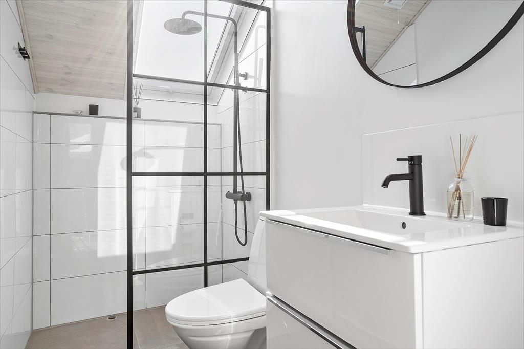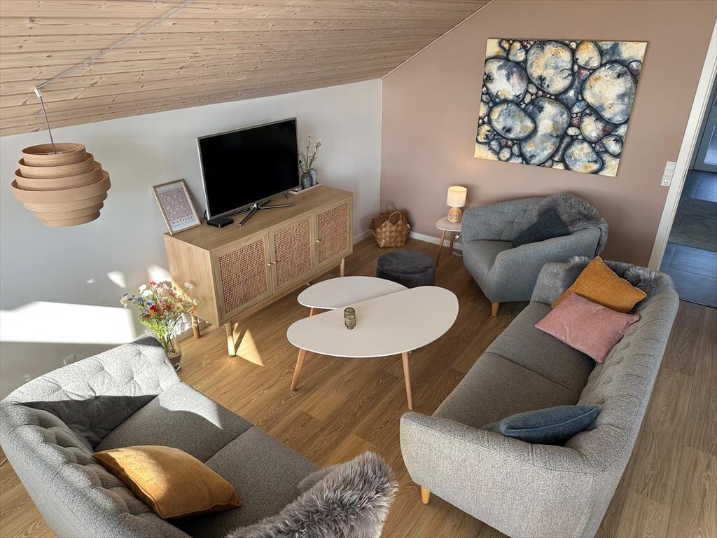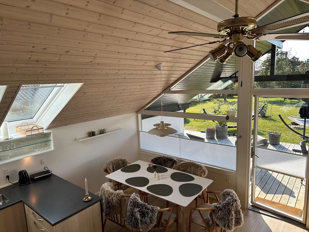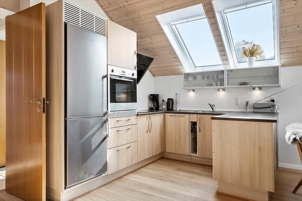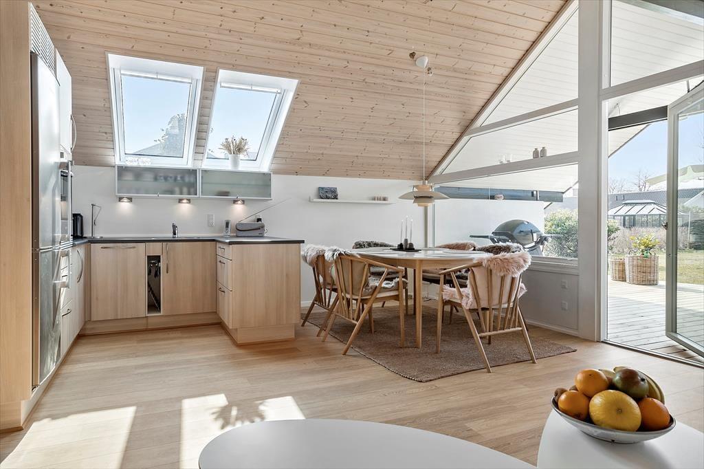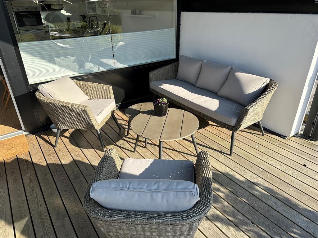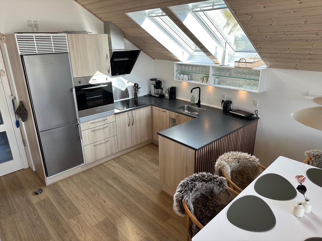 In der offenen Küche finden Sie alles, was Sie für die Zubereitung köstlicher Urlaubsmahlzeiten benötigen. Von der Küche haben Sie direkten Zugang zum guten Essplatz und zum attraktiven Wohnraum. Falls sich das Wetter einmal nicht von seiner schönsten Seite präsentieren sollte, machen Sie es sich einfach in der Sofagruppe vor dem TV gemütlich. Dieser sorgt mit dänischen, deutschen, schwedischen und norwegischen Sendern sowie mit Chromecast für Unterhaltung und Abwechslung. Kostenlos nutzbares Internet mit einer Geschwindigkeit von 50/50 Mbit steht ebenfalls zu Ihrer Verfügung. Der Wohnraum bietet sich ganz hervorragend zum gemeinsamen Spielen von Brettspielen, zum entspannten Lesen und zum Genießen von viel wertvoller gemeinsamer Zeit an.