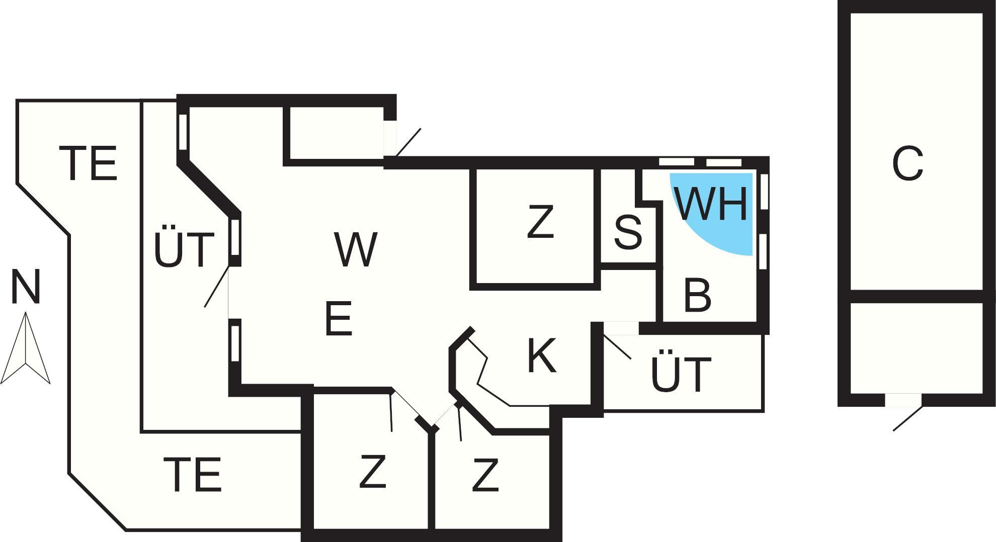 Bad: WC, Waschb., Dusche, Fußbodenheiz.
