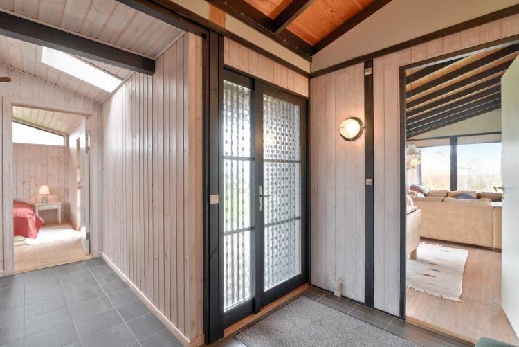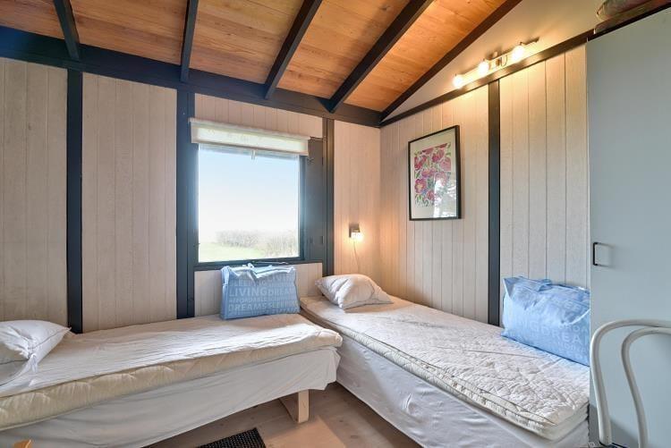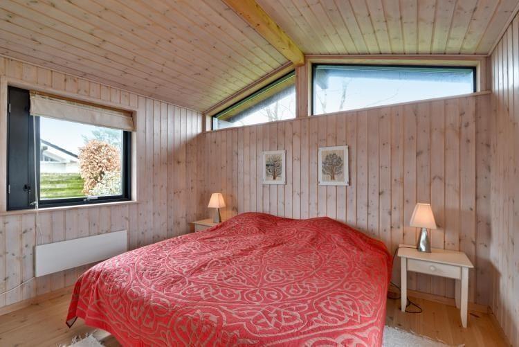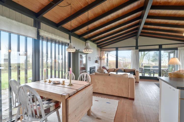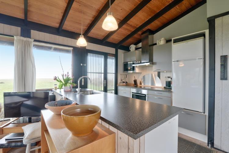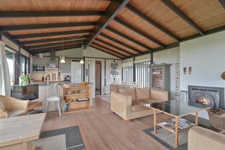 Das gemütliche Ferienhaus verfügt über eine Küche mit einem direkten Ausgang auf die Terrasse. Die Küche fügt sich offen in den Wohn- und Essbereich ein. Für behagliche Temperaturen sorgen ein Kaminofen und eine energiesparende Wärmepumpe. Die Schlafplätze verteilen sich auf einen Schlafraum mit zwei Einzelbetten, einen Schlafraum mit einem Doppelbett und einen Schlafraum mit einem Etagenbett. Das Badezimmer verwöhnt mit einer Fußbodenheizung.