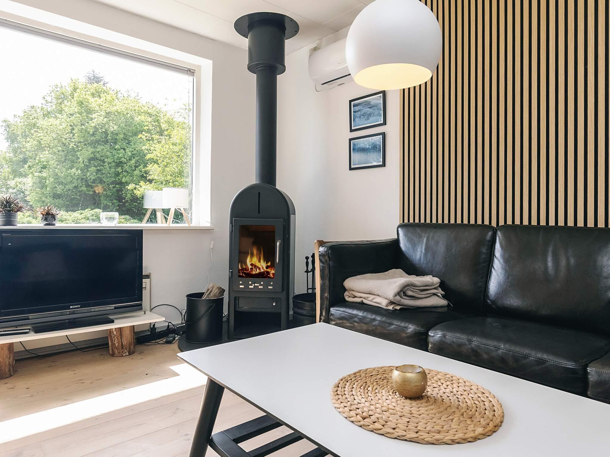 Im Inneren erwartet Sie ein gemütliches Wohnzimmer mit Holzofen und TV – hier kommt echte Ferienatmosphäre auf. Die offene Küche ist direkt mit dem Wohnbereich verbunden und komplett ausgestattet: Elektroherd, Kühl-Gefrierkombination, separate Gefriertruhe (1–59 Liter), Mikrowelle, Kaffeemaschine und Geschirrspüler – alles, was Sie zum Kochen im Urlaub brauchen.