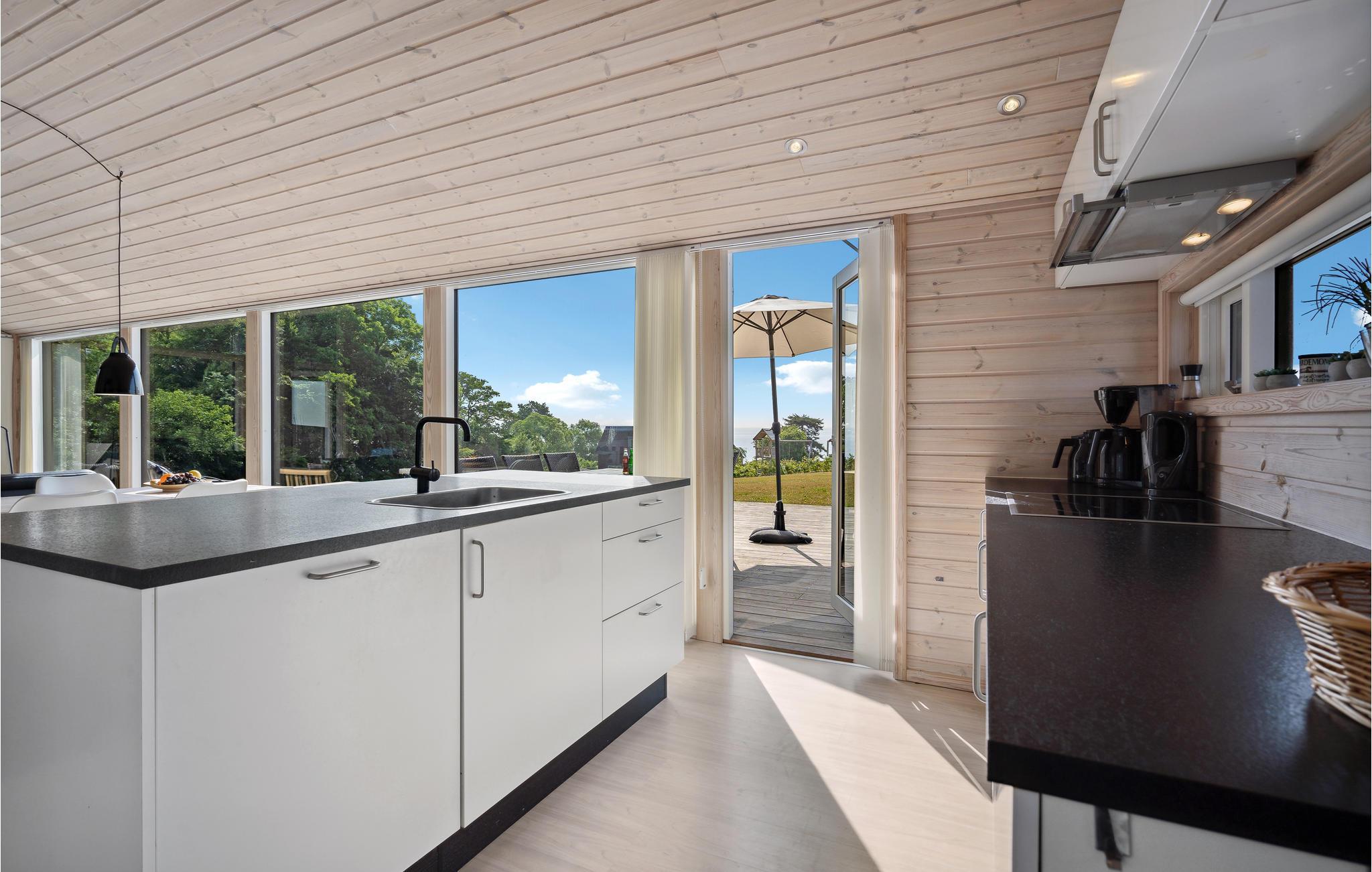 Die große Küche ist offen mit dem Wohnzimmer verbunden, das ein natürlicher Versammlungspunkt der Familie ist, und wo Sie auch bei einem Regentag einen schönen Urlaub verbringen können. Die großen Fenster sorgen für herrliches Licht und auch eine hervorragende Aussicht auf die Umgebung.