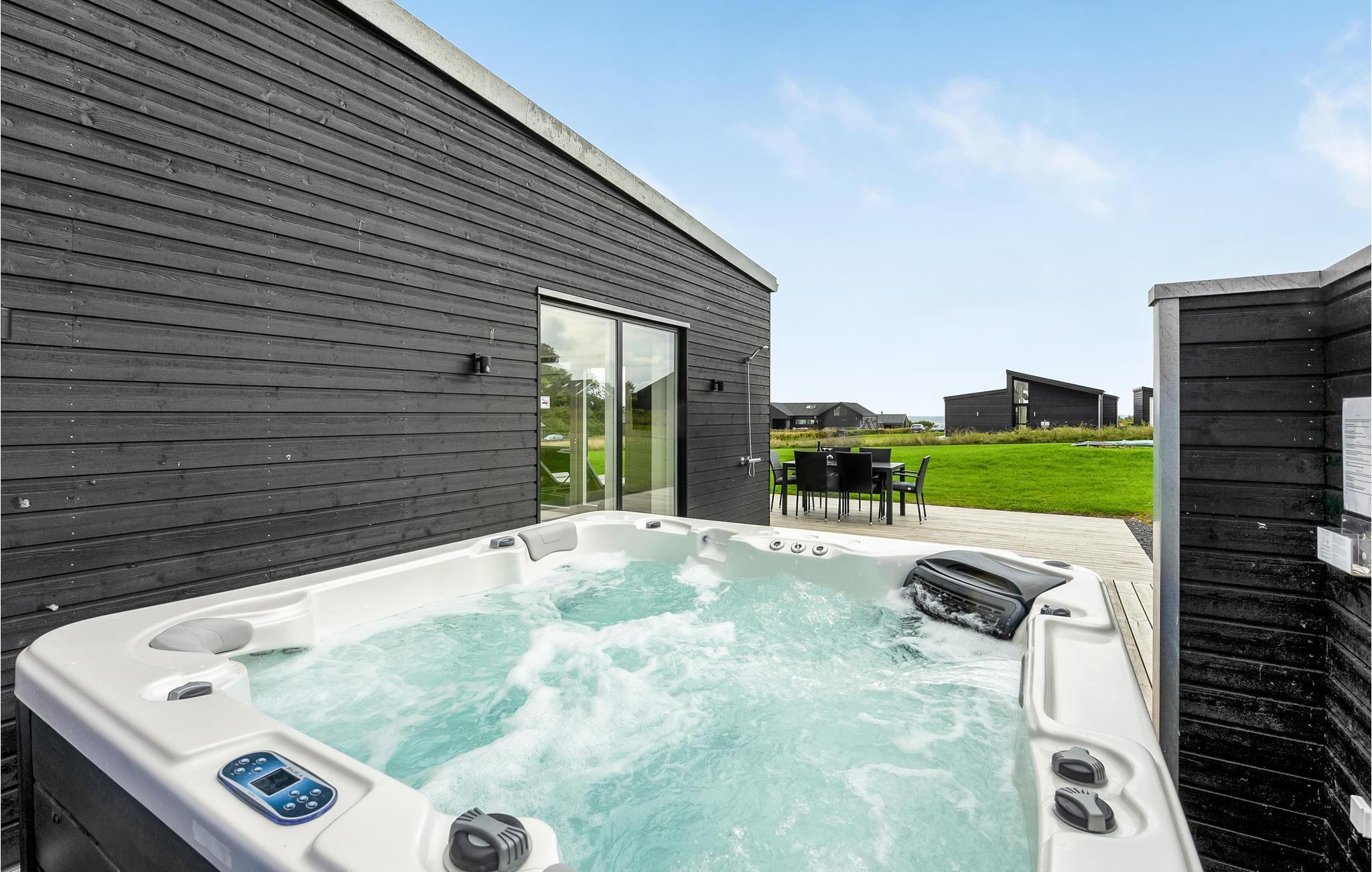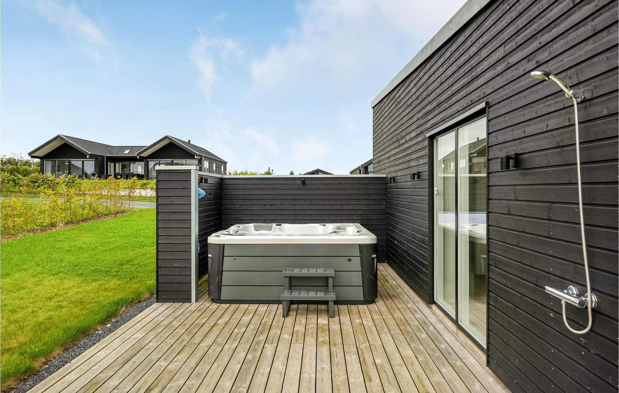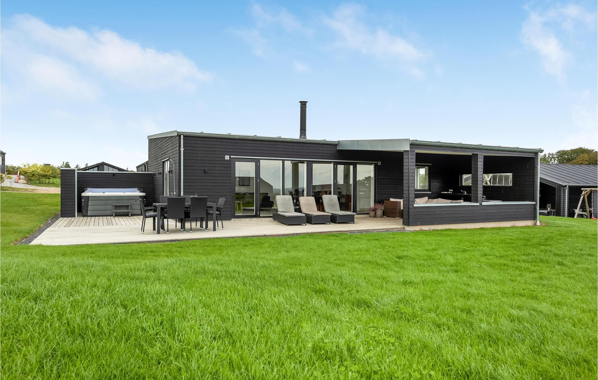 Modernes Ferienhaus in Haderslev mit Outdoor-Whirlpool, großer Terrasse und Meerblick, ideal für Wellness und Naturerlebnis.