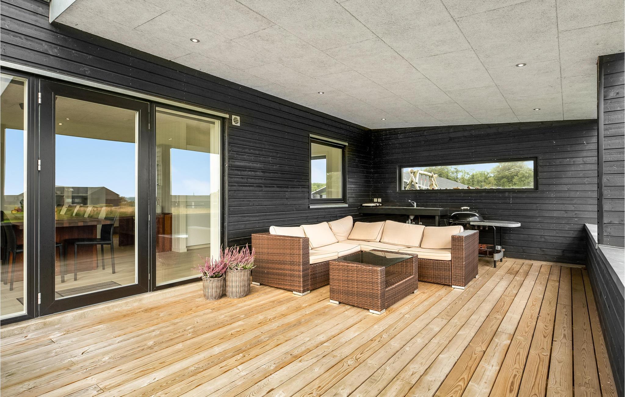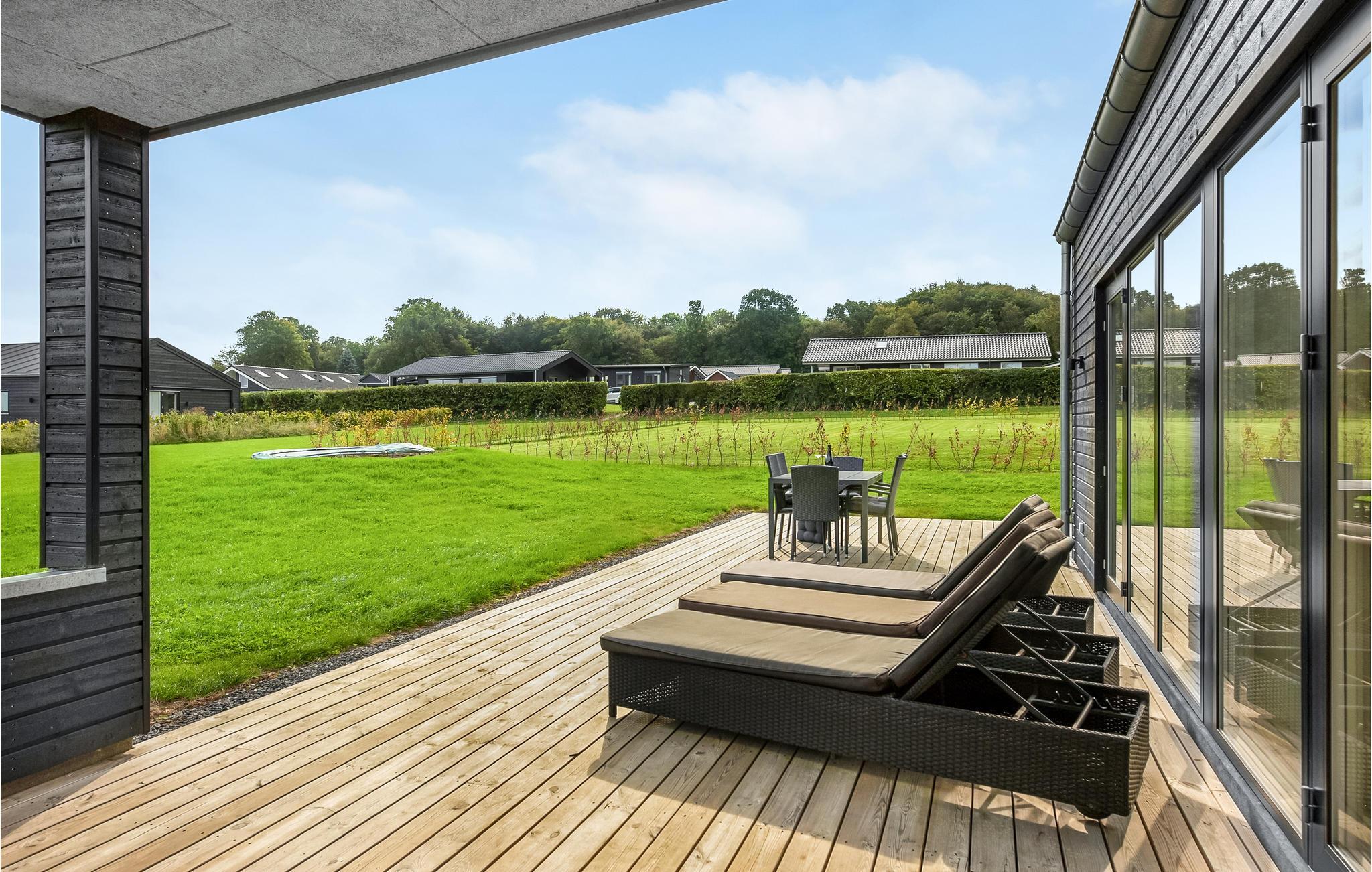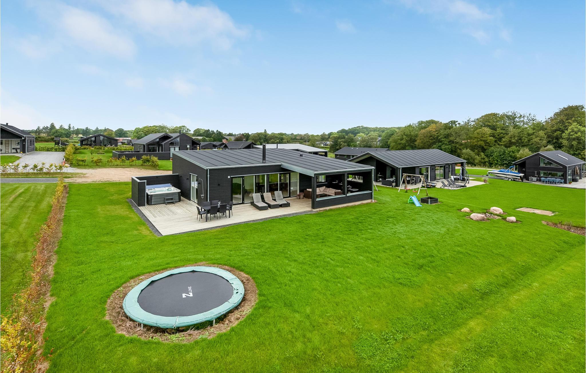 Modernes Ferienhaus in Haderslev mit Outdoor-Whirlpool, großer Terrasse und Meerblick, ideal für Wellness und Naturerlebnis.