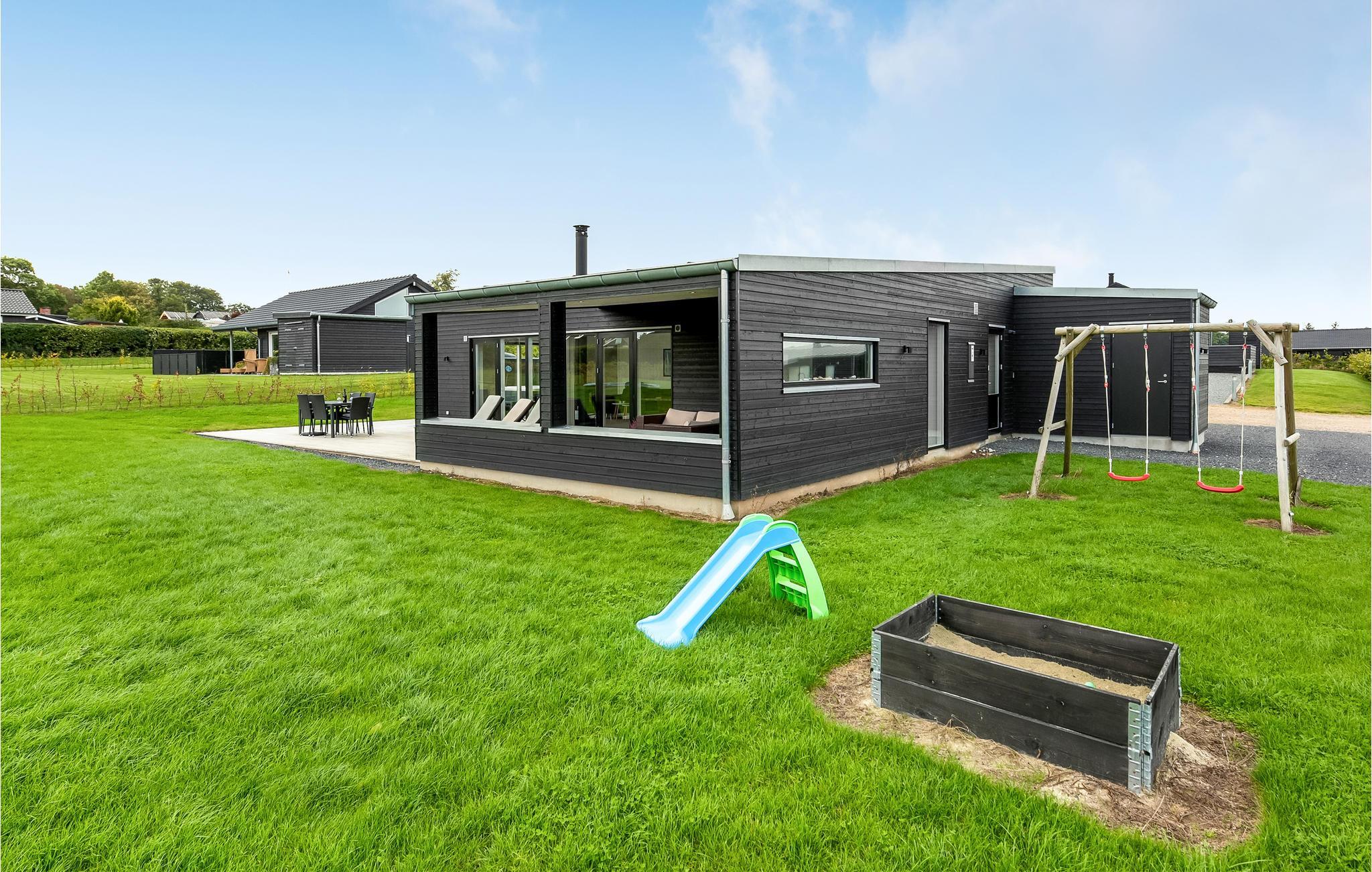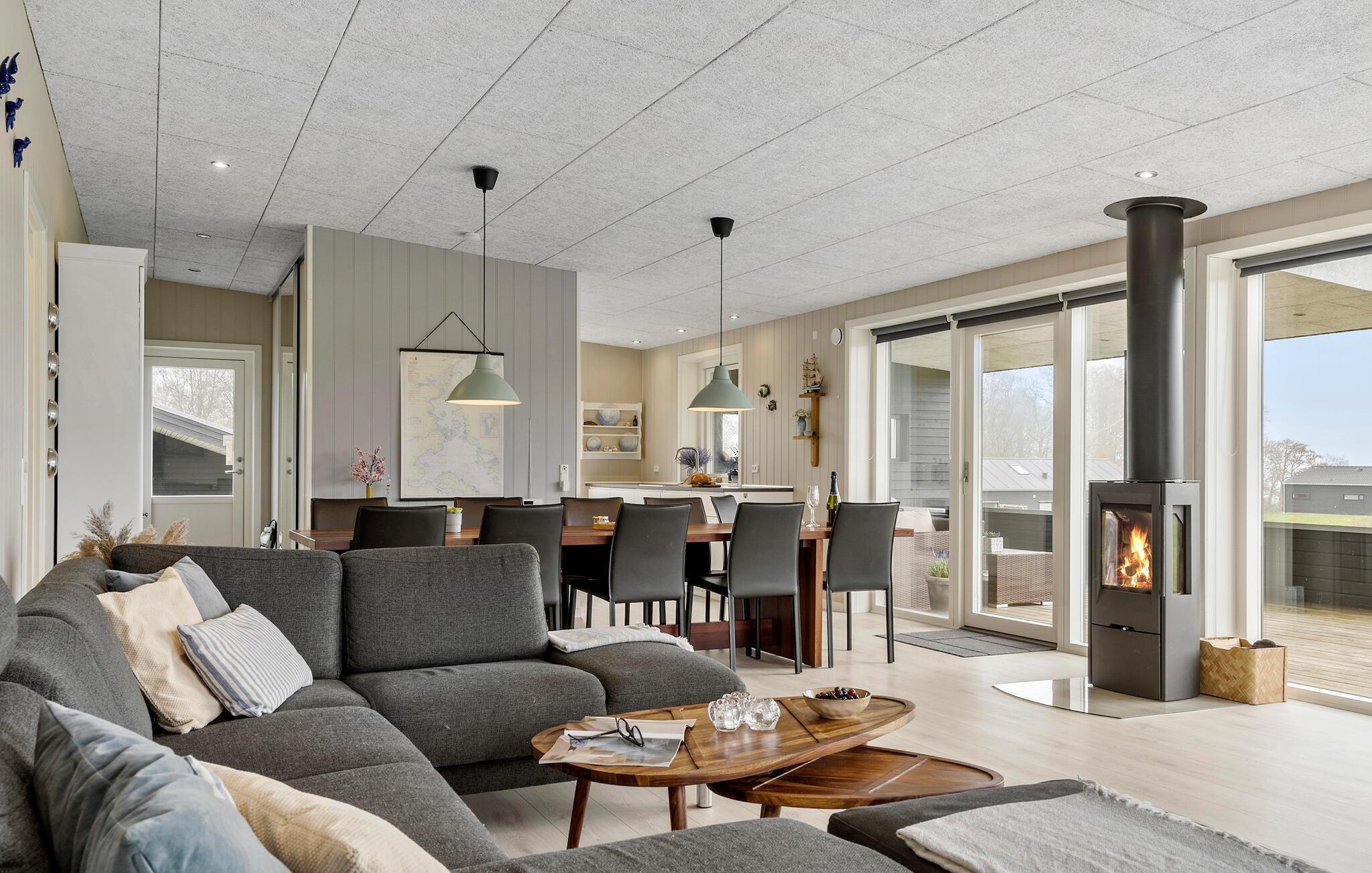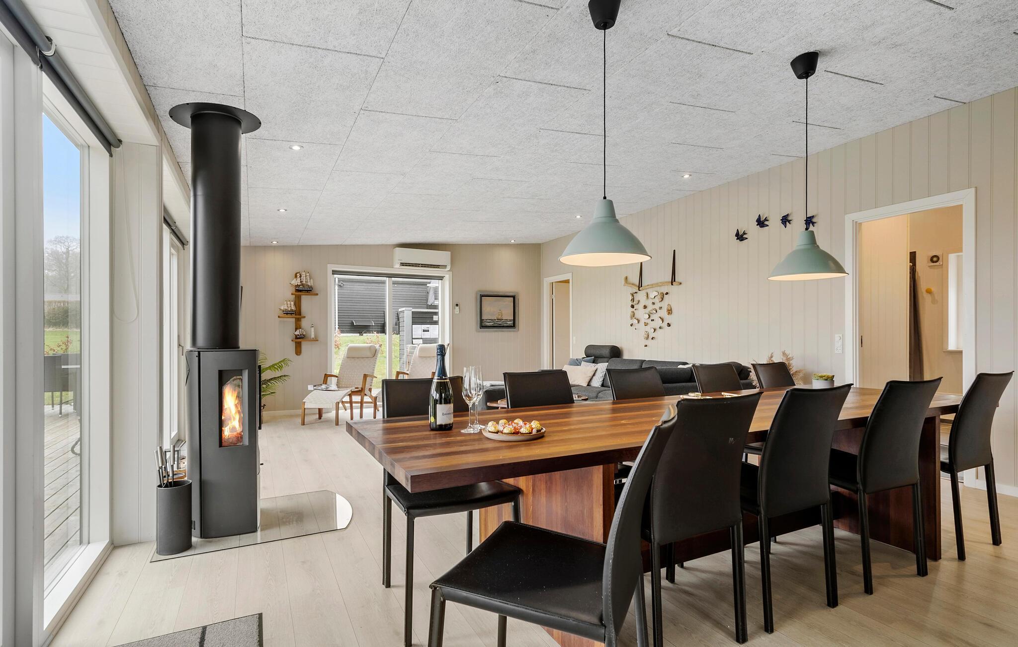 Attraktives Ferienhaus mit Outdoor Wellness, nah am Kleinen Belt und dem Wald. Das Ferienhaus hat eine schöne große Terrasse, davon sind 24 m² überdacht und nicht einsehbar, dort können Sie die herrliche Außenküche nutzen. Von der Terrasse mit schönen Gartenmöbeln können Sie direkt hinunter in den herrlichen Außenwhirlpool gehen und das ganze Jahr über Wellness genießen, egal, wie das Wetter ist; ein wunderbarer Luxus, der den Urlaub perfekt macht. Genießen Sie den Sommer in den guten Gartenmöbeln, u.a. Liegestühle. Die große Wohnküche ist das Zentrum des Hauses, hier lassen sich auch Tage mit weniger gutem Wetter gemütlich verbringen. Die großen Fenster in Wonzimmer und Küche lassen viel Licht herein und bieten eine schöne Aussicht über die Gegend und das Wasser im Kleinen Belt, die Sie auch von der überdachten Terrasse und aus dem Whirlpool genießen. Das Haus ist aus Qualitätsmaterialien und mit Fokus auf Energieersparnisse erbaut, unter anderem gibt es eine Wärmepumpe.