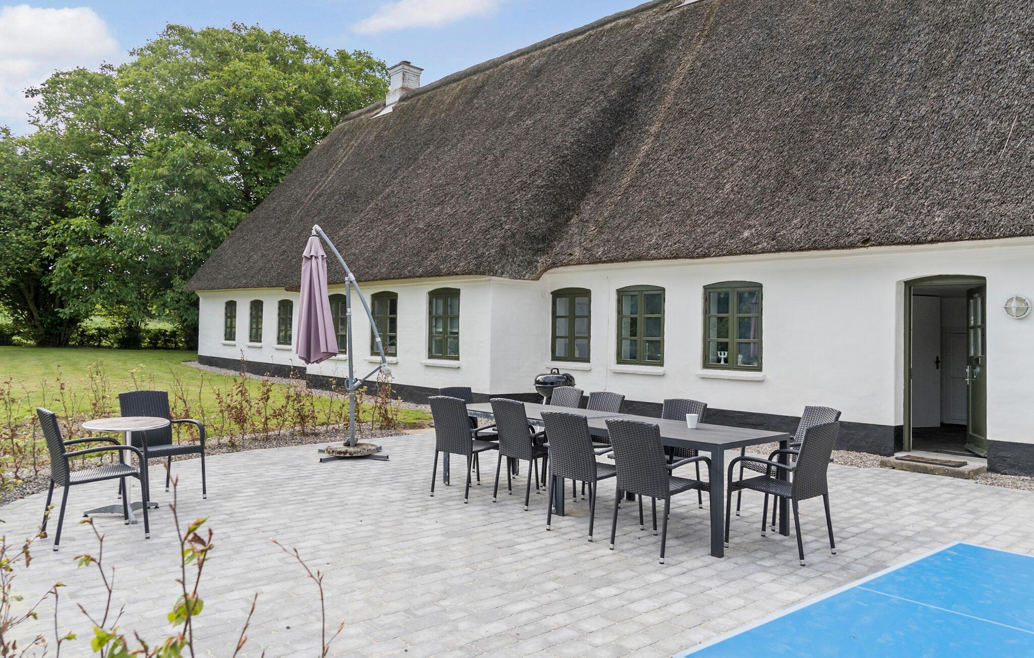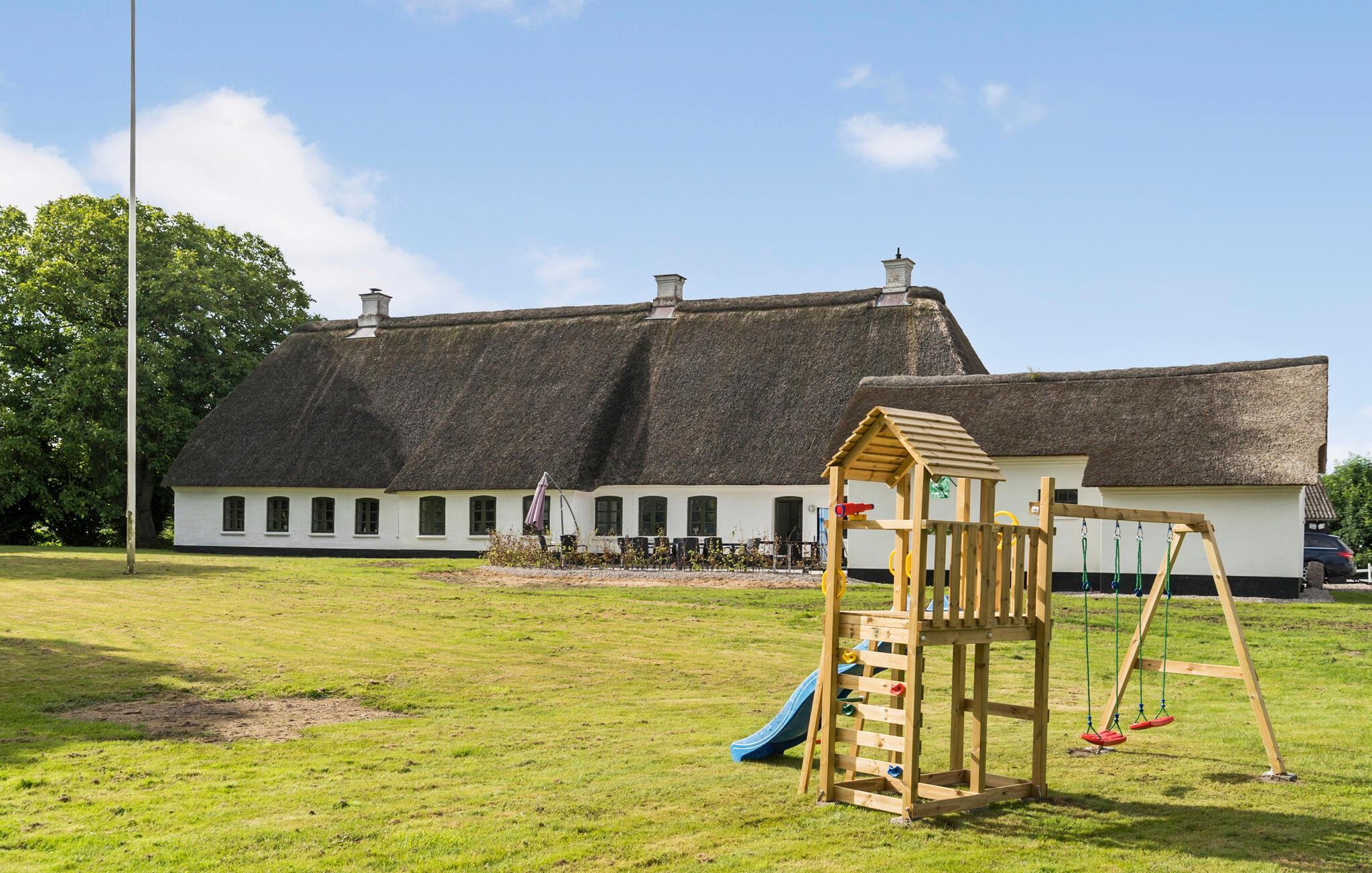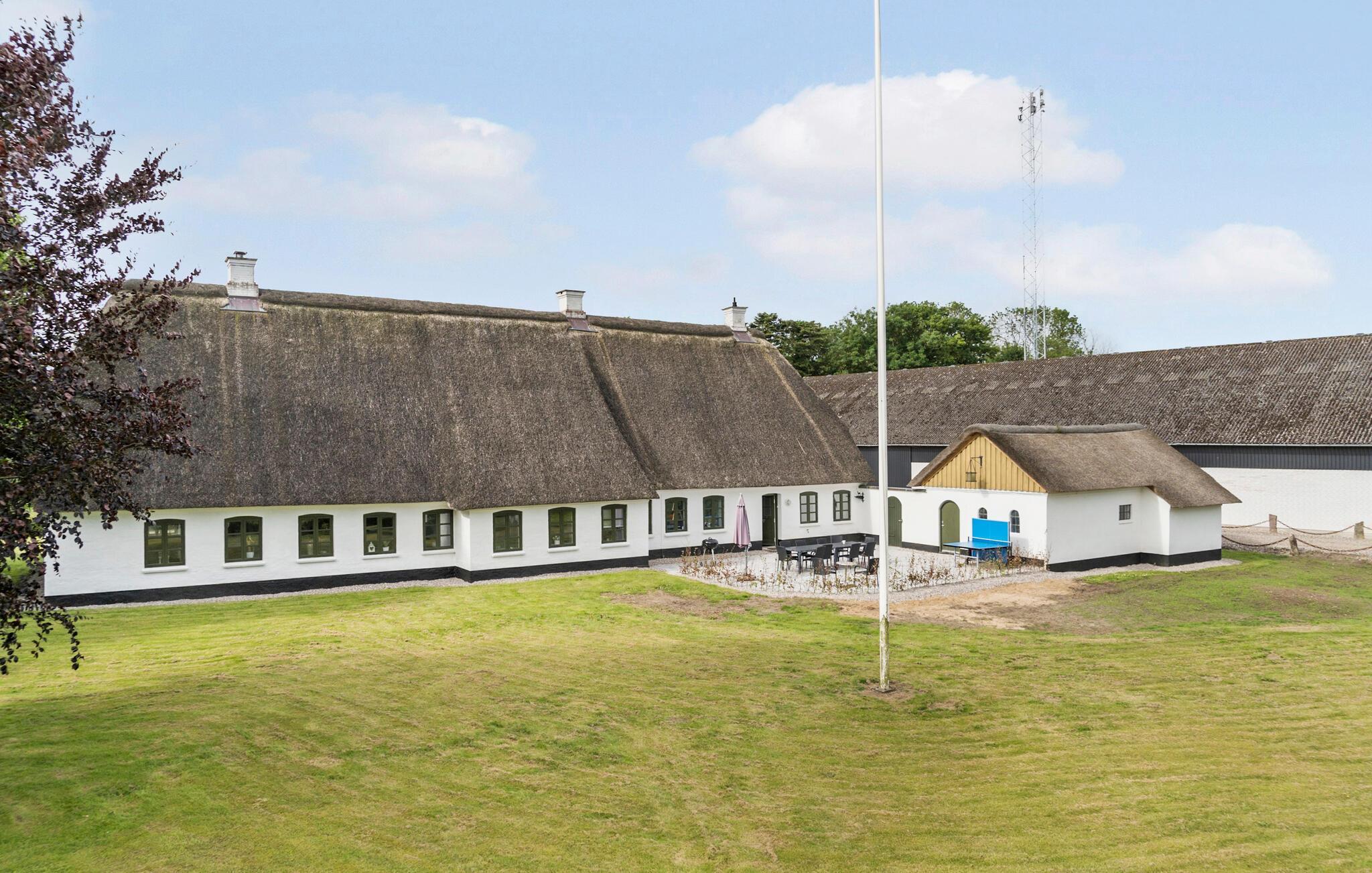 Ehemaliger Bauernhof mit Reetdach am Kelstrup Strand, ideal für Familienfeste und Aktivitäten in idyllischer Natur.