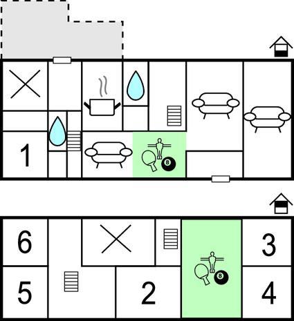 Den ersten Stock erreichen Sie über zwei Treppen, von denen die Eine steil ist. Oben gibt es zwei Bereiche mit jeweils zwei und drei Schlafzimmern. Außerdem liegt im 1. Stock ein weiterer Aktivitätsraum, dieser mit Tischfußball.