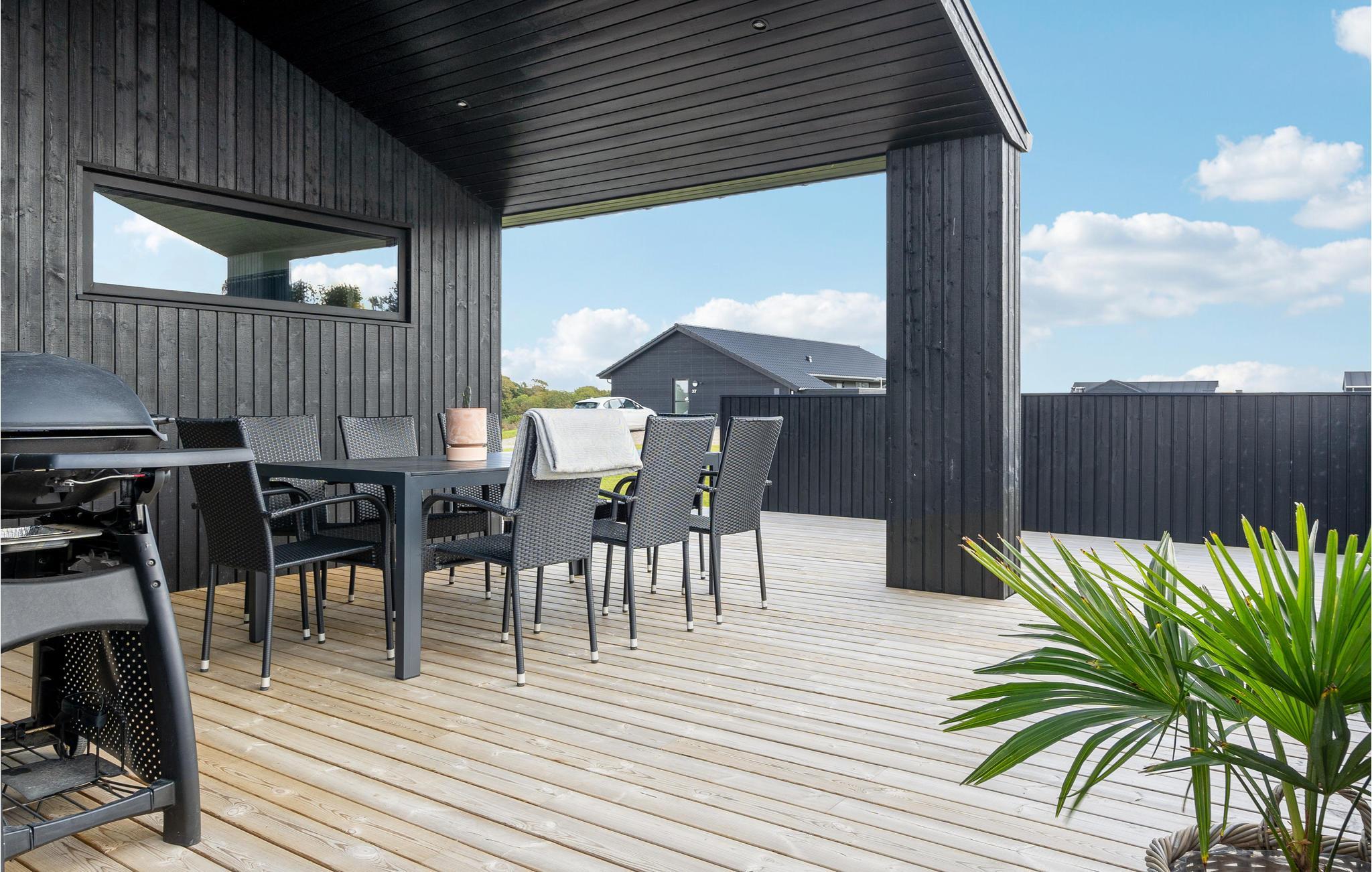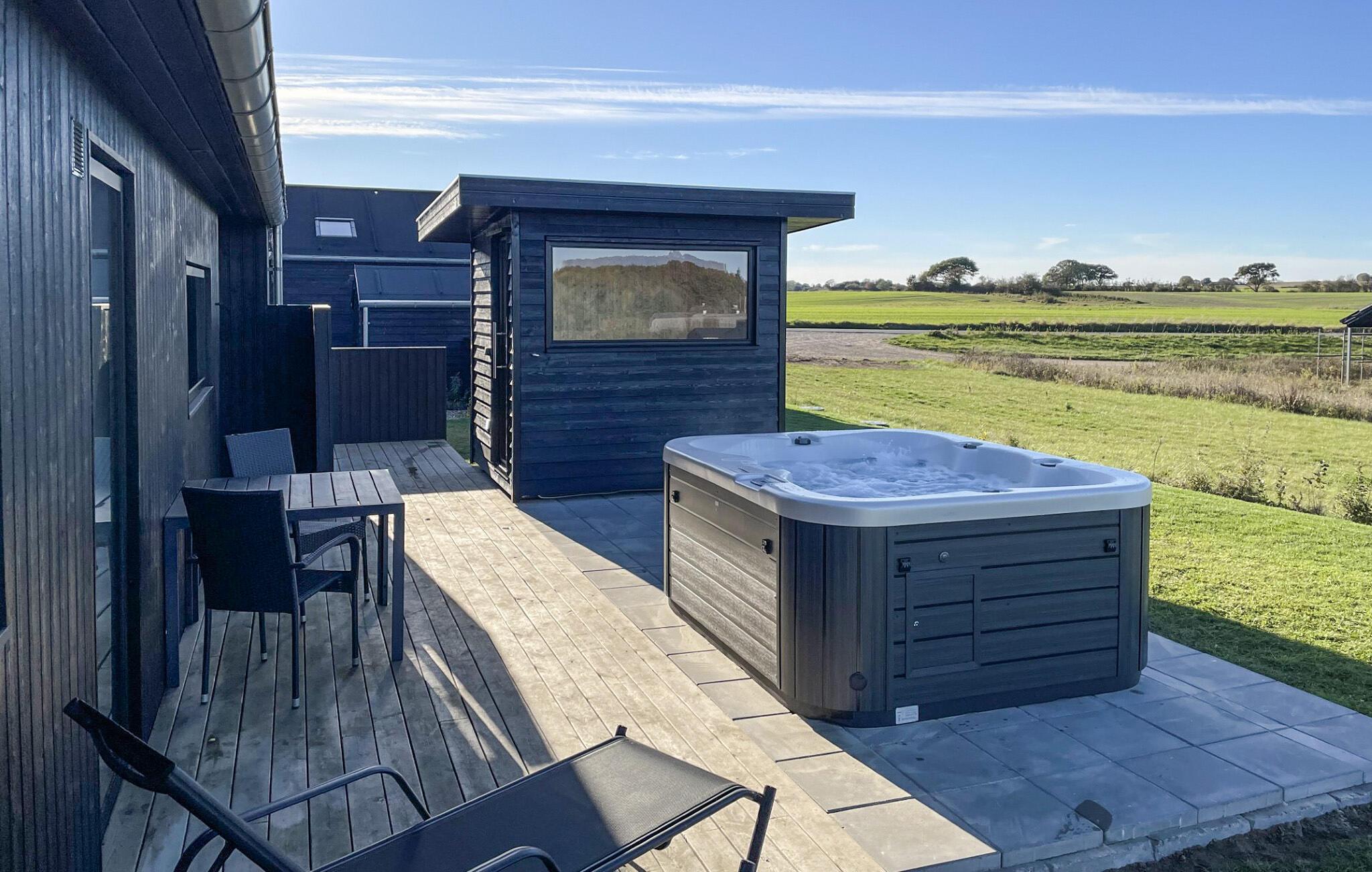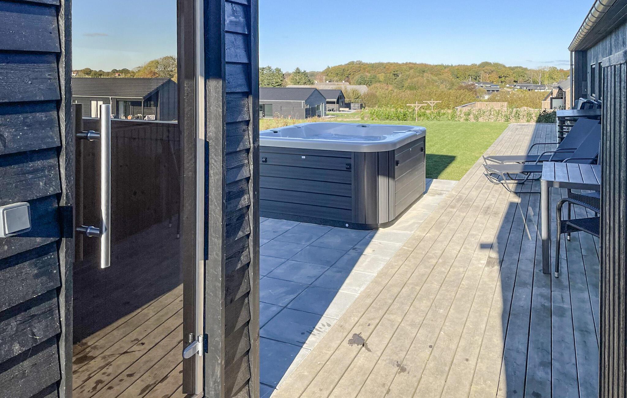 Genießen Sie Ihre Mahlzeiten in der Sonne auf der Terrasse und lassen die Abende bei gegrilltem und einem kühlen Getränk ausklingen. Oder spielen Sie mit Ihren Kindern Fußball oder Kubb. Auf der Rückseite des Hauses befindet sich ein Wellnessbereich mit Außendusche, Außensauna und Whirlpool.