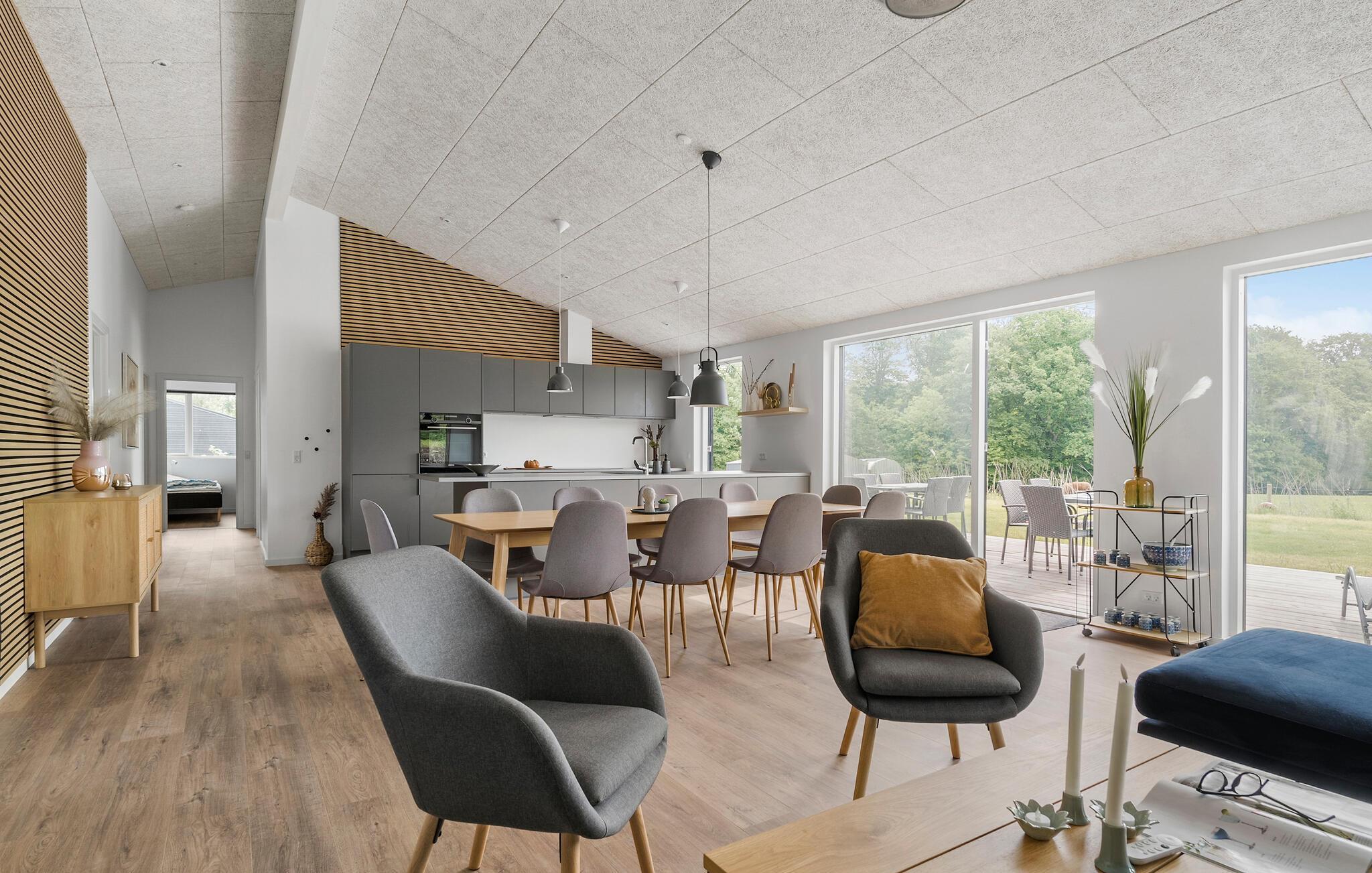 Ihr Ferienhaus im Süden Dänemarks an der Sandvig Bucht ist der ideale Ort für einen erholsamen Urlaub. Das moderne Design und die stilvolle Einrichtung schaffen eine gemütliche und einladende Atmosphäre. Starten Sie Ihren Tag mit dem Zubereiten des Frühstücks in der offenen Küche. Am großen Esstisch können Sie gemeinsam mit Ihrer Familie die Mahlzeiten des Tages und die Aussicht durch die großen Fenster genießen. Im Wohnbereich lädt das gemütliche Sofa zu entspannten Abenden ein, während Sie sich bei einem guten Buch oder einem Film erholen.